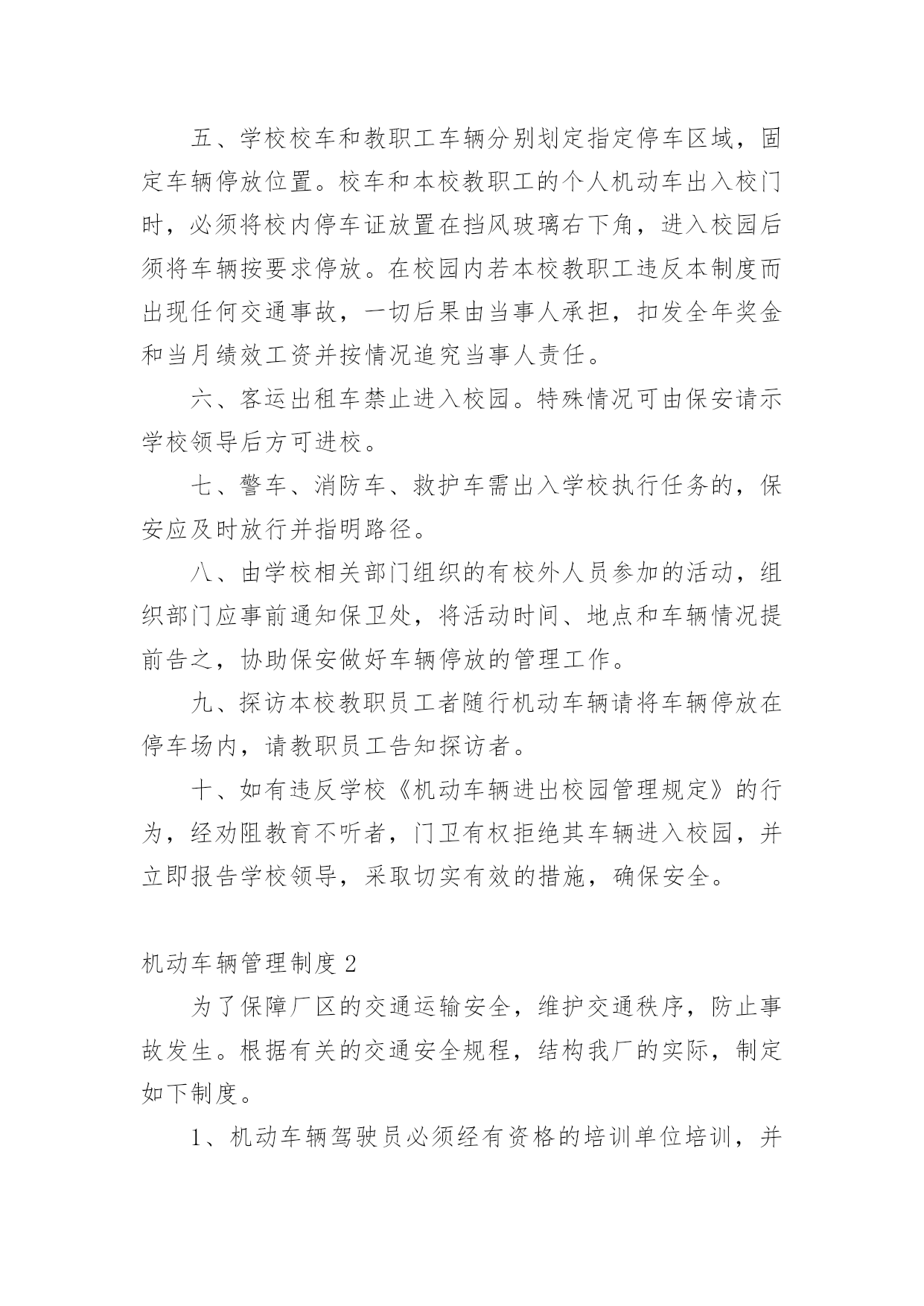 机动车辆管理制度在现实社会中,制度使用的频率越来越高,制度是国家法律、法令、政策的具体化,是人们行动的准则和依据。我们该怎么拟定制度呢?下面是小编帮大家整理的机动车辆管理制度,仅供参考,希望能够帮助到大家。机动车辆管理制度1为加强机动车辆进出校园的管理,确保师生的生命安全,特制定学校机动车车辆进出校园管理制度。一、除学校公车、上级有关单位机动车辆和本校教职员工私人车辆外,其他机动车辆非必需不得进入校园停放。二、外来机动车辆(非校内人员使用的车辆),未经学校领导允许不得入校。三、任何机动车辆进入校园后,必须