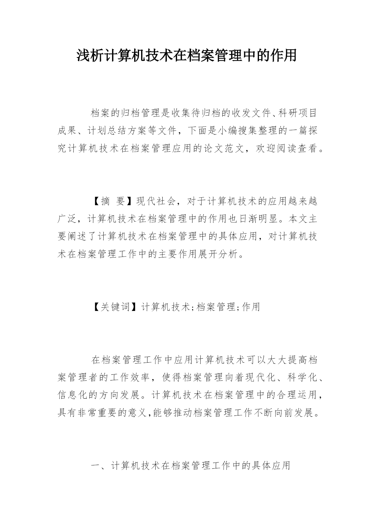 浅析计算机技术在档案管理中的作用档案的归档管理是收集待归档的收发文件、科研项目成果、计划总结方案等文件,下面是小编搜集整理的一篇探究计算机技术在档案管理应用的论文范文,欢迎阅读查看。【摘要】现代社会,对于计算机技术的应用越来越广泛,计算机技术在档案管理中的作用也日渐明显。本文主要阐述了计算机技术在档案管理中的具体应用,对计算机技术在档案管理工作中的主要作用展开分析。【关键词】计算机技术;档案管理;作用在档案管理工作中应用计算机技术可以大大提高档案管理者的工作效率,使得档案管理向着现代化、科学化、信息化的方