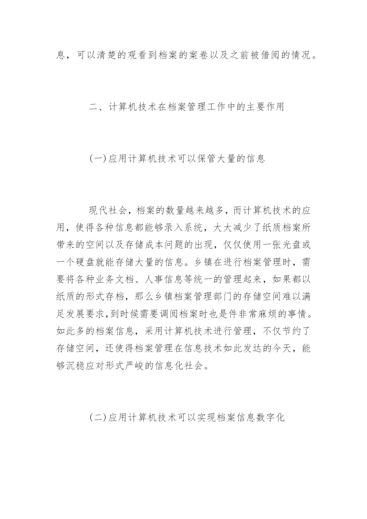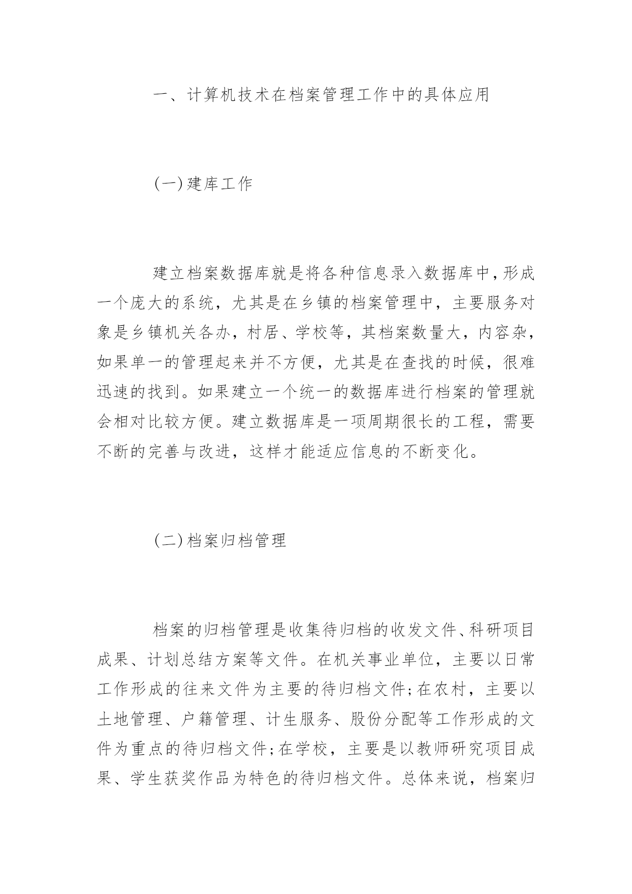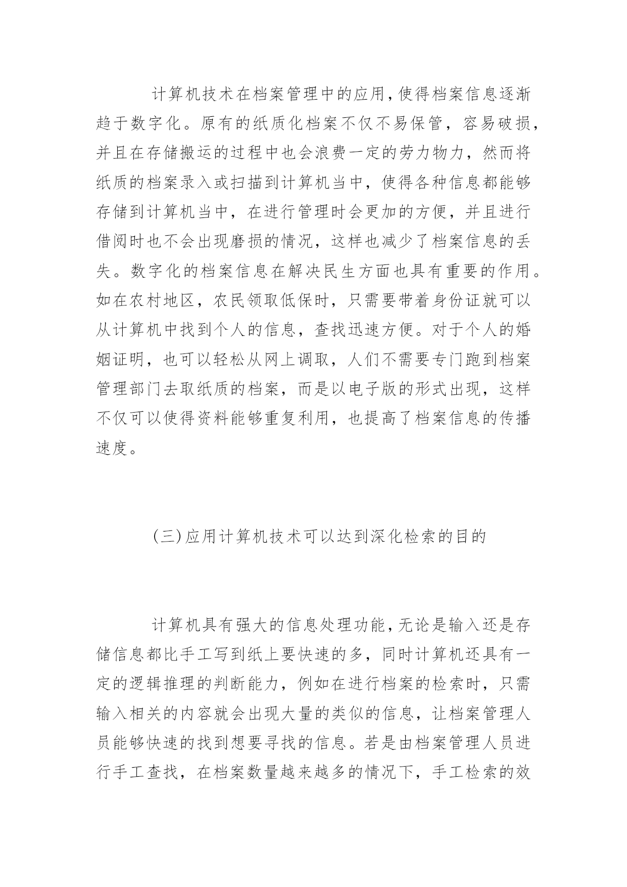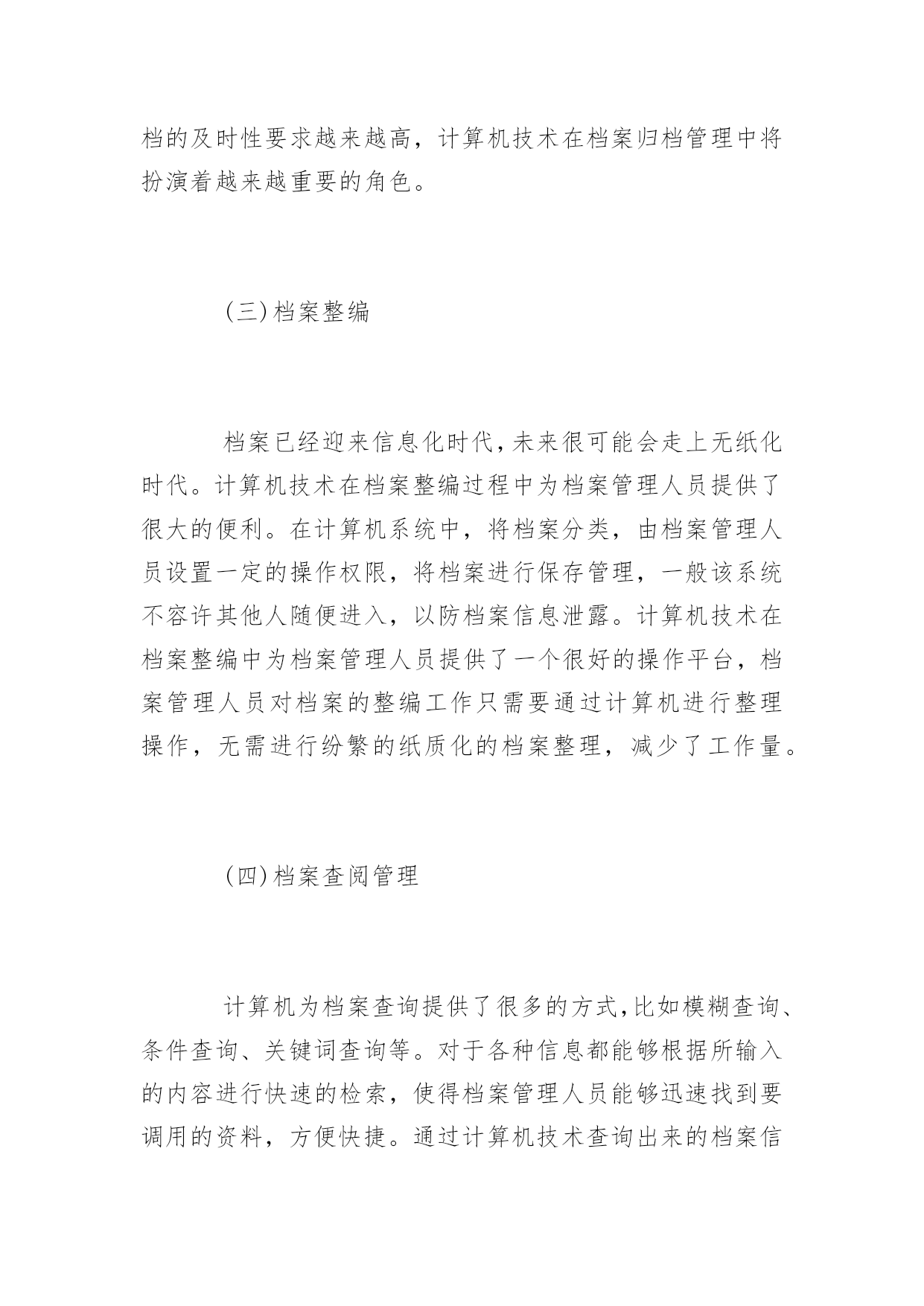 浅析计算机技术在档案管理中的应用随着全球化进程的不断加快,计算机技术逐渐被应用于各个领域,以下是小编搜集整理的一篇探究计算机技术在档案管理应用的论文范文,供大家阅读参考。【摘要】随着社会的不断发展,管理模式的不断变化,档案的管理有了日新月异的变化,计算机在档案管理中的应用将一改传统管理的种种弊端,延长了档案保管的年限,大大提高了档案管理水平及工作效率,并能充分挖掘档案的潜在价值,使档案信息资源能尽快地、最大限度地转化为生产力,联合行动营造出可观的经济效益和社会效益。有效发挥了计算机技术的重要性。【关键词】