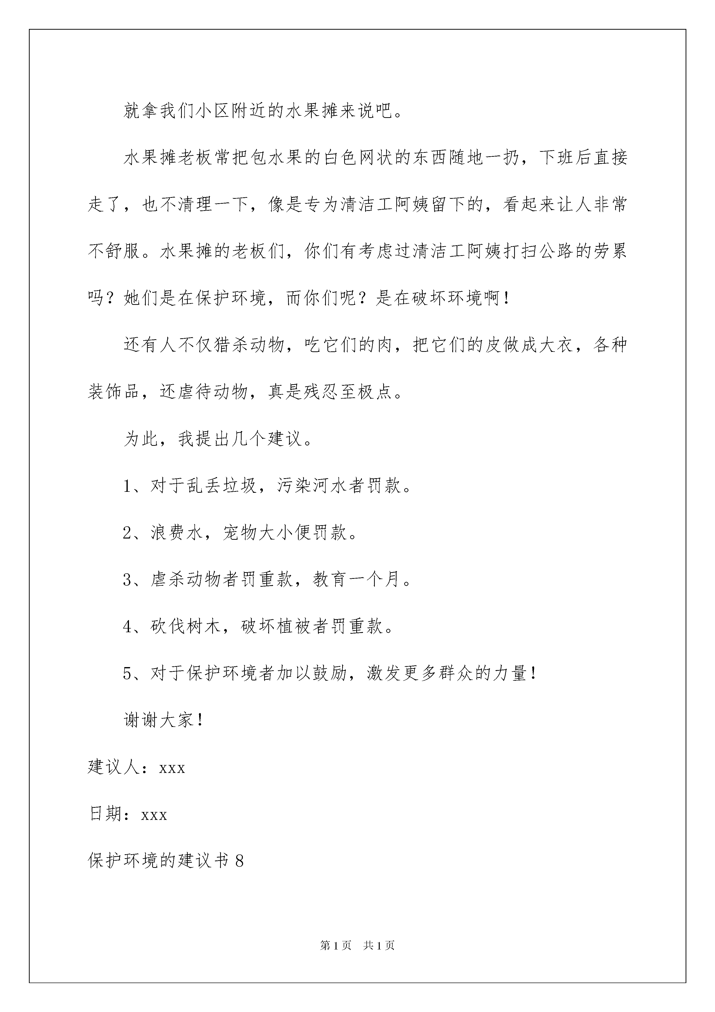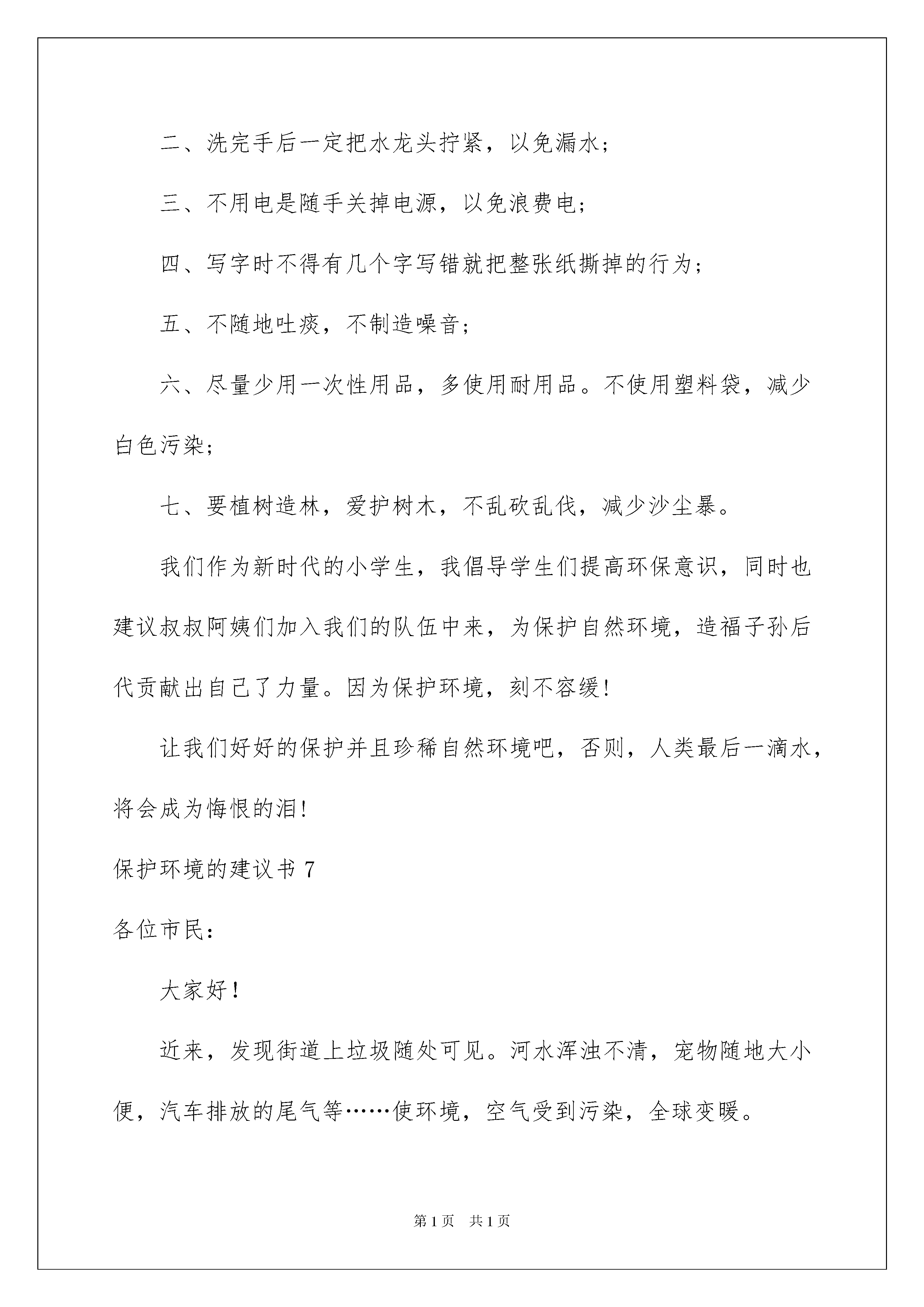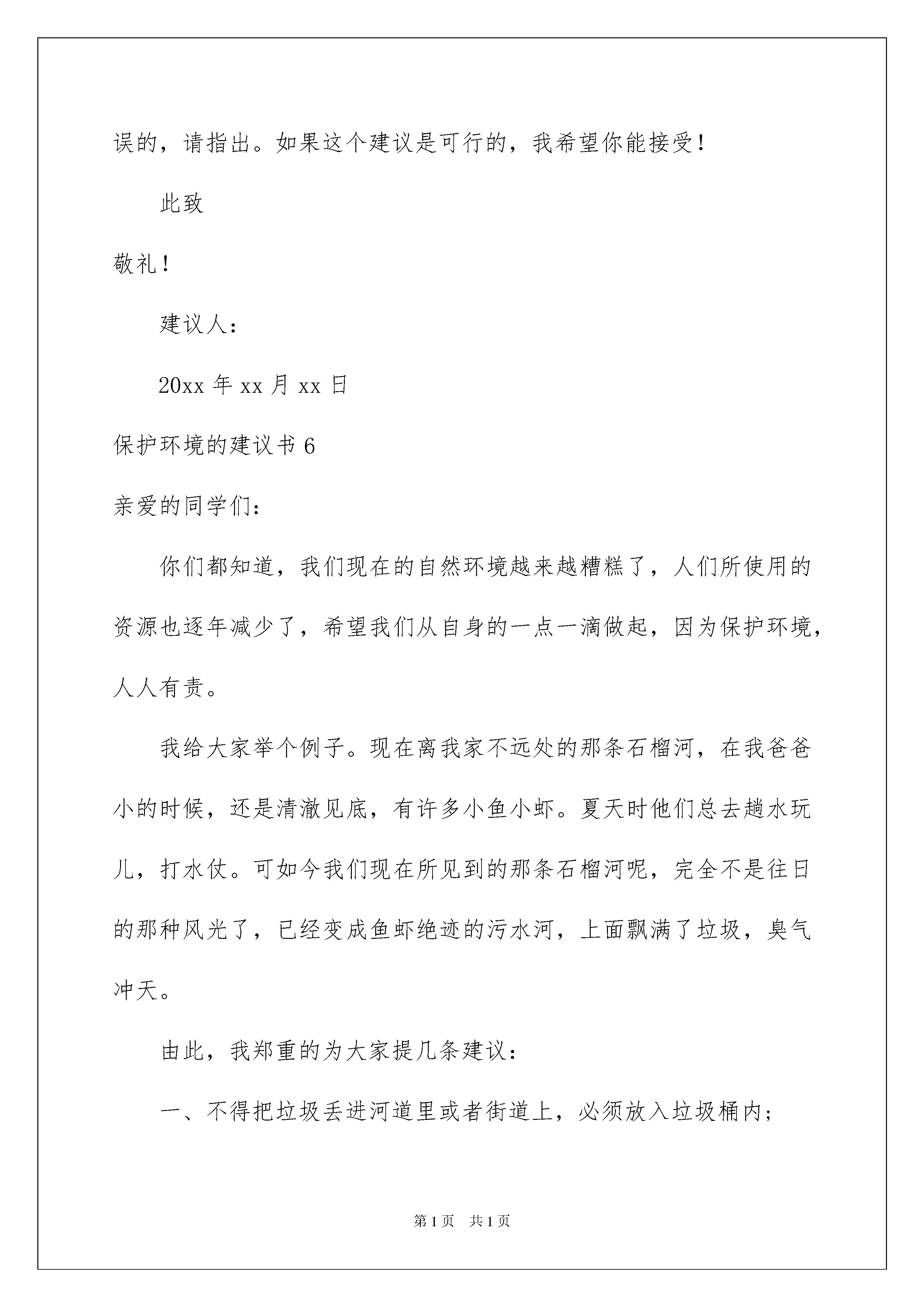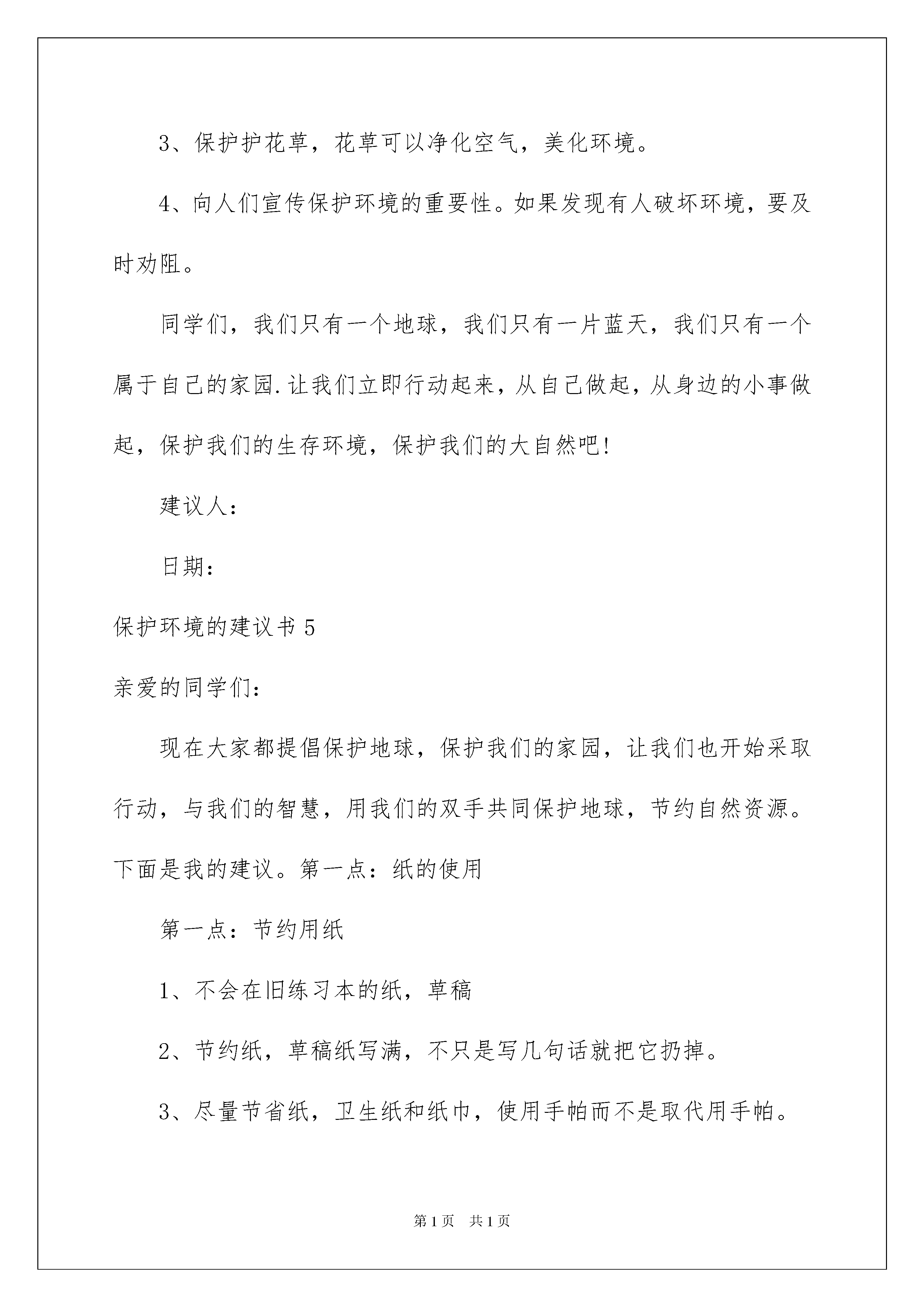 2022保护环境的建议书(汇编15篇)保护环境的建议书(汇编15篇)随着社会不断地进步,建议书的使用越来越广泛,建议书是就某项工作提出某种建议时使用的一种常用书信,要求具体明确,有针对性。你所见过的建议书是什么样的呢?以下是我收集整理的保护环境的建议书,仅供参考,希望能够帮助到大家。保护环境的建议书1食品小区的所有居民们:小区是我们共同居住的地方,也是一个对于我们来说很重要的地方。然而,我们现在居住的这个小区的破坏和污染,却惨不忍睹。在我们居住的这个小区里,虽然有垃圾桶,但是有很多人却不把垃圾扔在垃圾桶里,而是把垃圾扔在一个死角里,慢慢地,慢慢地,垃圾多得堆成了山,害得小区里臭气熏天;还有小区的墙面上,也十分杂乱;在墙上,由许许多多的广告纸,用粉笔画的图画和一些被撕成碎片的贴纸每天,如果刮大风的话,有的广告纸就会飞到空中;还有小区地面上的垃圾,也是各种各样、数不胜数,有纸屑、果皮,甚至还会有一些破鞋子,烂衣服使我们小区好像变成了垃圾场。所以我提出了以下几点:1、我们可以在垃圾桶的旁边和上面粘贴一些保护环境的标语,如:保护环境,人人有责提醒人们把垃圾扔进垃圾桶里。2、我们可以把墙上的广告纸涂画和贴纸一一清理掉,还可以让政府请人帮助把我们小区的墙面重新刷一次。再请人来监督我们不要在小区里的墙面上贴广告纸,否则要接受罚款。3、我们还可以请一些清洁工来帮我们清洁或打扫地面上的垃圾。或者还可以从我们自己开始,把垃圾捡起来,扔进相应的垃圾桶。或者也可以提倡人们打扫地面。居民们,让我们共同携手,来保护我们这个小区的环境吧!此致敬礼!姓名:日期:年月日保护环境的建议书2还未意识保护环境建设生态文明的人们:如今十分发达的地球,虽然环境情况看起来十分乐观,但是却有十分重大的隐患,大量的树木被砍伐来建立化工厂,化工厂的污水的有害气体从管子里排出,散发到天上,空气也遭受到破坏,而地面清澈的河水变成了黑色又恶心的污水。由此,我郑重严肃地向还未意识保护环境建设生态文明的人们提建议:1以节水为荣,随时关上水龙头,防止滴漏。以节约粮食为荣,尽量地把残留的食物吃完。2尽量少用一次性物品,多使用耐用品,自备购物袋或提篮,减少白色污染。3不乱丢垃圾和废物品,将垃圾分类投放,变费为宝,使资源循环再生,造福人类。4不猎杀珍惜动物和受以保护的动物,关爱与保护野生动植物;植树造林,爱护我们身边的每一朵花每一片草和树木。5不随地吐痰,不随地大小便,不在公共场所吸烟和不制造噪音。我倡导大家赶快行动起来提高保护环境建设生态文明的意识。为保护环境建设生态文明造福后代贡献自己的力量。因为,保护环境建设生态文明,刻不容缓!保护环境的建议书3亲爱的同学们:生活中,很多同学都有浪费资源的现象:水龙头不停地流出清澈的自来水,用水的人不知去向;开着电灯、电视的房间里却长时间空无一人;笔记本随手扔进垃圾桶,却只写了几个字……这些都是在生活中存在的问题。因此,我特意提出以下建议:在使用水时,要注意以下几点:洗完手立即关上水龙头;在拖地板时不要用太多水,拖完地板的水可以用来冲厕所;1、节约用水在使用水时,要注意以下几点:洗完手立即关上水龙头;在拖地板时不要用太多水,拖完地板的水可以用来冲厕所;2、爱护公物大家在用纸的时候不能浪费,没用完的纸张可以撕起来装订成草稿本。既环保又不浪费。3、节约用纸地球是我们的家园,是人类的摇篮。我们应该行动起来,珍惜资源、保护环境,共创美好家园!大家在用纸的时候不能浪费,没用完的纸张可以撕起来装订成草稿本。既环保又不浪费。地球是我们的家园,是人类的摇篮。我们应该行动起来,珍惜资源、保护环境,共创美好家园!建议人:时间保护环境的建议书4同学们:请问你们是否看到过,在一条干净的街道旁,睡着一团白纸:你们是否看到过,垃圾桶就在一旁,这里却有一堆垃圾.现在,我们的城市既然如此美丽,我们为什么要破坏环境?在此,我向同学们提出以下几点建议:1、不乱扔垃圾,不随地吐痰。乱扔垃圾、随地吐痰不仅影响市容,还污染环境。2、不乱砍滥伐,即使需要树木,伐过树后,也要植树,那样,才能使生态平衡。3、保护护花草,花草可以净化空气,美化环境。4、向人们宣传保护环境的重要性。如果发现有人破坏环境,要及时劝阻。同学们,我们只有一个地球,我们只有一片蓝天,我们只有一个属于自己的家园.让我们立即行动起来,从自己做起,从身边的小事做起,保护我们的生存环境,保护我们的大自然吧!建议人:日期:保护环境的建议书5亲爱的同学们:现在大家都提倡保护地球,保护我们的家园,让我们也开始采取行动,与我们的智慧,用我们的双手共同保护地球,节约自然资源。下面是我的建议。第