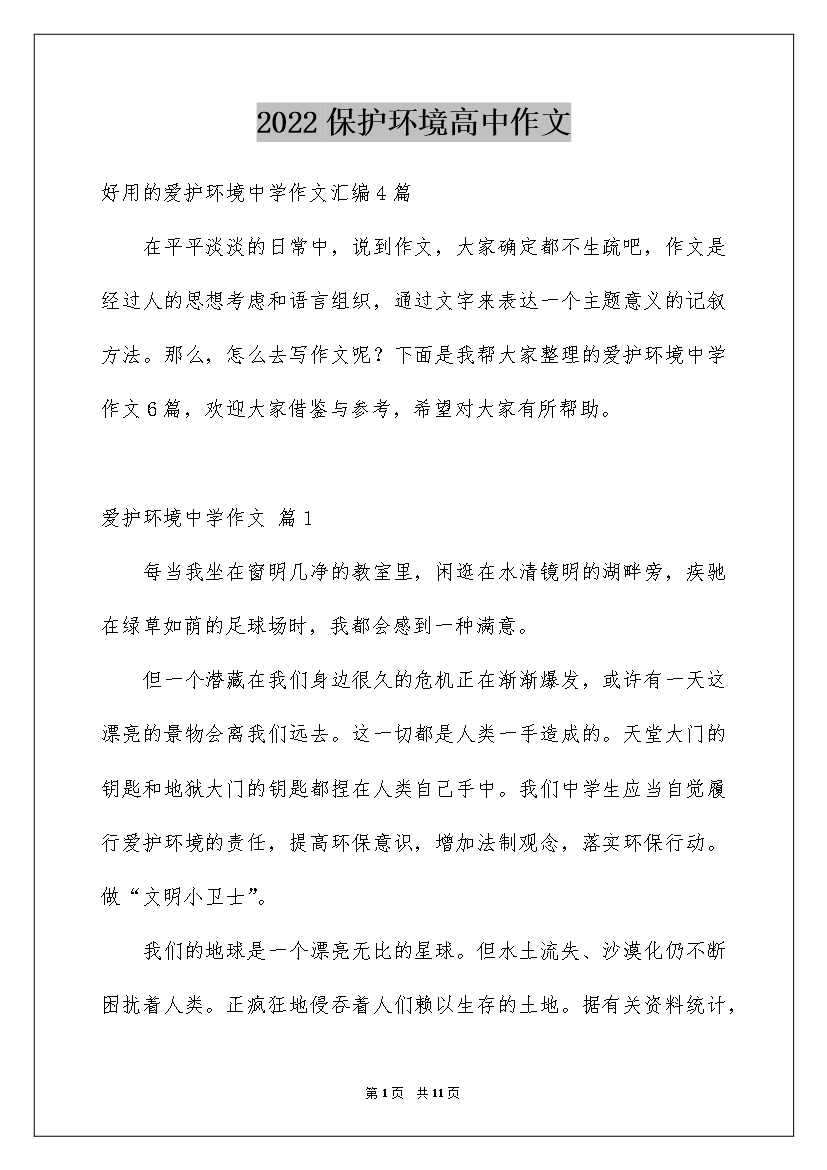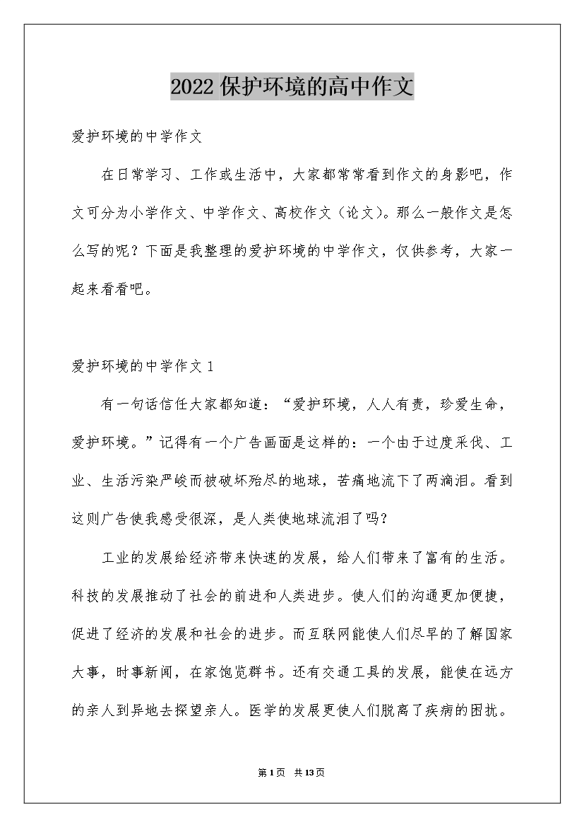 2022保护环境的高中作文爱护环境的中学作文在日常学习、工作或生活中,大家都常常看到作文的身影吧,作文可分为小学作文、中学作文、高校作文(论文)。那么一般作文是怎么写的呢?下面是我整理的爱护环境的中学作文,仅供参考,大家一起来看看吧。爱护环境的中学作文1有一句话信任大家都知道:“爱护环境,人人有责,珍爱生命,爱护环境。”记得有一个广告画面是这样的: