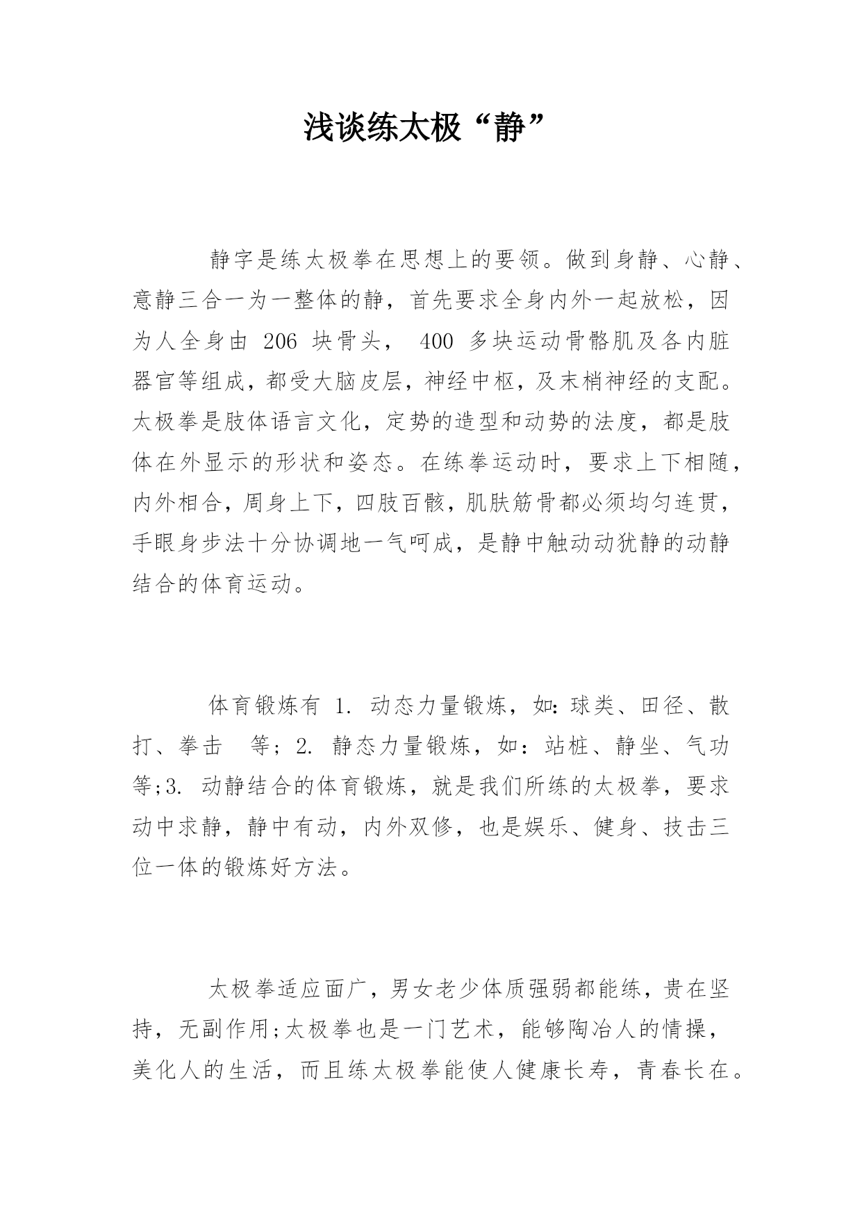 浅谈练太极“静”静字是练太极拳在思想上的要领。做到身静、心静、意静三合一为一整体的静,首先要求全身内外一起放松,因为人全身由206块骨头,400多块运动骨骼肌及各内脏器官等组成,都受大脑皮层,神经中枢,及末梢神经的支配。太极拳是肢体语言文化,定势的造型和动势的法度,都是肢体在外显示的形状和姿态。在练拳运动时,要求上下相随,内外相合,周身上下,四肢百骸,肌肤筋骨都必须均匀连贯,手眼身步法十分协调地一气呵成,是静中触动动犹静的动静结合的体育运动。体育锻炼有1.动态力量锻炼,如:球类、田径、散打、拳击等;2.静