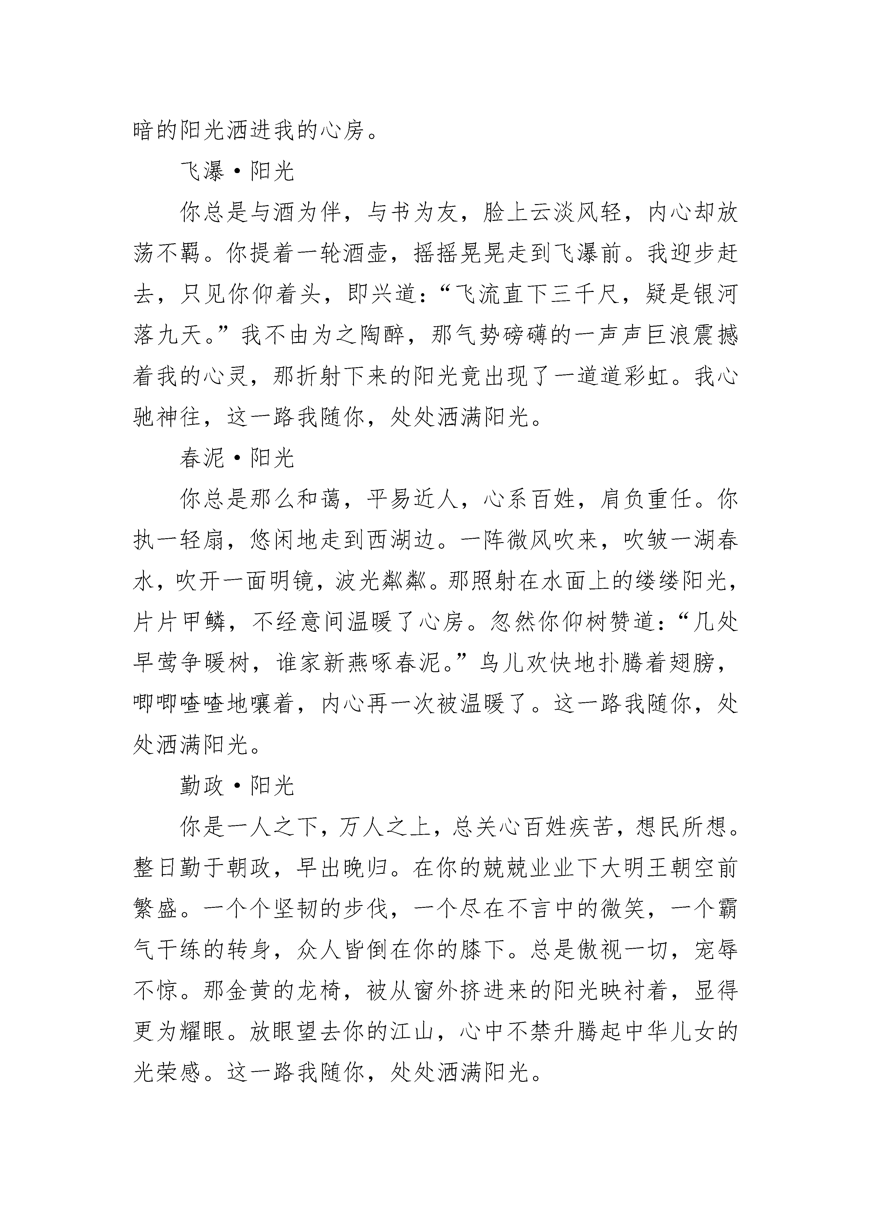 收藏阳光600字六年级作文怎么写大全你的笑如花般灿烂,在这个寒冬,如一缕温暖的阳光照进我的心田。题记小悦是我的同桌,她这个人,看上去文文静静,不爱说话,时间长了,我发现她其实还是蛮好相处的。体育测试八百米,因为感冒了,加上寒风的侵袭,我意外地没有通过,被留在操场上罚跑。望着体育老师那冷峻的眼神,我缩着脖子把准备好的借口理由吞了下去,硬着头皮开始跑。天很冷,过了关的同学都回教室了,留下的几个人谁也不说话,带着一肚子怨气各跑各的,就像遗落在树梢上瑟瑟发抖的枯叶。我的手冻得几乎失去了知觉,磨擦的力气都没有了,流