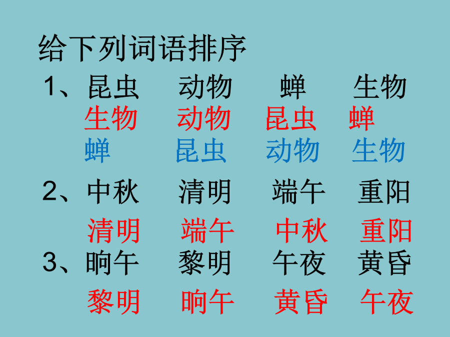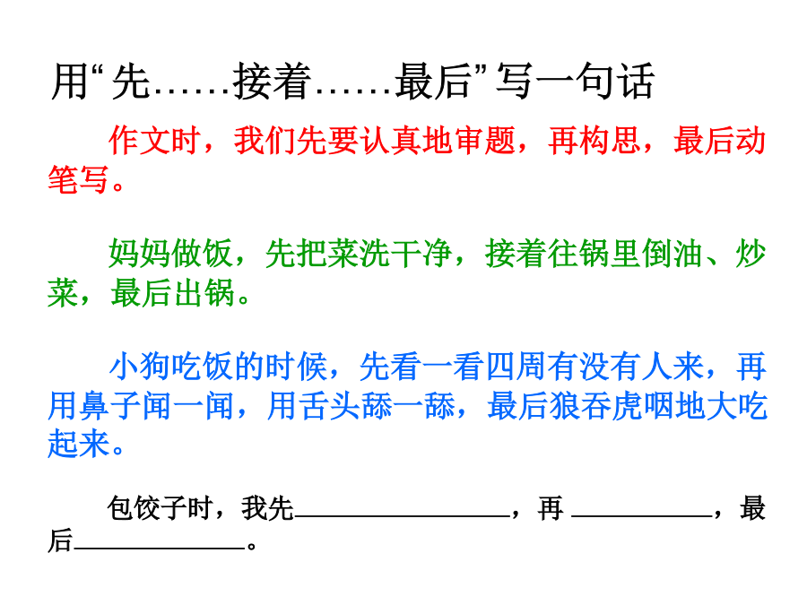 给下列词语排序词语积累读一读,想一想。作文时,我们先要认真地审题,再构思,最后动笔写。妈妈做饭,先把菜洗干净,接着往锅里倒油、炒菜,最后出锅。小狗吃饭的时候,先看一看四周有没有人来,再用鼻子闻一闻,用舌头舔一舔,最后狼吞虎咽地大吃起来。包饺子时,我先,再,最后。课外作业