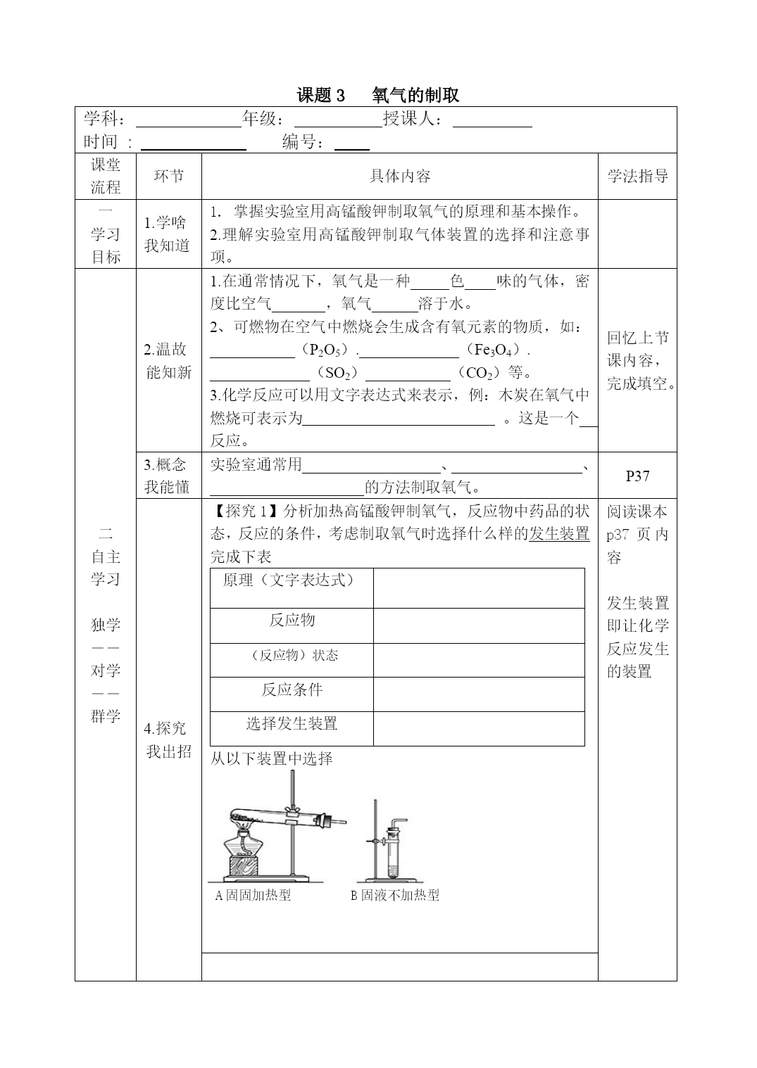 课题3氧气的制取学科:年级:授课人:时间:编号:课堂流程环节具体内容学法指导一学习目标1.学啥我知道1.掌握实验室用高锰酸钾制取氧气的原理和基本操作。2.理解实验室用高锰酸钾制取气体装置的选择和注意事项。二自主学习独学――对学――群学2.温故能知新1.在通常情况下,氧气是一种_____色____味的气体,密度比空气_______,氧气______溶于水。2、可燃物在空气中燃烧会生成含有氧元素的物质,如:___________(P2O5)._____________(Fe3O4).______