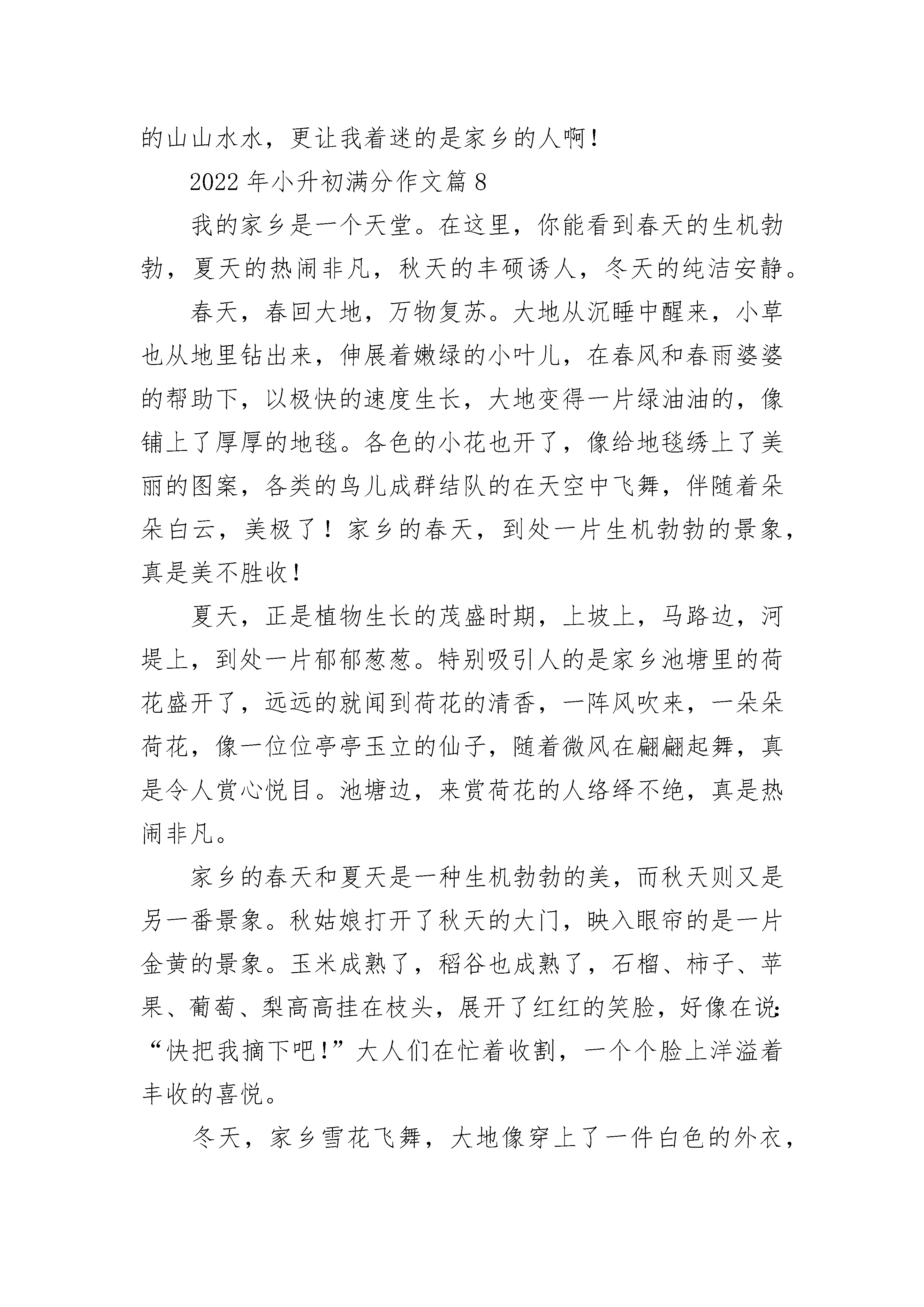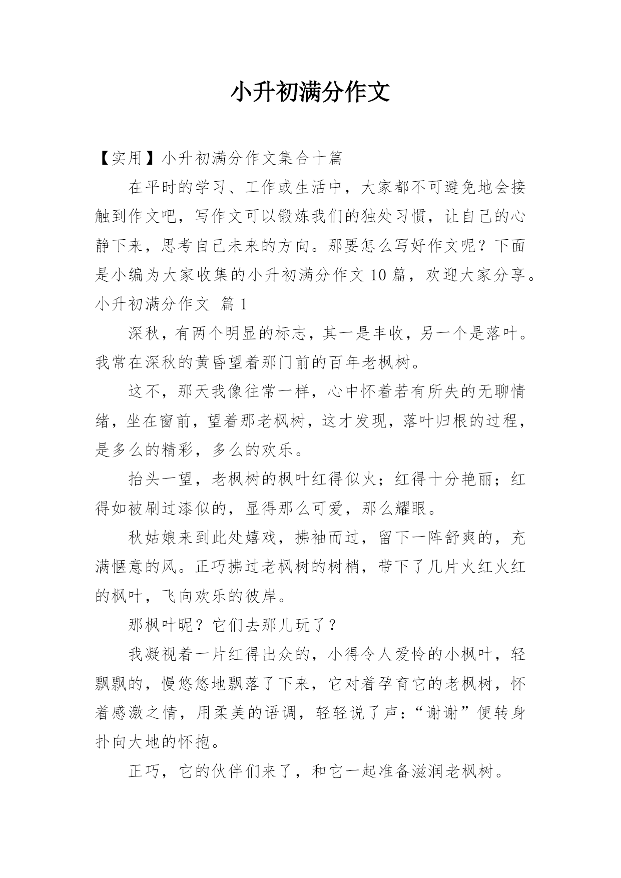 小升初满分作文【实用】小升初满分作文集合十篇在平时的学习、工作或生活中,大家都不可避免地会接触到作文吧,写作文可以锻炼我们的独处习惯,让自己的心静下来,思考自己未来的方向。那要怎么写好作文呢?下面是小编为大家收集的小升初满分作文10篇,欢迎大家分享。小升初满分作文篇1深秋,有两个明显的标志,其一是丰收,另一个是落叶。我常在深秋的黄昏望着那门前的百年老枫树。这不,那天我像往常一样,心中怀着若有所失的无聊情绪,坐在窗前,望着那老枫树,这才发现,落叶归根的过程,是多么的精彩,多么的欢乐。抬头一望,老枫树的枫叶红