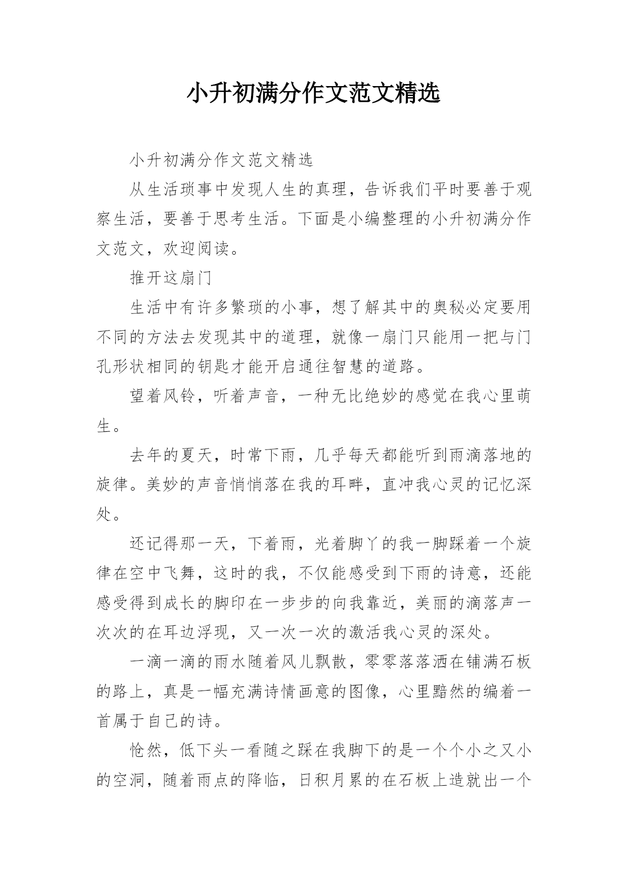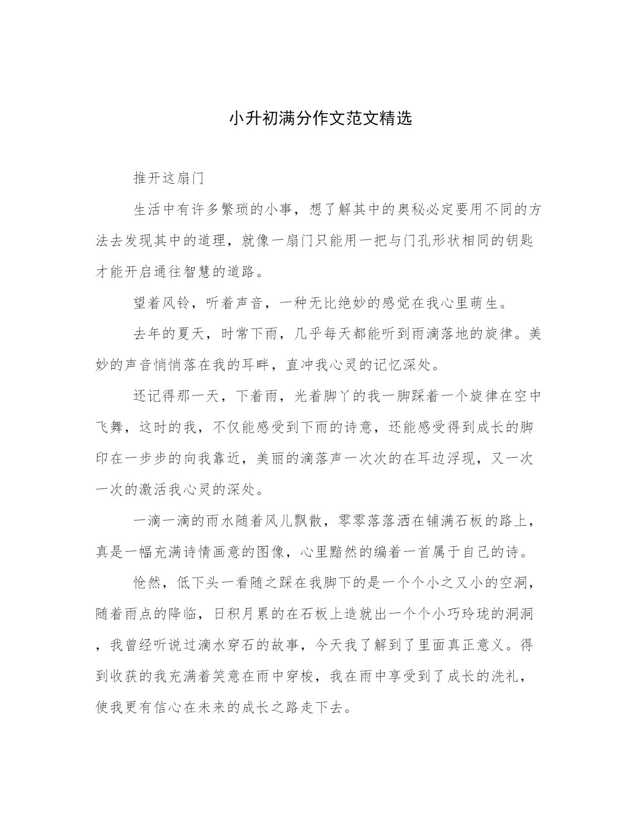 小升初满分作文范文精选小升初满分作文范文精选从生活琐事中发现人生的真理,告诉我们平时要善于观察生活,要善于思考生活。下面是小编整理的小升初满分作文范文,欢迎阅读。推开这扇门生活中有许多繁琐的小事,想了解其中的奥秘必定要用不同的方法去发现其中的道理,就像一扇门只能用一把与门孔形状相同的钥匙才能开启通往智慧的道路。望着风铃,听着声音,一种无比绝妙的感觉在我心里萌生。去年的夏天,时常下雨,几乎每天都能听到雨滴落地的旋律。美妙的声音悄悄落在我的耳畔,直冲我心灵的记忆深处。还记得那一天,下着雨,光着脚丫的我一脚踩着