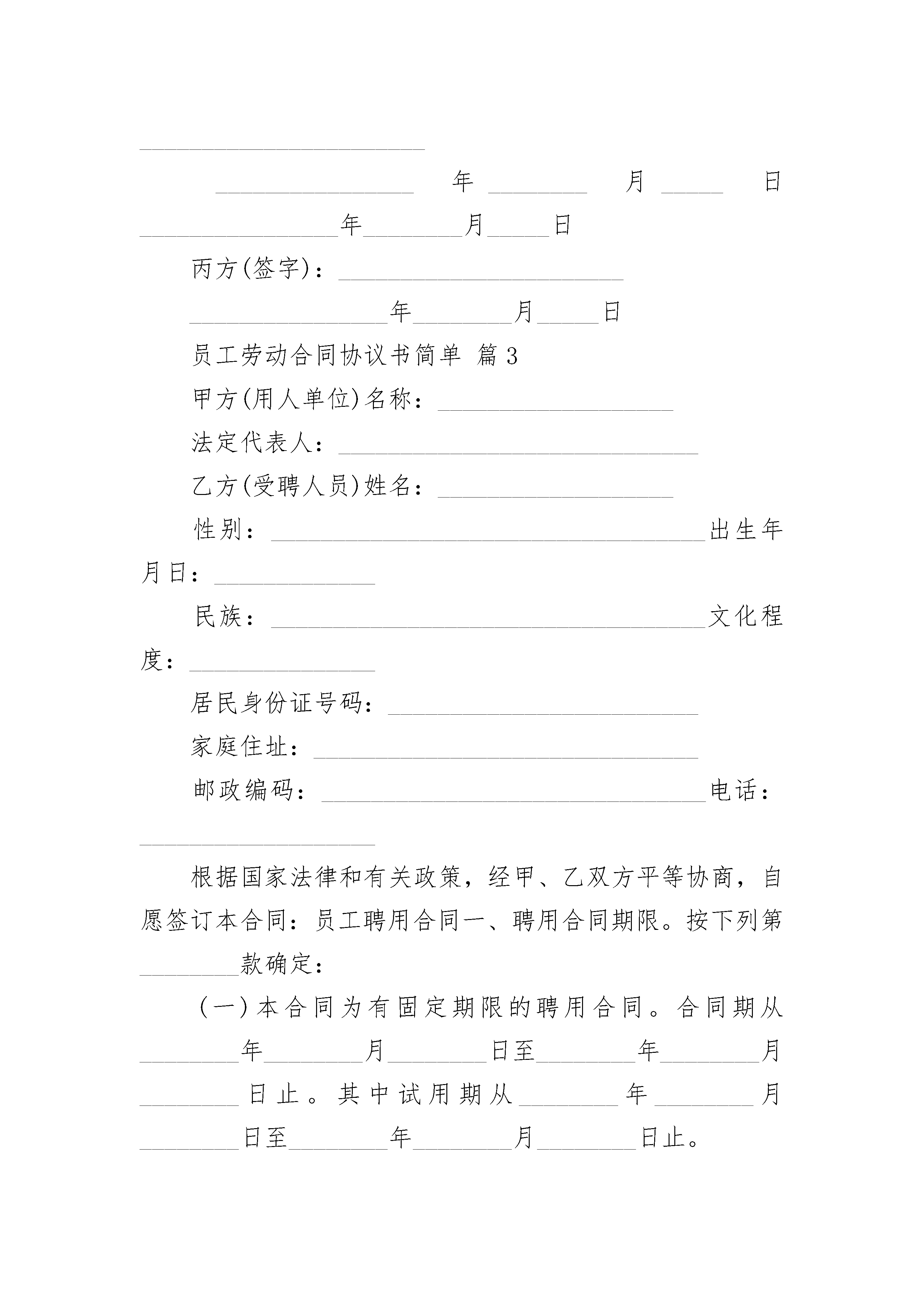 员工劳动合同协议书简单员工劳动合同协议书简单(精选24篇)员工劳动合同协议书简单篇1甲方:________________身份证号:________________________乙方:________________身份证号:________________________甲方聘用乙方为试用期员工,试用期______个月,自______年______月______日起至______年______月______日止。经双方平等协商,现就试用期间的有关事项订立以下条款,以共同遵守。1、乙方同意根据甲方工