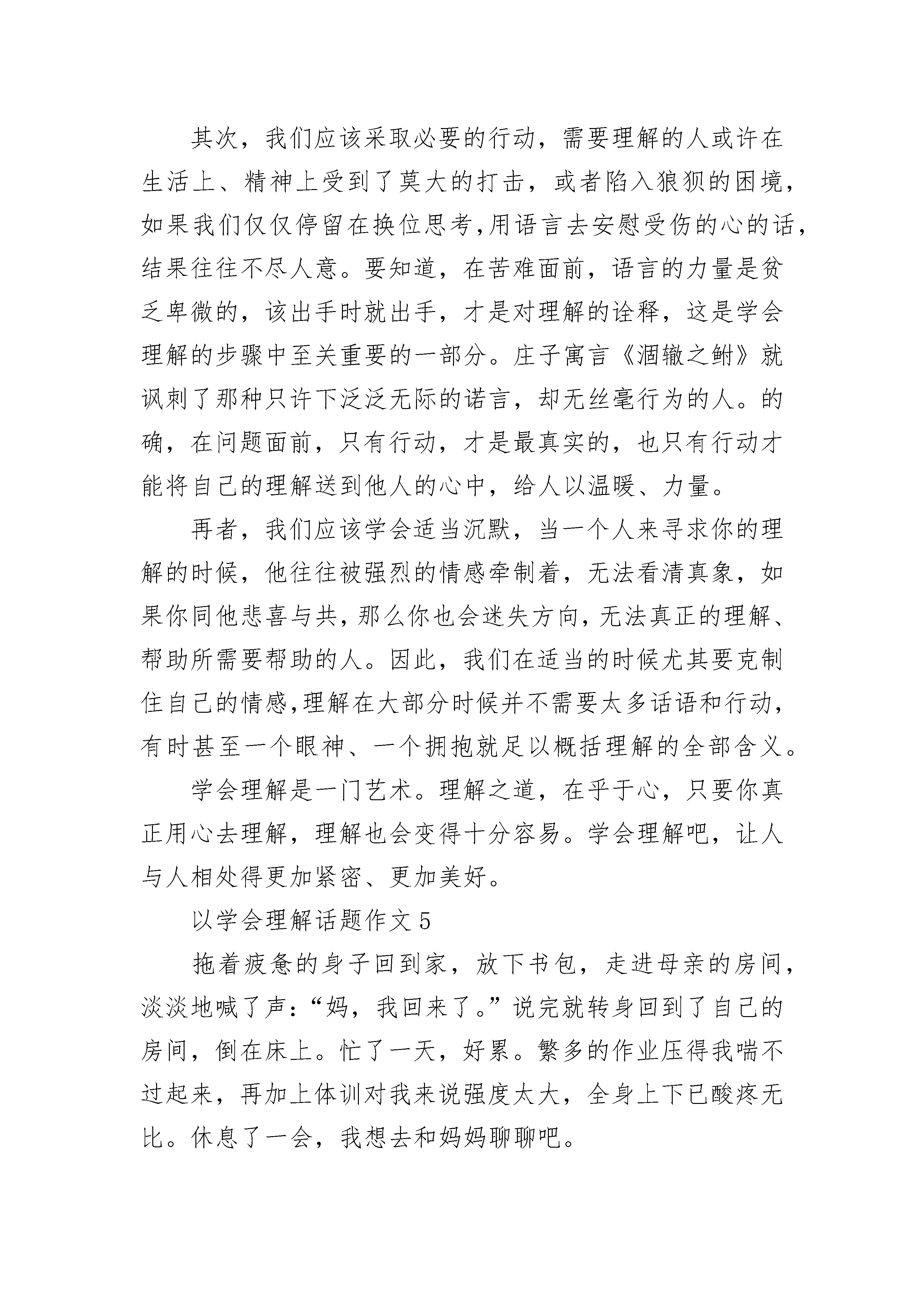 以学会理解话题作文合集雨后的清晨,云雾在空中徘徊,遮住了房屋、树木、道路,人影在朦胧的雾中若隐若现,十分的神秘,十分的幽静难得,在这样的天气下,妈妈决定亲自送我上学,我也是百思不得其解。可是,来到大街,一切似乎都变了:刚上路,妈妈就让我走在右边,当时,我看到自己的前面全是坑坑洼洼的小坑,而妈妈的前面却什么都没有,内心便不由得生起了闷气儿。“为什么我要走右边儿?我想走左边!”我有一点儿不耐烦了,可是妈妈依然固执己见,不管我怎么大吼大叫,她仍然没有一丝要改变注意的意思。云雾中,学校那高大的轮廓慢慢呈现在我眼前