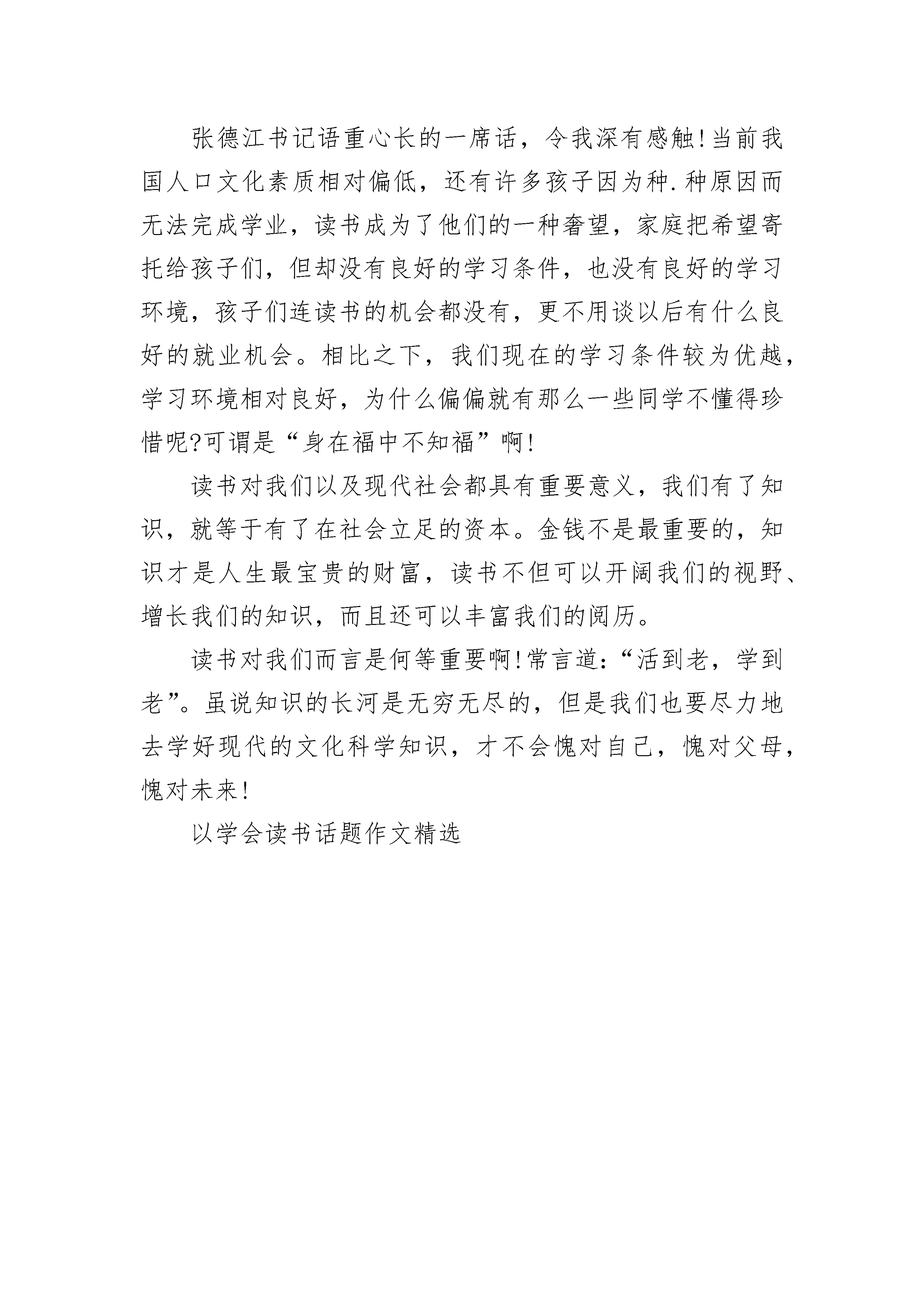 关于学会读书话题作文精选“书中自有颜如玉”“书中自有黄金屋”,古人对于读书有着无可想象的热诚,也给了它极高的评价,在宋朝更是大力地推行文学,正是因为对读书的热诚,对文学的喜爱,才有了让我们引以为傲的唐诗宋词元曲以及现在的散文,美文,而这些知识和语感正是读书所得。“书籍是人类进步的阶梯。”高尔基曾经这样说过。是的,我也认为如此,书中有前人的经验和智慧,也有着今人的探索和发现,书中又有着许许多多的人的故事,作者用最质朴的语言详尽地描述着他所生活的那个时代的印记,带给我们最真实的感受,深深地触动我们的心灵。