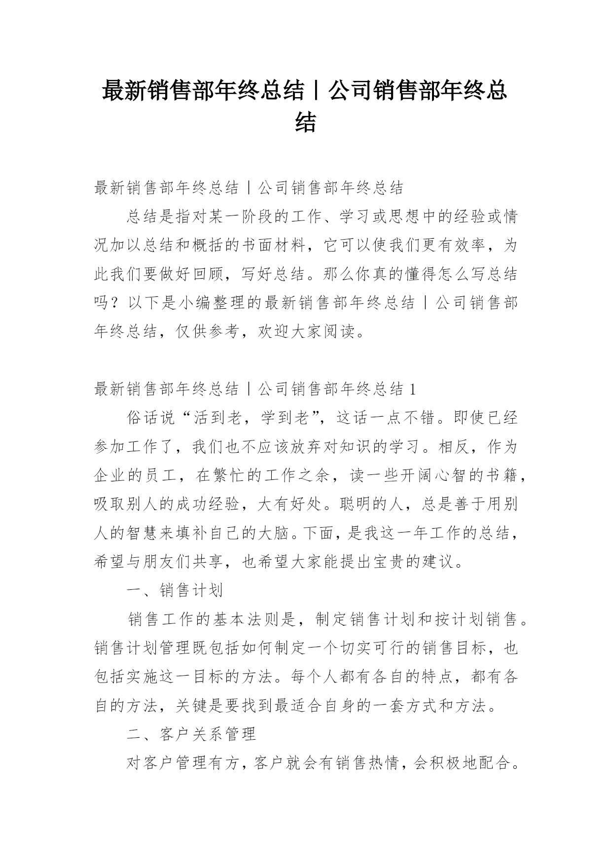最新销售部年终总结|公司销售部年终总结总结是指对某一阶段的工作、学习或思想中的经验或情况加以总结和概括的书面材料,它可以使我们更有效率,为此我们要做好回顾,写好总结。那么你真的懂得怎么写总结吗?以下是小编整理的最新销售部年终总结|公司销售部年终总结,仅供参考,欢迎大家阅读。最新销售部年终总结|公司销售部年终总结1俗话说“活到老,学到老”,这话一点不错。即使已经参加工作了,我们也不应该放弃对知识的学习。相反,作为企业的员工,在繁忙的工作之余,读一些开阔心智的书籍,吸取别人的成功经验,大有好处。聪明的人,总是