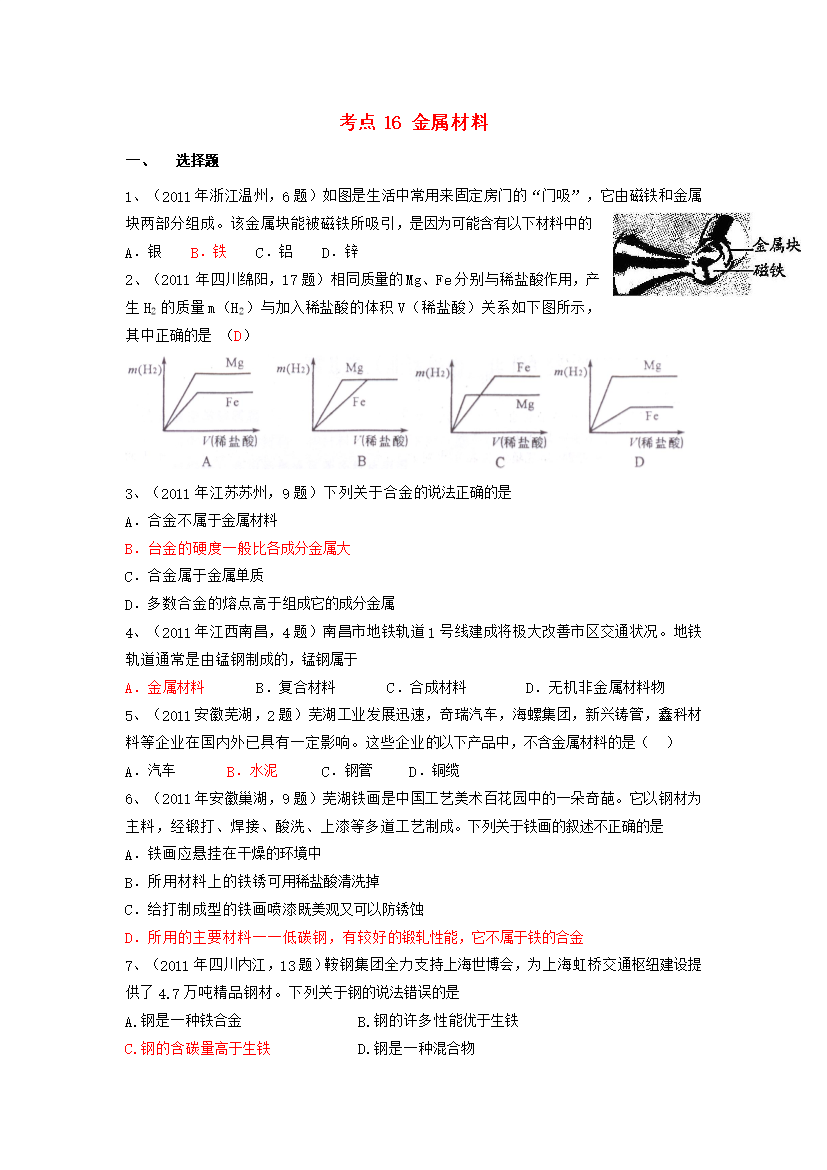 考点16金属材料选择题1、(2011年浙江温州,6题)如图是生活中常用来固定房门的“门吸”,它由磁铁和金属块两部分组成。该金属块能被磁铁所吸引,是因为可能含有以下材料中的A.银B.铁C.铝D.锌2、(2011年四川绵阳,17题)相同质量的Mg、Fe分别与稀盐酸作用,产生H2的质量m(H2)与加入稀盐酸的体积V(稀盐酸)关系如下图所示,其中正确的是(D)3、(2011年江苏苏州,9题)下列关于合金的说法正确的是A.合金不属于金属材料B.台金的硬度一般比各成分金属大C.合金属于金属单质D.多数合金的熔点高于组