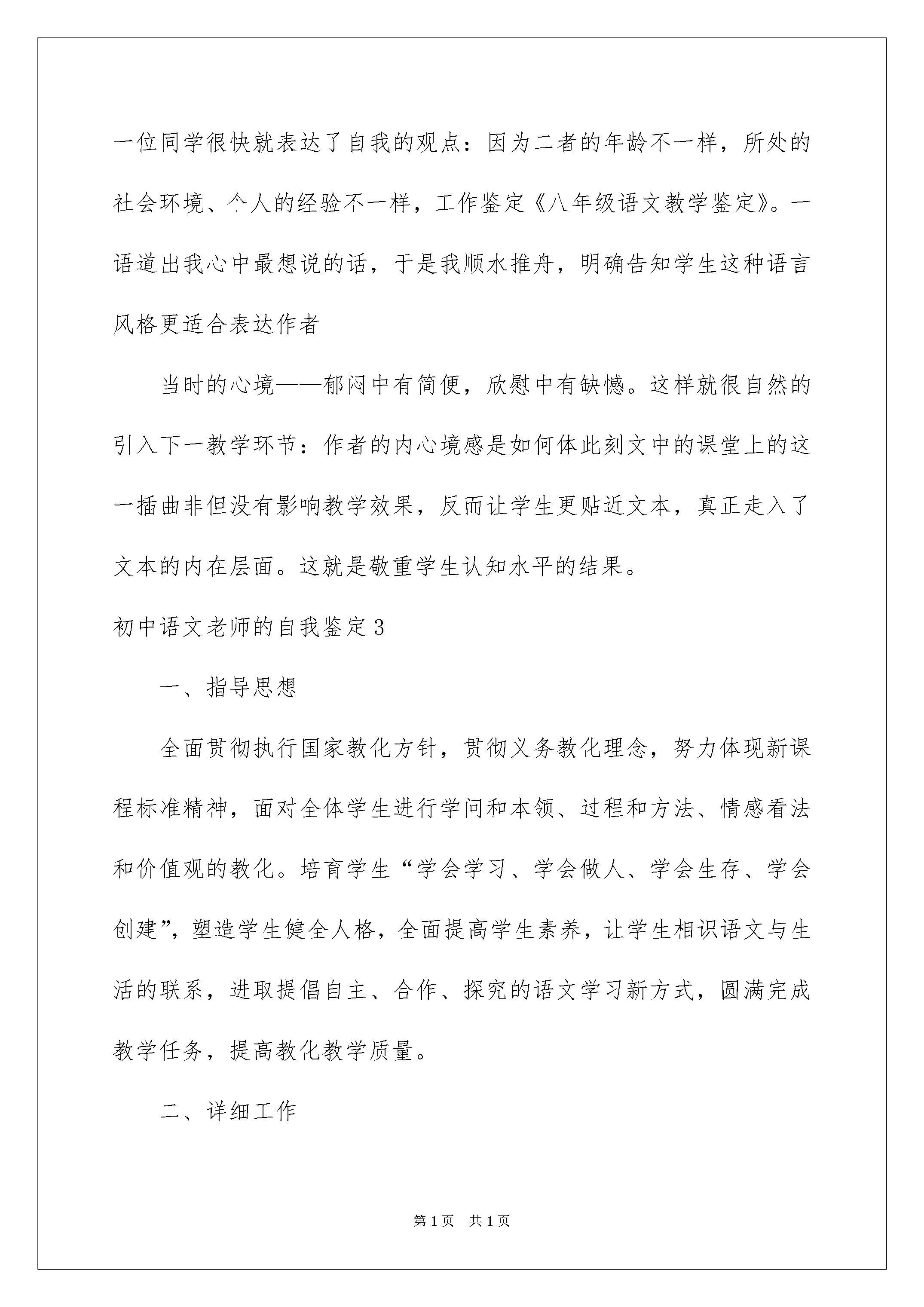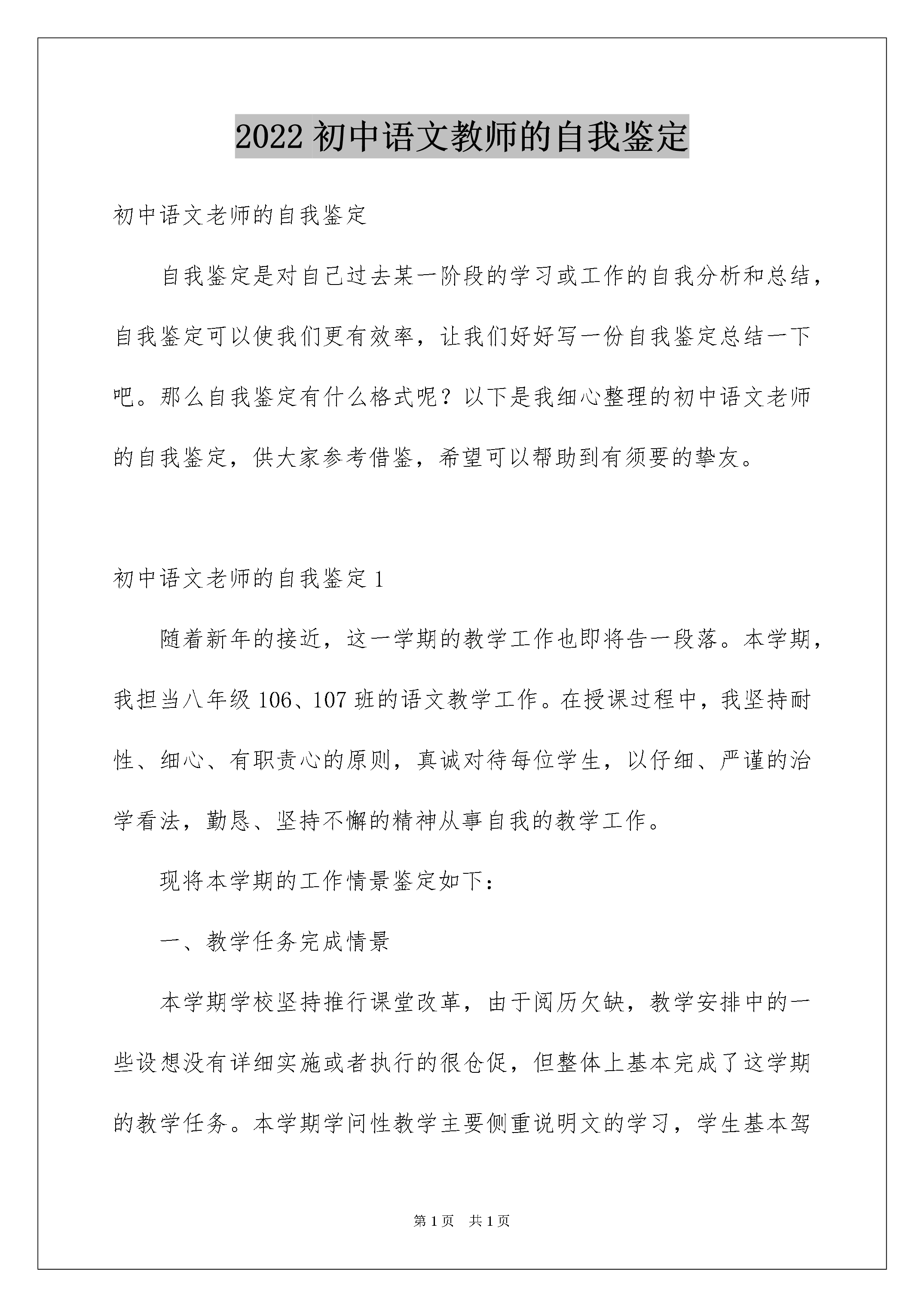 2022初中语文教师的自我鉴定初中语文教师的自我鉴定自我鉴定是对自己过去某一阶段的学习或工作的自我分析和总结,自我鉴定可以使我们更有效率,让我们好好写一份自我鉴定总结一下吧。那么自我鉴定有什么格式呢?以下是我精心整理的初中语文教师的自我鉴定,供大家参考借鉴,希望可以帮助到有需要的朋友。初中语文教师的自我鉴定1随着新年的临近,这一学期的教学工作也即将告