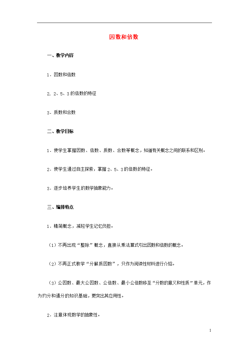 1因数和倍数一、教学内容1.因数和倍数2.2、5、3的倍数的特征3.质数和合数二、教学目标1.使学生掌握因数、倍数、质数、合数等概念,知道有关概念之间的联系和区别。2.使学生通过自主探索,掌握2、5、3的倍数的特征。3.逐步培养学生的数学抽象能力。三、编排特点1.精简概念,减轻学生记忆负担。(1)不再出现“整除”概念,直接从乘法算式引出因数和倍数的概念。(2)不再正式教学“分解质因数”,只作为阅读性材料进行介绍。(3)公因数、最大公因数、公倍数、最小公倍数移至“分