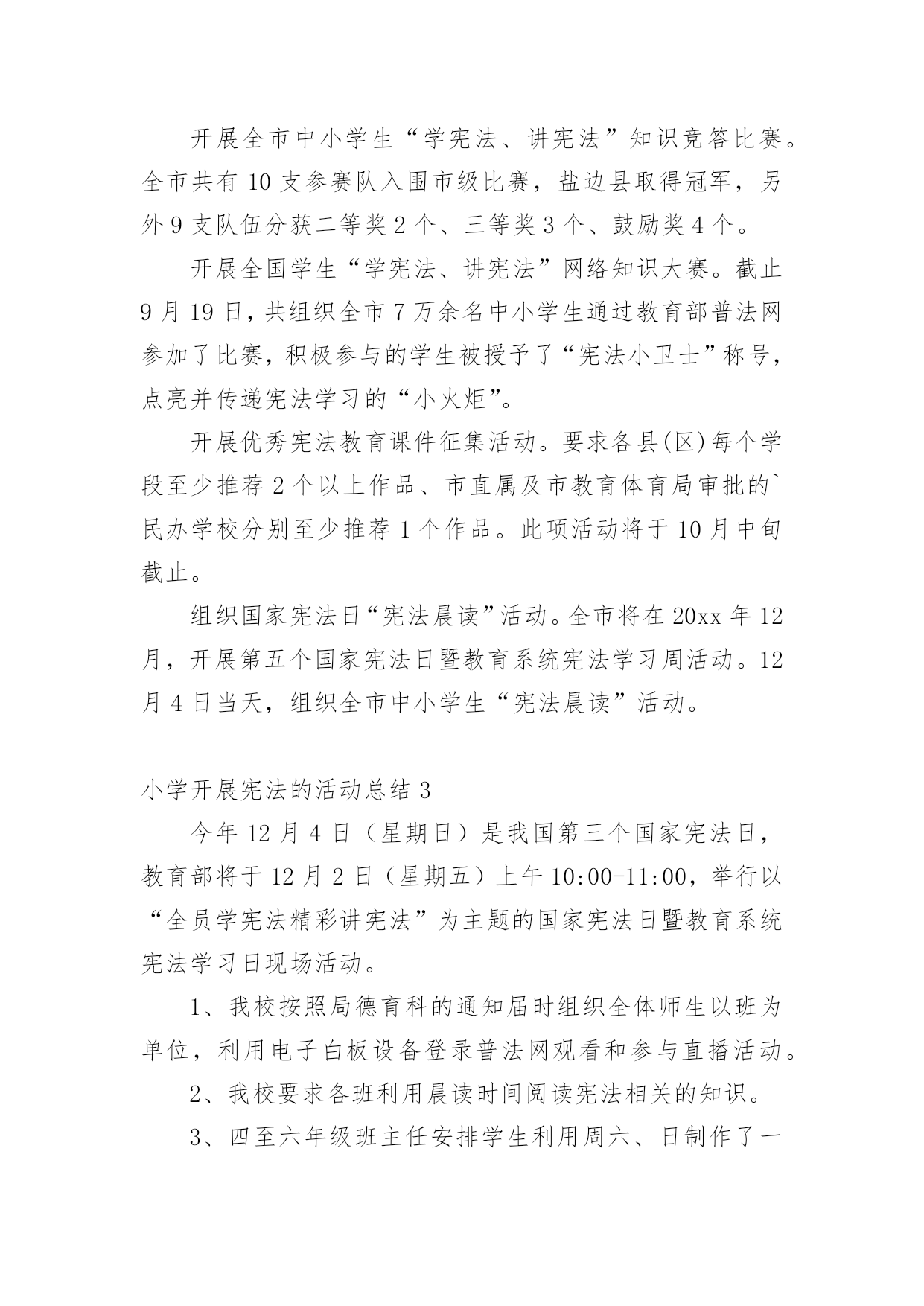 小学开展宪法的活动总结小学开展宪法的活动总结(精选11篇)快乐有趣的活动已经告一段落了,我相信大家都是有收获的,这时候,最关键的活动总结怎么能落下。那么活动总结应该包括什么内容呢?下面是小编为大家整理的小学开展宪法的活动总结,仅供参考,希望能够帮助到大家。小学开展宪法的活动总结1为了进一步把我校法制教育工作推上一个新的台阶,结合20xx年“12.4”全国法制教育宣传日,根据教育部通知精神,我校以“弘扬宪法精神,传播法治力量”为主题,把普法教育、依法治校、依法施教作为创建安全文明校园,培养文明之花的重要工作