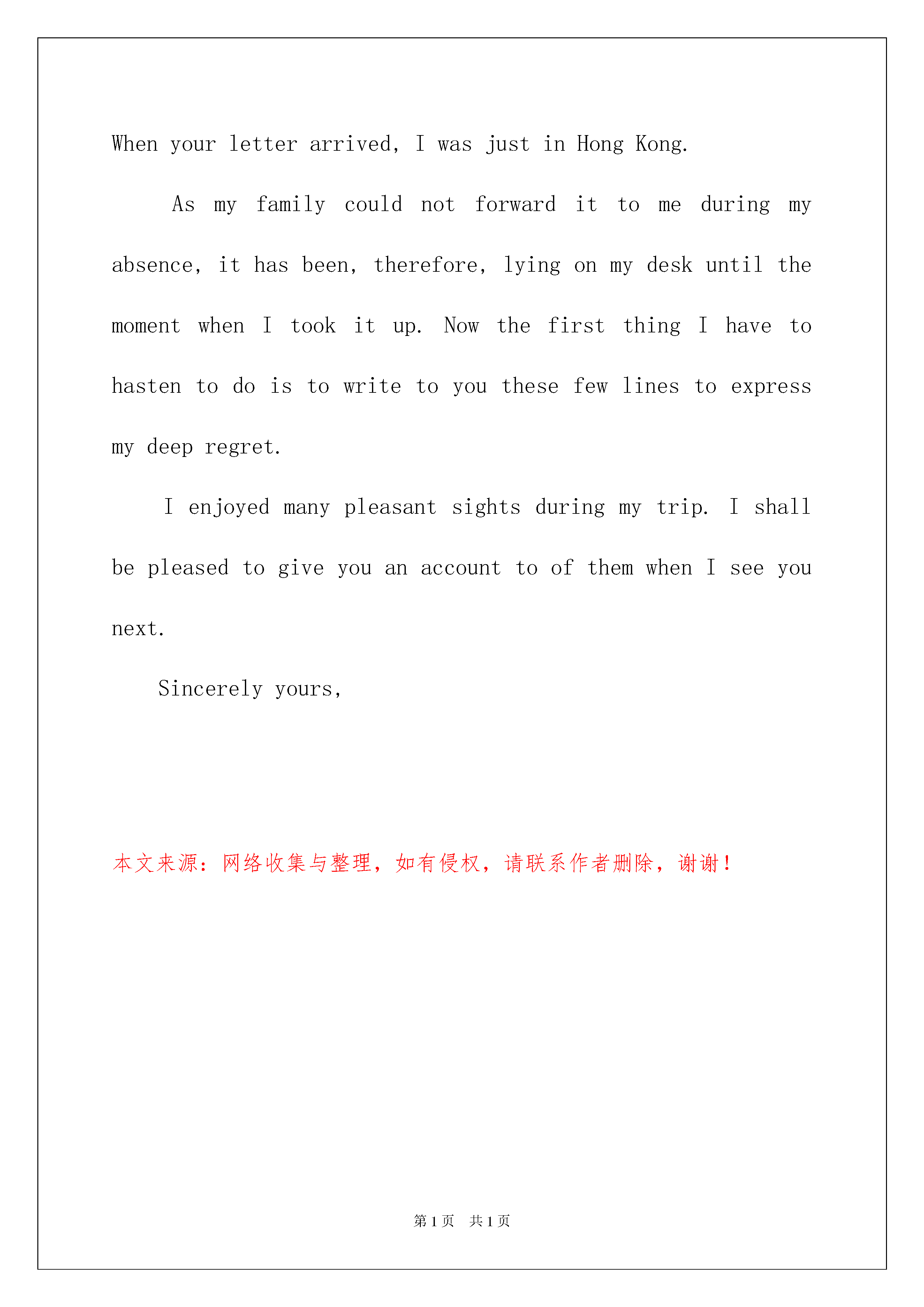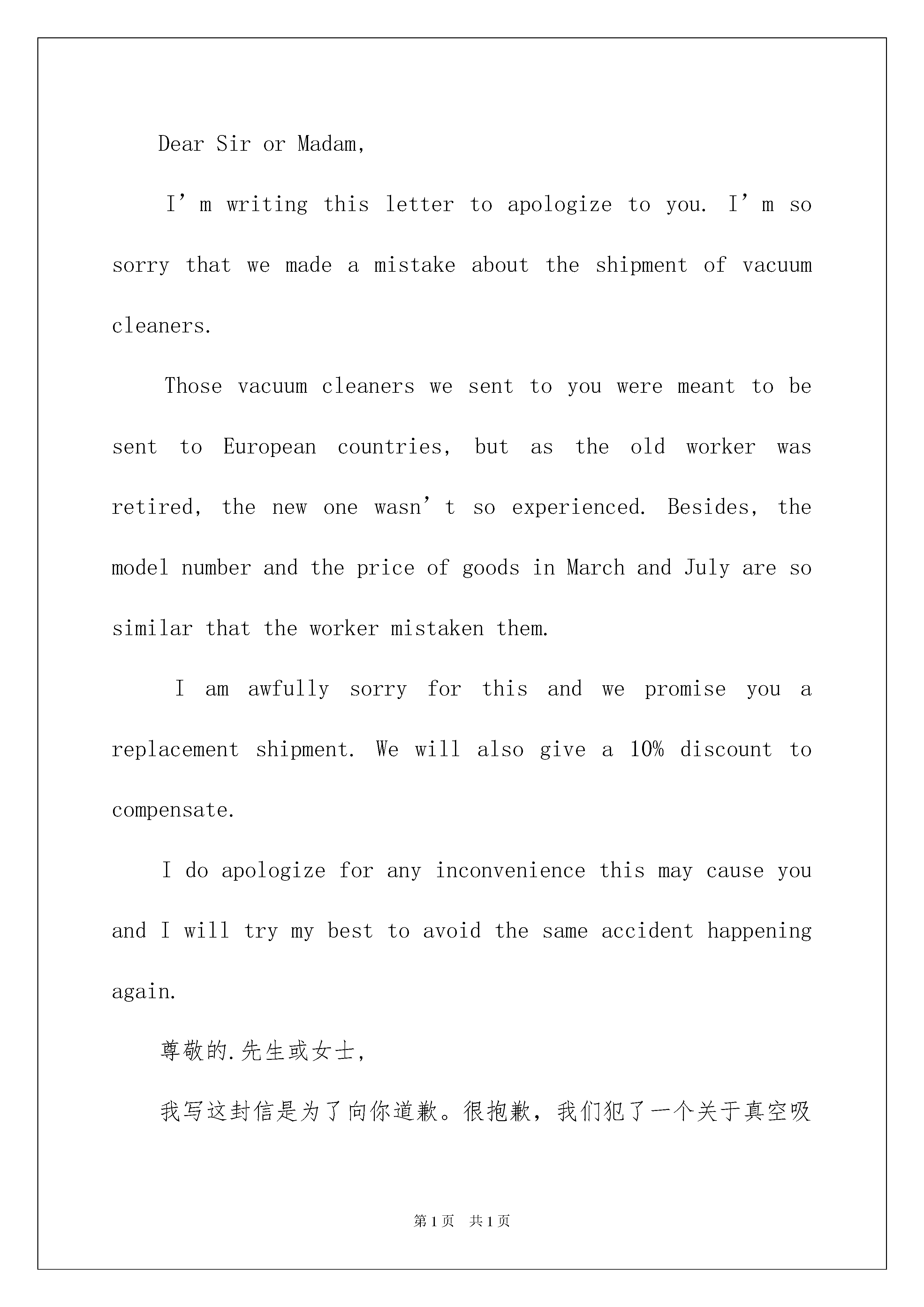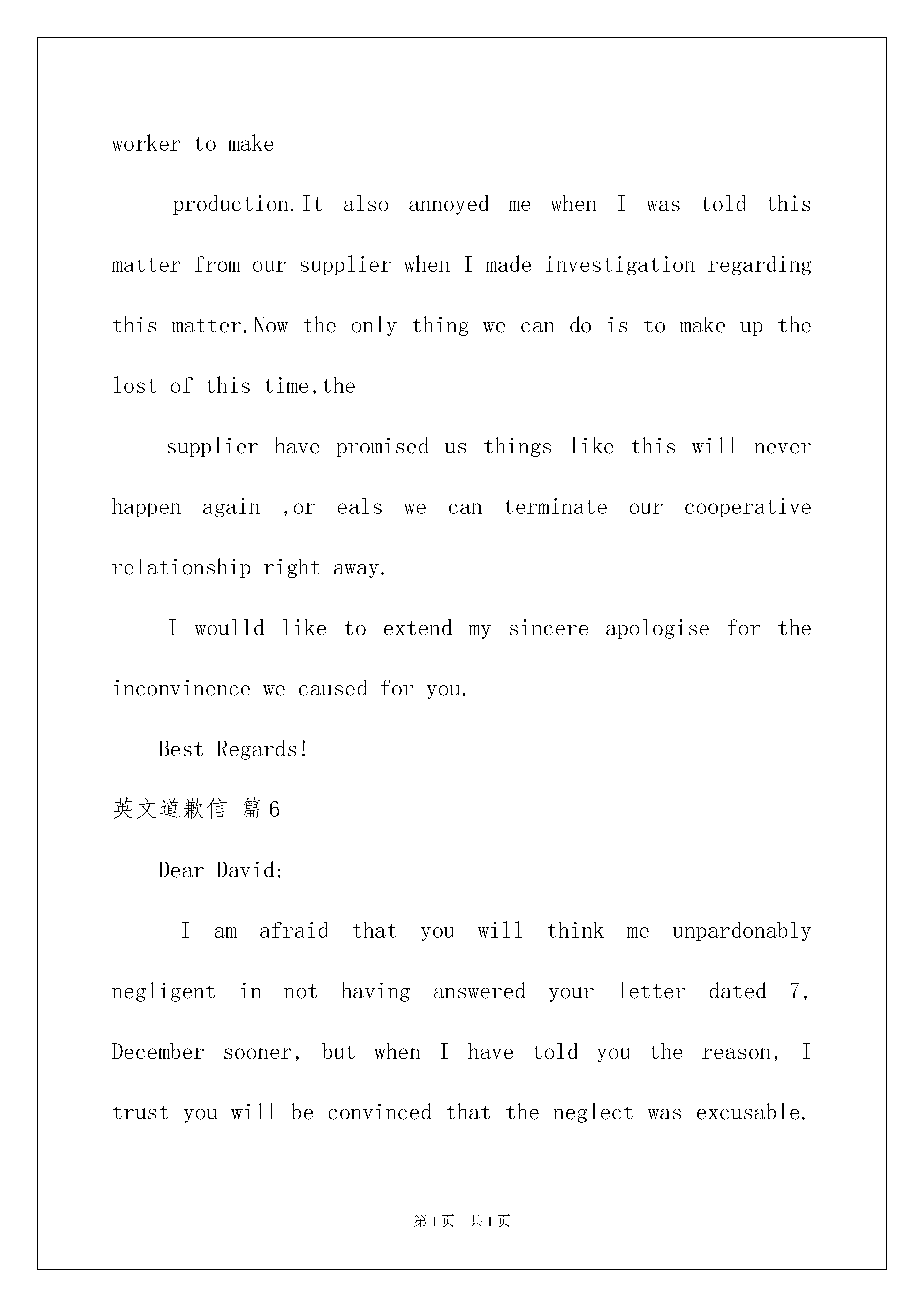 2022实用的英文道歉信范文汇编6篇实用的英文道歉信范文汇编6篇在社会一步步向前发展的今天,我们总不免地需要写道歉信,道歉信可以帮助我们更好地检讨自己和感谢对方。相信很多朋友都对写道歉信感到非常苦恼吧,以下是我为大家整理的英文道歉信6篇,仅供参考,欢迎大家阅读。英文道歉信篇1DearSirorMadam:TheManagementofChinaWor