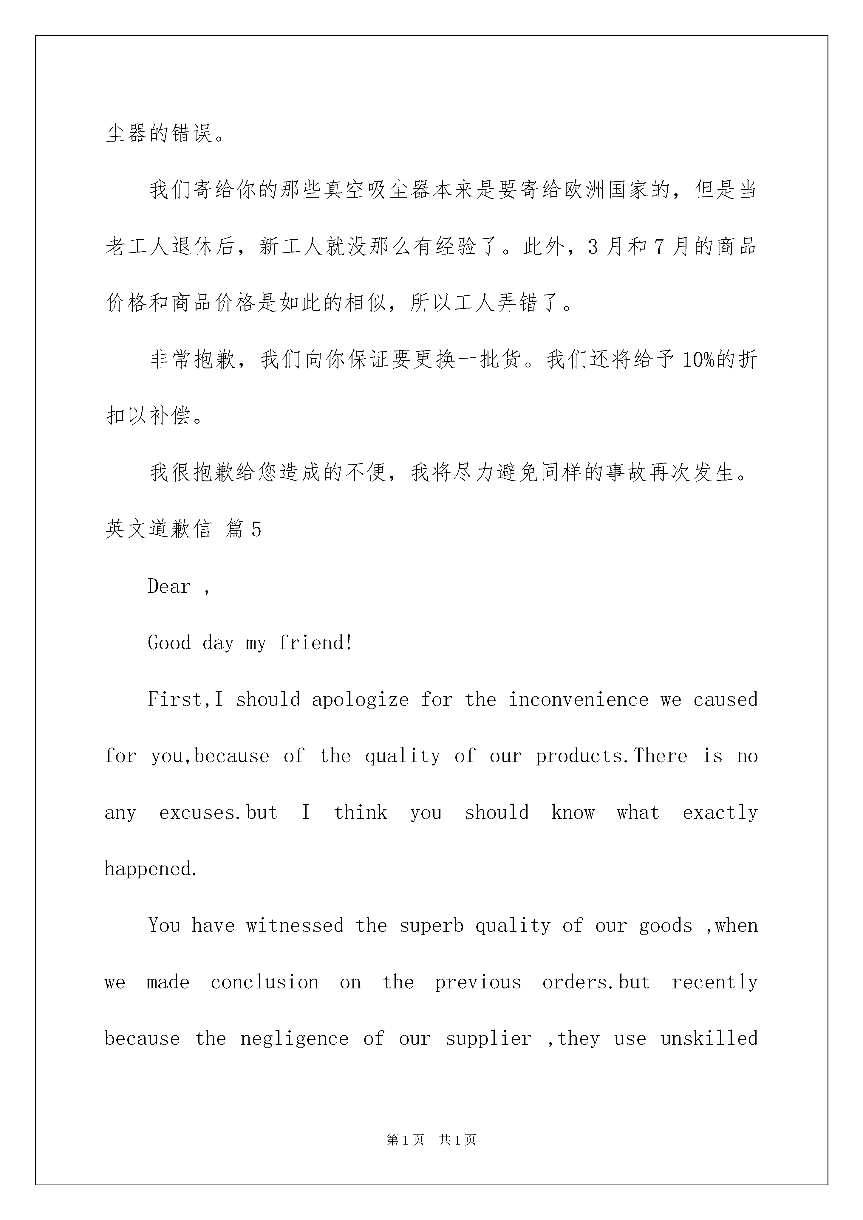 2022实用的英文道歉信范文汇编七篇实用的英文道歉信范文汇编七篇在日常生活和工作中用到道歉信的地方越来越多道歉信是要向对方陈述无法答应的所请所托的原因对不愿为的'事可声明自己的一贯主张对不能为的请托更应陈述理由说明自己为什么不能为。如何写一份恰当的道歉信呢?下面是我为大