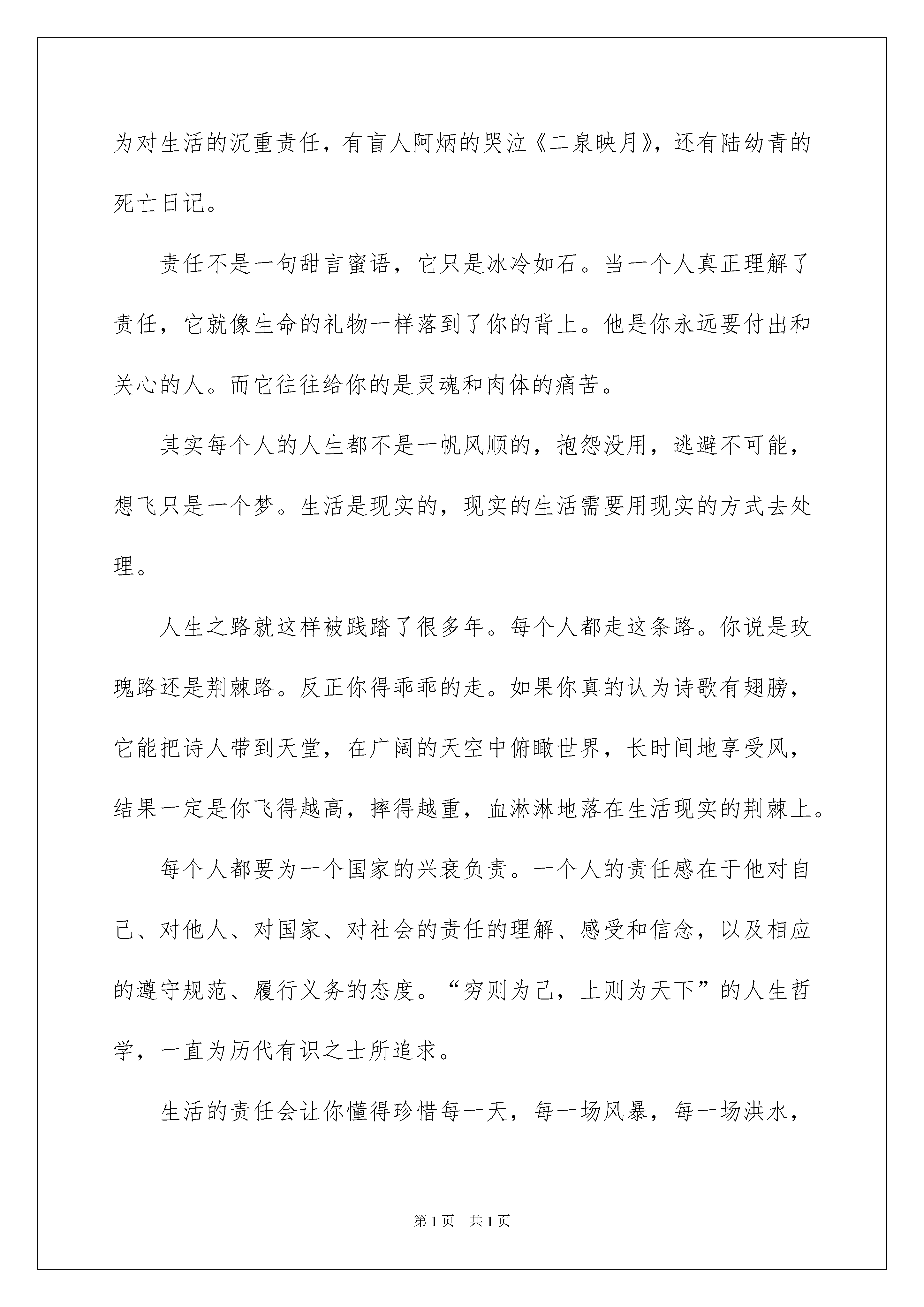 2022实用的责任演讲稿10篇实用的责任演讲稿10篇演讲稿具有逻辑严密,态度明确,观点鲜明的特点。在日新月异的现代社会中,越来越多地方需要用到演讲稿,那要怎么写好演讲稿呢?下面是我帮大家整理的责任演讲稿10篇,欢迎大家分享。责任演讲稿篇1尊敬的各位领导、各位同仁:上午好!非常感谢你们给我提供了这个学习交流的机会!我演讲的题目是做一个负责的人。说起责任,我想起温总理的一句话,就是“用心想事,用心讲话,用心做事”,我认为这个心就是责任心。“大家在不同岗位工作,职责可能不一样,但责任心必须人人具备,负责任的态度必须人人持有。所以,我认为负责任是落实工作的关键,是做好本职工作的前提。责任心是每个人必须具备的基本政治素质和必须遵循的基本职业道德。人的能力有强弱之别、责任有大小之分,但忠于职守、勤勉尽责人人都应恪守。面对增幅50%的税收任务,是迎难而上,还是顺“势”而下,表面上看是能力水平问题,深究起来还是责任心问题。没有能力,但有一个竭力尽责的精神,责任心也就会转化为能力;没有责任心,即使有能力,也是无用之力,这种能力也在淡化的责任中钝化、丧失,如果不用在工作上,甚至会走向反面。因此,在增幅50%的税收任务面前,必须以知难而进、用奋发有为的状态对待压力,以求真务实、科学严谨的态度破解难题,以对事业、对人民高度负责的精神推进工作。归结到一点,就是负责任。无论干什么事,在什么岗位上,都莫让责任心丢失,“在其位、谋其政,履其职、尽其责”。负责任,这是一种积极向上的精神境界,是实现人生价值的前提和基础。增幅50%的税收任务是摆在我们面前的艰巨任务,正因为任务艰巨才蕴含着实现价值的成就。所以这个过程往往是艰辛的、繁重的,甚至不如人意的,这就需要我们有不达目的决不休止的勇气和力量,有为实现崇高理想锲而不舍的精神和毅力。如果对工作倾注了真情,付出了全部心血,真正变负担为热爱,就能从艰苦的工作中享受到快乐,从繁重的工作中品尝到意外的惊喜。负责任就要做一个有责任心的人。责任心是一个人对自己的所作所为负责,对他人、对集体、对社会、对国家乃至整个人类承担责任和履行义务的自觉态度。一个人的责任心如何,决定着他在工作中的态度,决定着其工作的好坏和成败。不论你是一名默默无闻的办事员,还是大权在握的领导者,都应有责任心,凡事尽心、尽力而为。一个有责任心的人,一定会认真地思考,勤奋地工作,细致踏实,实事求是;一定是做每一件事都坚持到底,按时、按质、按量地完成任务,圆满地解决问题;一定能主动处理好分内与分外的相关工作,有人监督与无人监督都能主动承担责任而不推卸责任。负责任就是诚心地去工作,用一句俗话来讲就是把单位的事当作自己家里的事来办。有一句古话说“静坐常思已过,闲谈莫论人非”,静坐时我也常扪心自问我对工作很负责吗?我仔细掂量掂量我所履行的工作,真还有很多不尽人意的地方。今天,面对增幅50%,1亿4千万的税收任务,如果再不增强责任心,那真有可能使我所从事的岗位出现断层和空档。因此,我们必须时时刻刻拈量这份责任,多想一想自己承担什么责任、怎样履行好责任,如何才能让组织放心、让人民满意。有了这样的使命感和责任感,就能从内心深处焕发强烈的工作激情,满腔热忱地投身税收事业,忘我工作。同志们,责任是使命,增幅1亿4千万的税收任务就是我们后三个月的目标。只要我们把责任放在心中,从点点滴滴做起,从诚信敬业做起,从不讲任何借口做起!我相信我们的责任一定会转化为完成任务的动力。敢问路在何方,路在脚下!我的演讲结束了,谢谢大家!责任演讲稿篇2为一名教师,我该拥有什么样的人生观和价值观?这是我常常思索的问题。做一个对社会有用的人,是我这么多年来一直奉行的座右铭。一个人的成长离不开周围的环境。孔子曰:三人行,必有我师。择其善者而从之,择其不善者而改之。见贤思齐,见不贤而自省。我身边的每一个人都是我学习的榜样。在同事那里学会了谦虚,学会了待人真诚,学会了如何对待工作,学会了如何对待学生,学会了如何做一名合格的教师。在我的心目中,我身边的每一位老师的优点都像一盏明灯照耀着我的心扉,指引着我的做人方向。来刘沟小学的第一天我就被这儿的学习氛围,工作氛围深深地的感染了,不自觉的就投入到教师们工作学习生活的洪流中。经历了才知道艰辛,经历了刘沟小学的风风雨雨,我也成长起来,由原来的散漫、迷茫、眼界稚嫩成长为如今能适应快节奏工作,能自由运用现代化设施进行教学,能从不同侧面看待问题,这些变化与领导和老师们的关心爱护是分不开的。下面,我将我近年来的工作向大家作以汇报:多年来,我工作中一直坚持“自己的事认真干,别人的事帮着干,学校的事争着干”。对待学校的工作