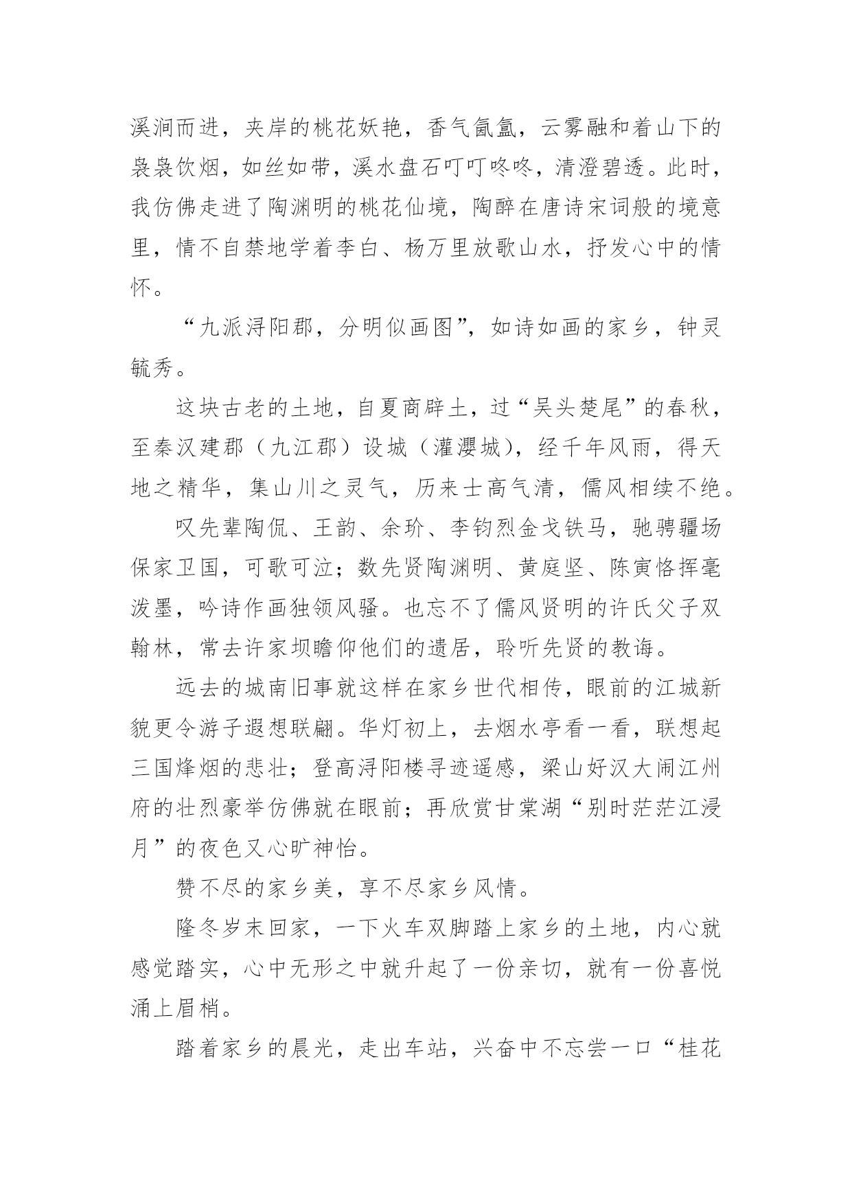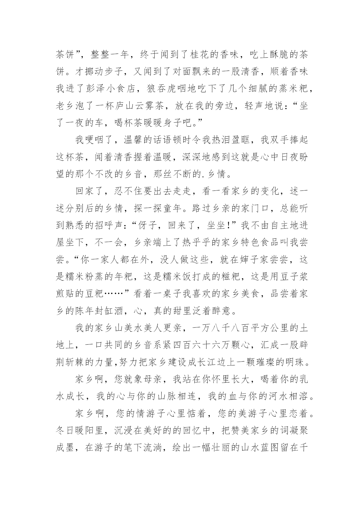 笔尖流淌着家乡的美美文欣赏我无时无刻不在想念自己的家乡,想念我的亲人。总是在心里轻声地问候:远方的山是否还葱绿?远方的水是否还澄明?远方亲人您是否平安快乐?生活在思念的空间,常常被家乡的美丽和热情感动得热泪盈眶,魂牵梦萦的乡情,思念起来总是让我留连忘返。睁开眼遥想远方,眼前尽是熟悉的青山绿水;闭上眼倾心聆赏,耳边犹是耳熟能详的乡音欢颜。每每沉浸在这依恋的气氛中,把一颗游子的心与那难以割舍的乡情系上,随着异乡的风飘向遥远的家乡……你没有到过我的家乡,不知道我家乡的景致数不胜数,不知道我家乡的风光美不胜收,只