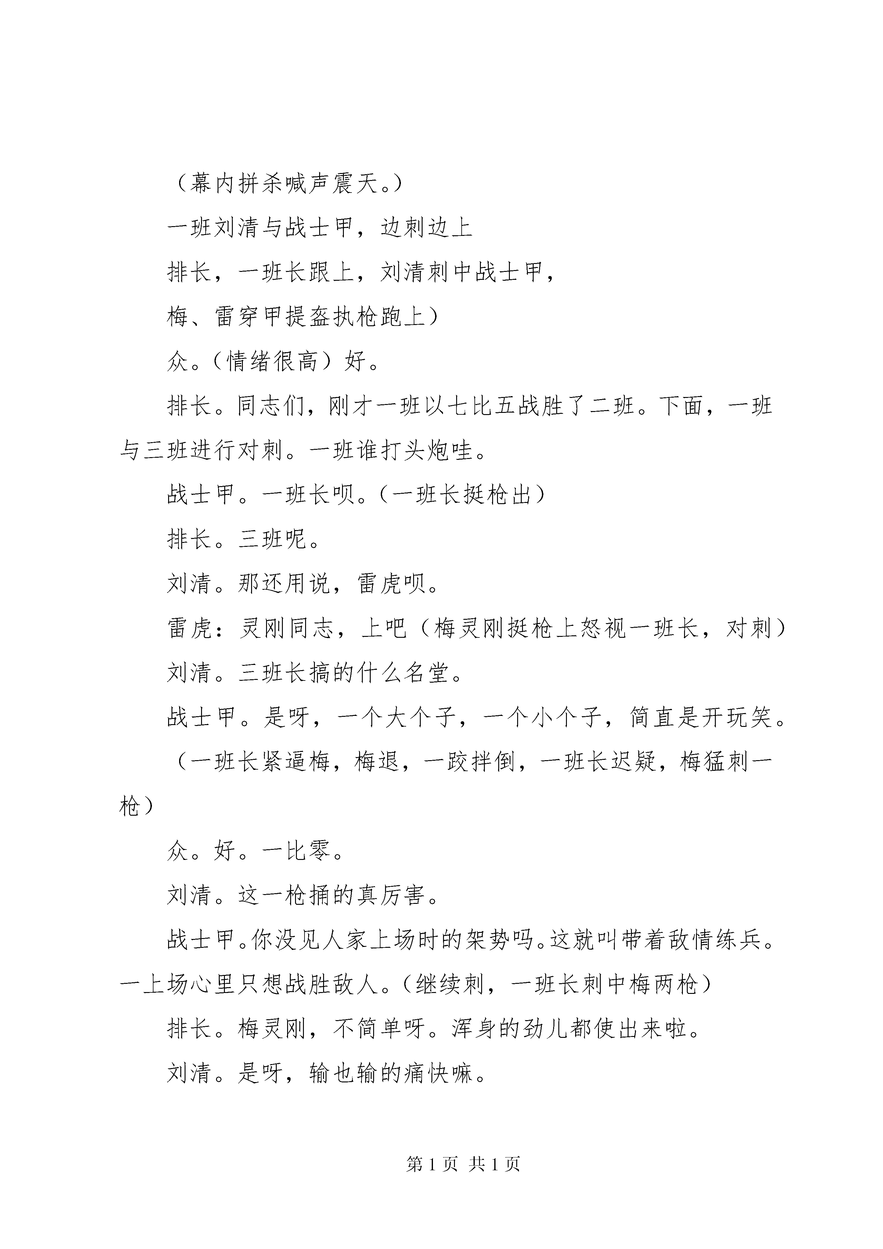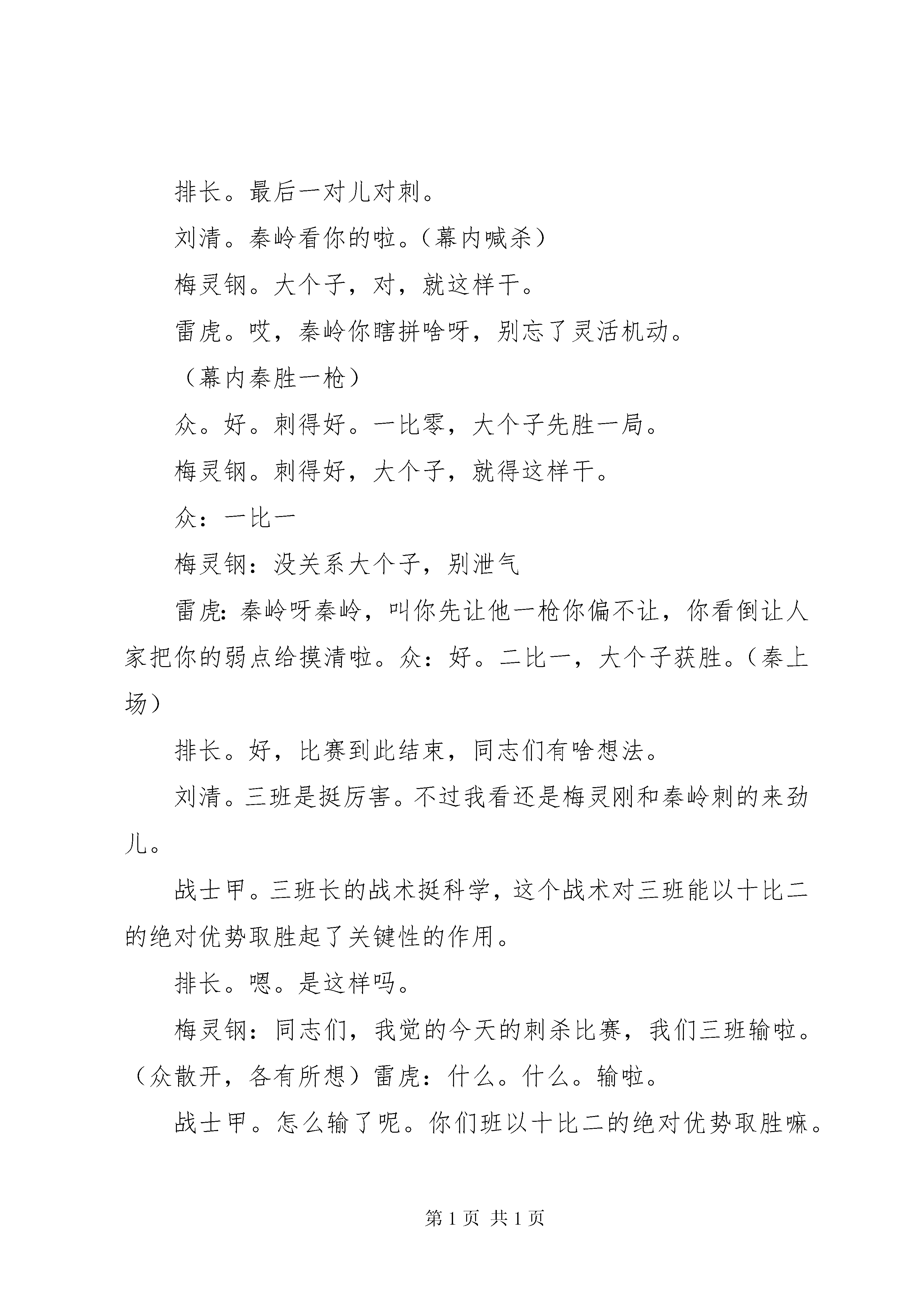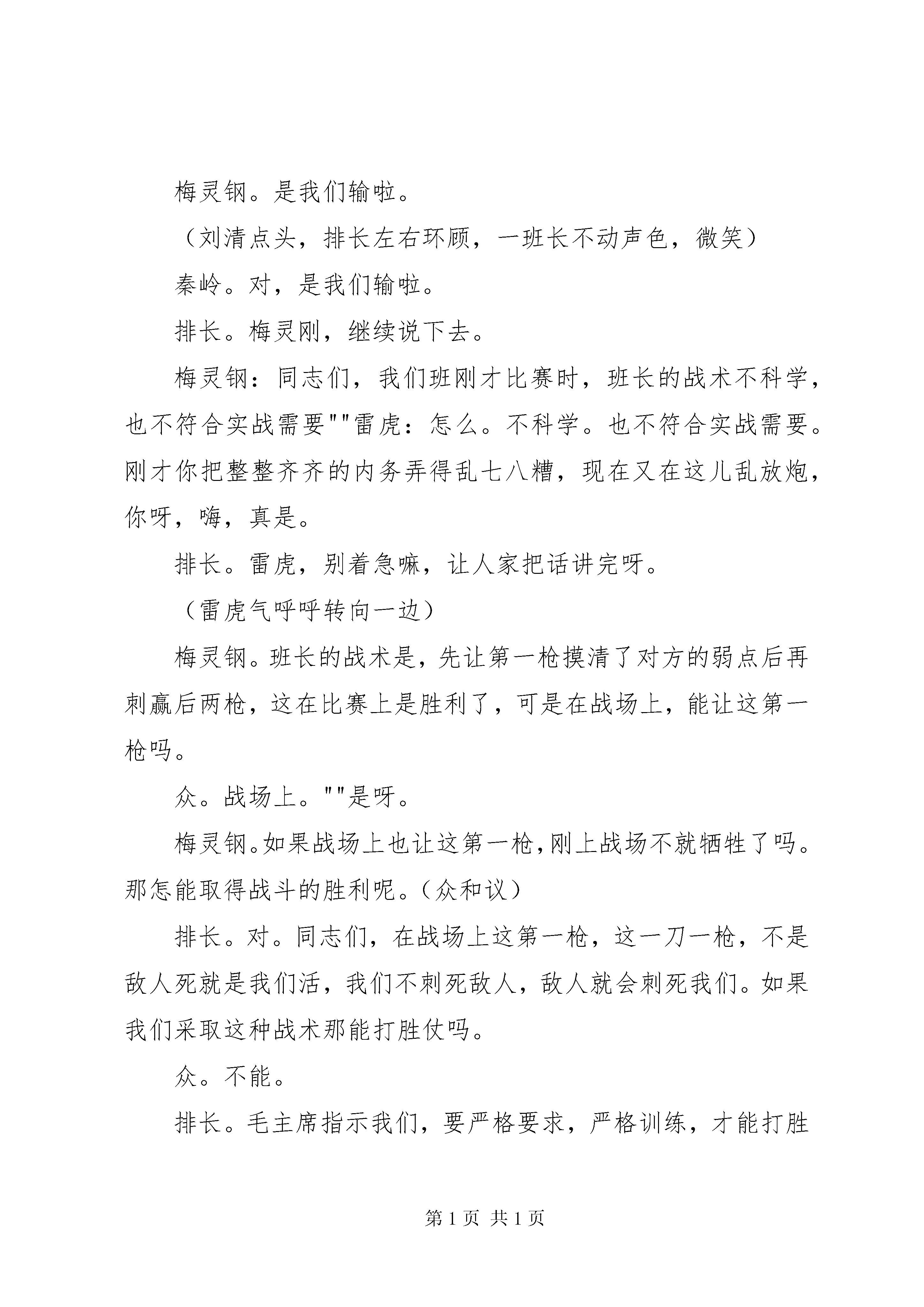 第PAGE\*Arabic\*MERGEFORMAT11页共NUMPAGES\*MERGEFORMAT11页军队部队双拥工作报告部队军队军人话剧剧本《新来的战友》(独幕小话剧)一九七二年九月演员表剧中人饰演者梅灵钢王连河雷虎孙其昌秦岭周文寅排长高群利刘清刘玉清三班长高良臣战士甲徐元猛时间:某日晚饭后地点。操场一角右后方是三班宿舍,墙上整齐地挂着一排挎包。幕内排长喊。三班长。雷虎。到。(跑上场)排长。(幕内喊)你们班新调来的战友,一会就到,你们准备一下。雷虎。是。说到他就到,真带劲儿。(向观众)