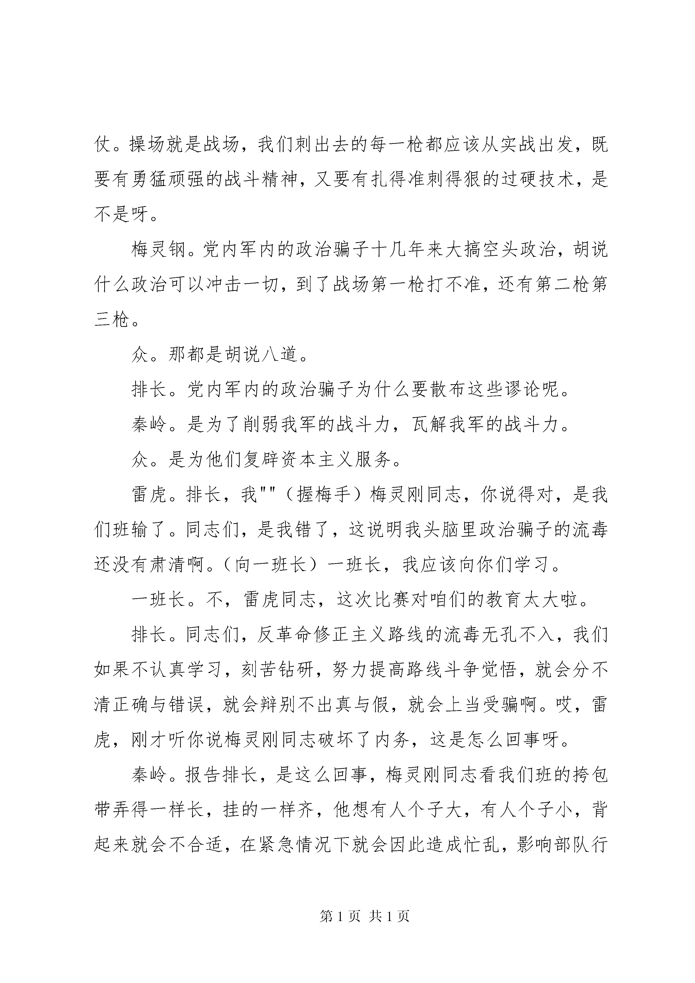 军队部队双拥工作报告部队军队军人话剧剧本《新来的战友》(独幕小话剧)一九七二年九月演员表剧中人饰演者梅灵钢王连河雷虎孙其昌秦岭周文寅排长高群利刘清刘玉清三班长高良臣战士甲徐元猛时间:某日晚饭后地点。操场一角右后方是三班宿舍,墙上整齐地挂着一排挎包。幕内排长喊。三班长。雷虎。到。(跑上场)排长。(幕内喊)你们班新调来的战友,一会就到,你们准备一下。雷虎。是。说到他就到,真带劲儿。(向观众)听说这个新调来的战友哇,爱学习,肯钻研,战备观念强,路线斗争觉悟高。无产阶级革命战士嘛,路线斗