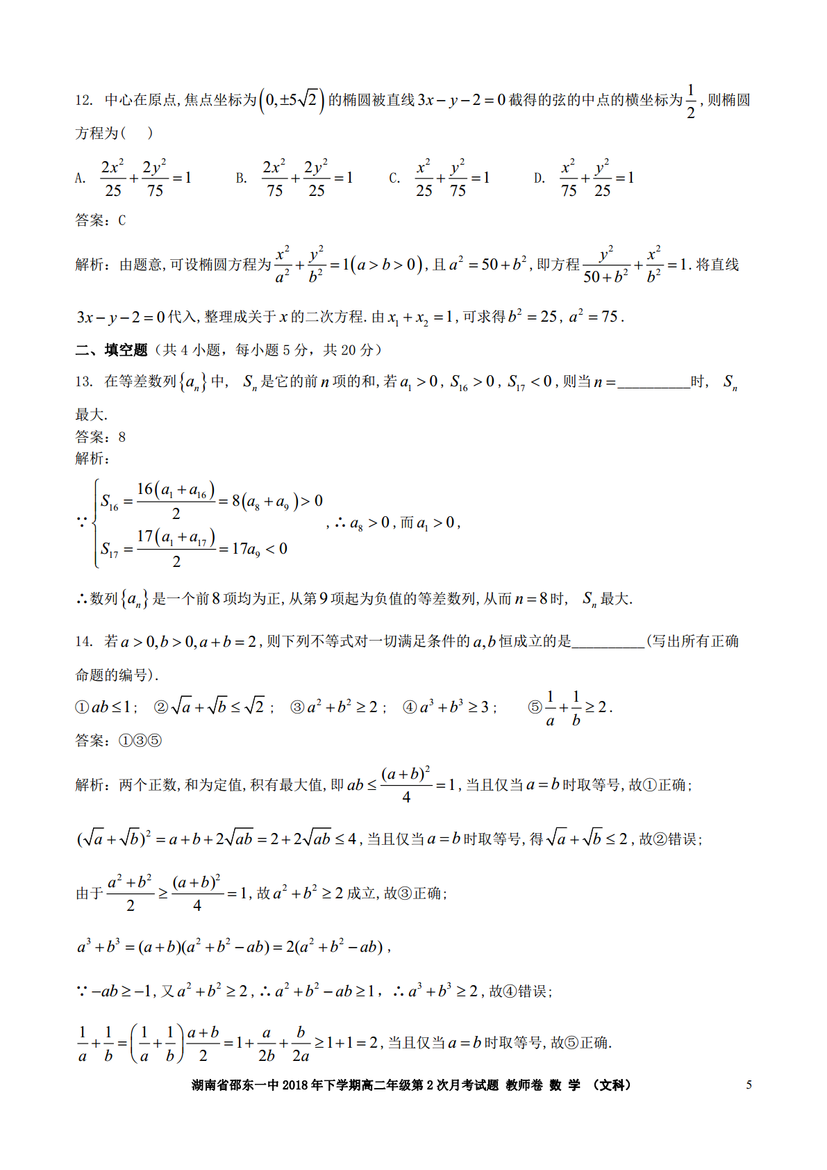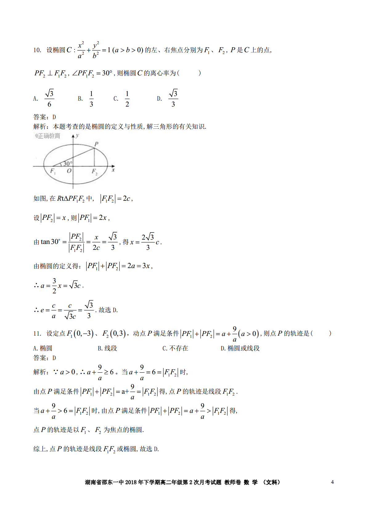 湖南省邵东一中2018年下学期高二年级第2次月考试题数学(文科)教师卷本试题卷分为选择题和非选择题两部分。时量120分钟总分150分。考生务必将答案答在答题卡上在试卷上作答无效。一、选择题(共12小题每小题只有一个选项正确每小题