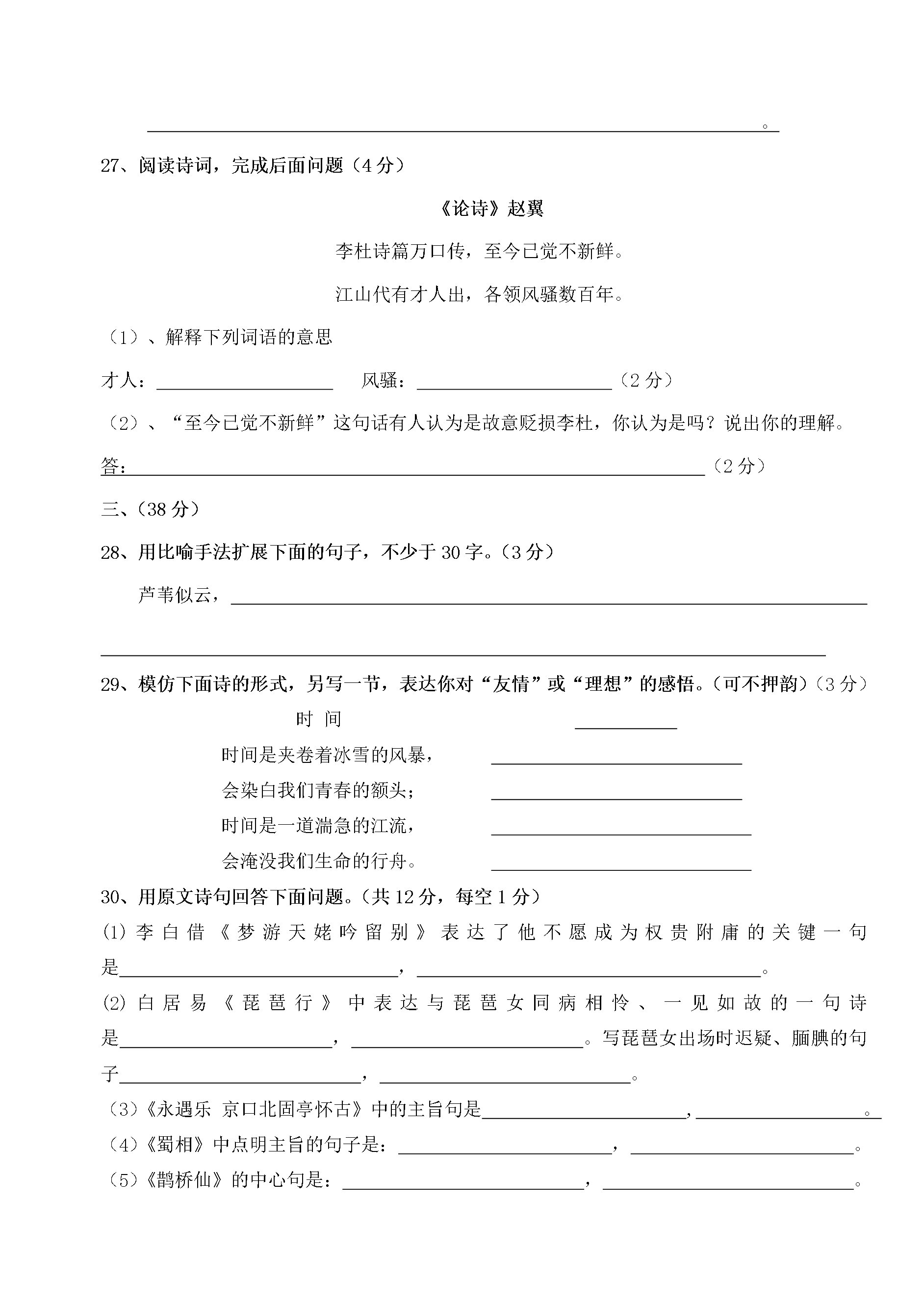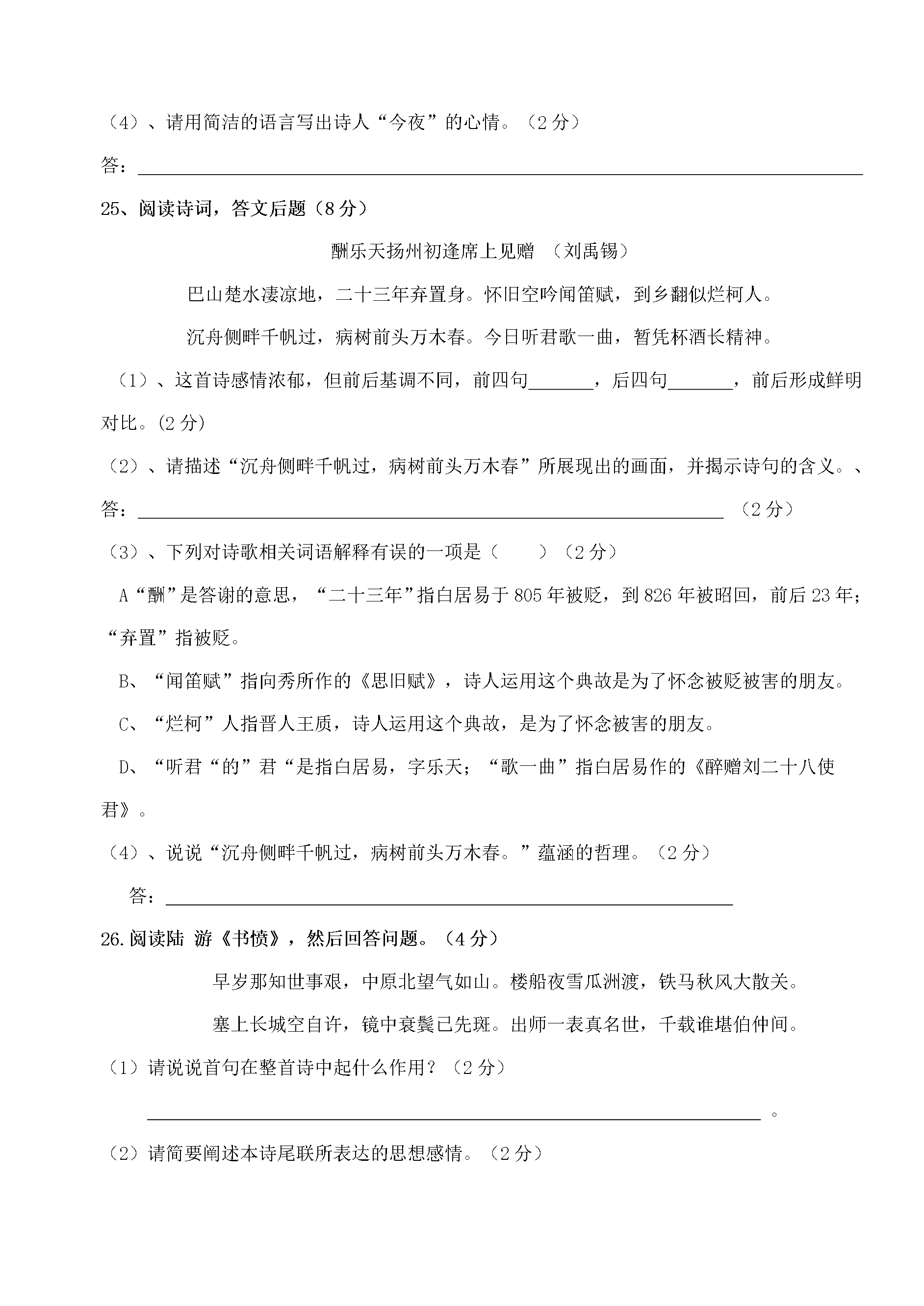 广西省崇左市龙州中学2006年高二语文第二单元检测卷(分值120分时量90分钟)一、选择题(38分每小题2分)1、下列加点字注音正确的一项是()A、渌水(lù)贾人(jiǎ)脚著(zhuó)B、青冥(míng)嘈嘈(cáo)呕哑(ōuyā)C、幽咽(yàn)大弦(xián)琵琶(pa)D、祠堂(cí)衰鬓(shuāi)潦倒(liǎo)2、下列加点词解释正确的一项是()A、觉时(睡觉)殷岩泉(震响)列缺(指闪电)B、左迁(贬官)耳暂明(暂时)