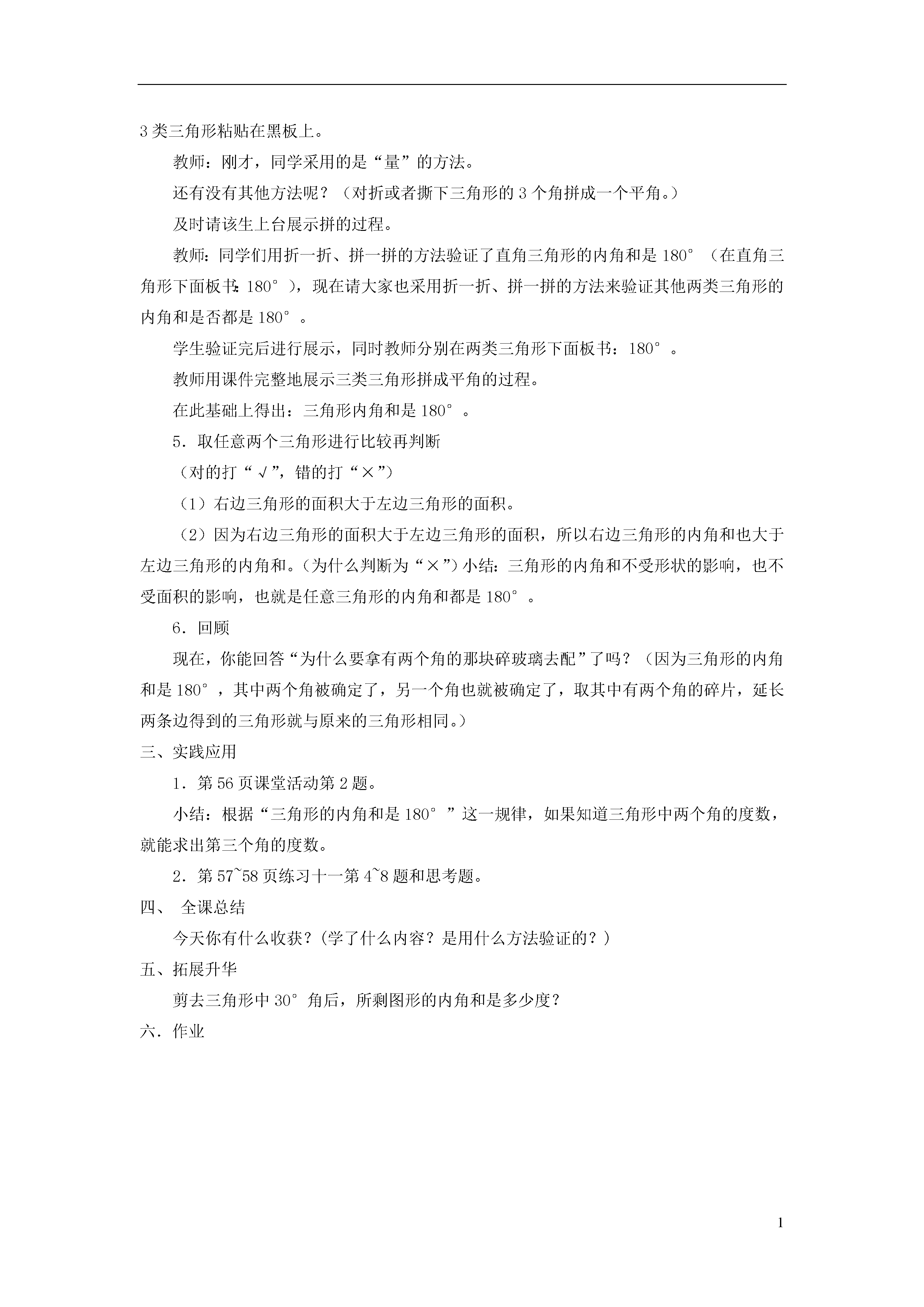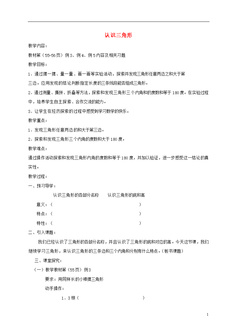 1认识三角形教学内容:教材第(55-56页)例3、例4、例5内容及相关习题教学目标:1.通过摆一摆、量一量、画一画等实验活动,探索并发现三角形任意两边之和大于第三边。应用发现的结论判断指定长度的三条线段能否组成三角形。2.通过测量、撕拼、折叠等方法,探索和发现三角形三个内角和的度数和等于180度。在实验过程中,培养学生自主探索、合作交流的能力。3.让学生在经历探索的过程中感受到学习数学的快乐。教学重点:1.发现三角形任意两边的和大于第三边。2.探索和发现三角形三个内角的