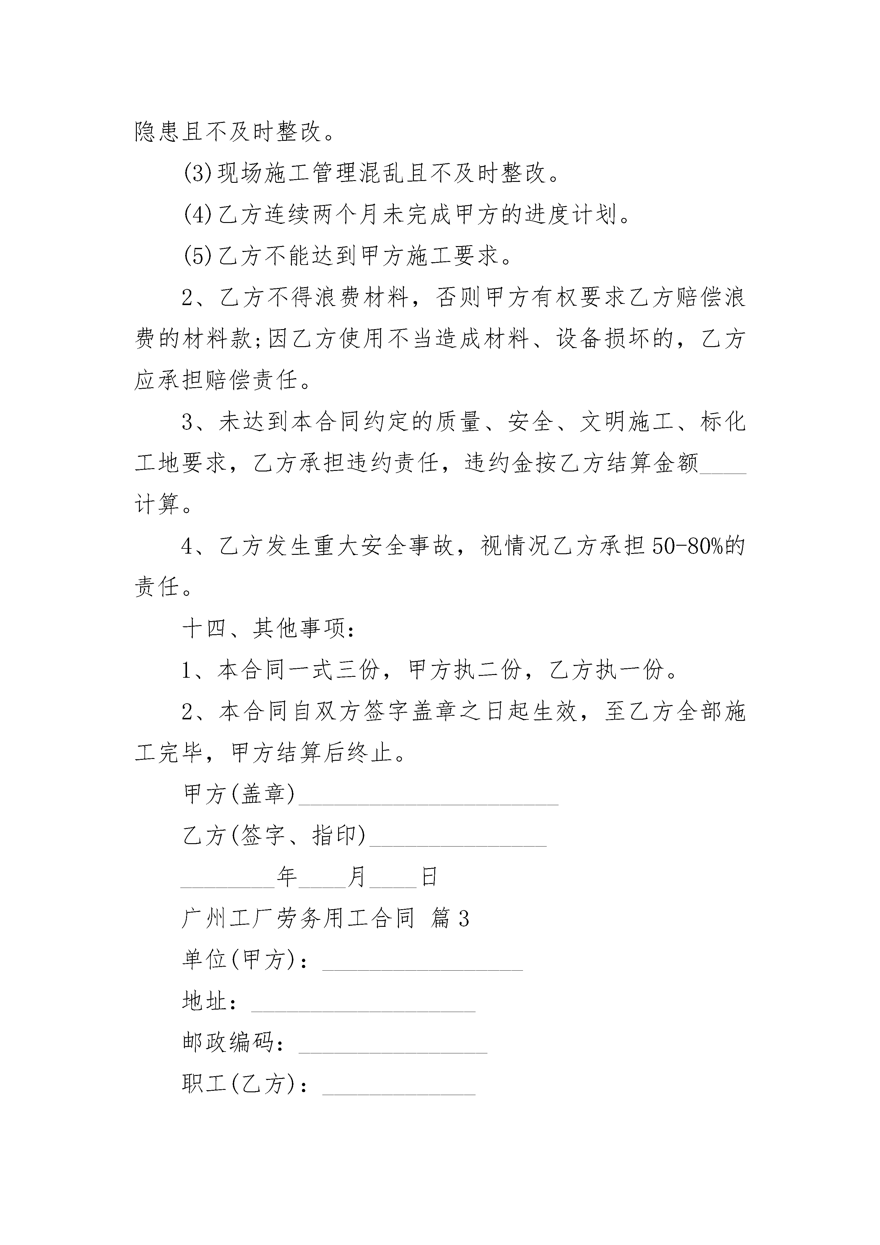 广州工厂劳务用工合同广州工厂劳务用工合同随着法律观念的深入人心,合同的类型越来越多,合同是对双方的保障又是一种约束。相信大家又在为写合同犯愁了吧,下面是小编精心整理的广州工厂劳务用工合同,欢迎阅读与收藏。广州工厂劳务用工合同1甲方:_________________________乙方:_________________________鉴于甲方业务发展的需要,雇佣乙方为_______________提供劳务服务,经双方协商订立正式《劳务雇佣合同书》如下:一、合同期限第一条:本合同于________年___