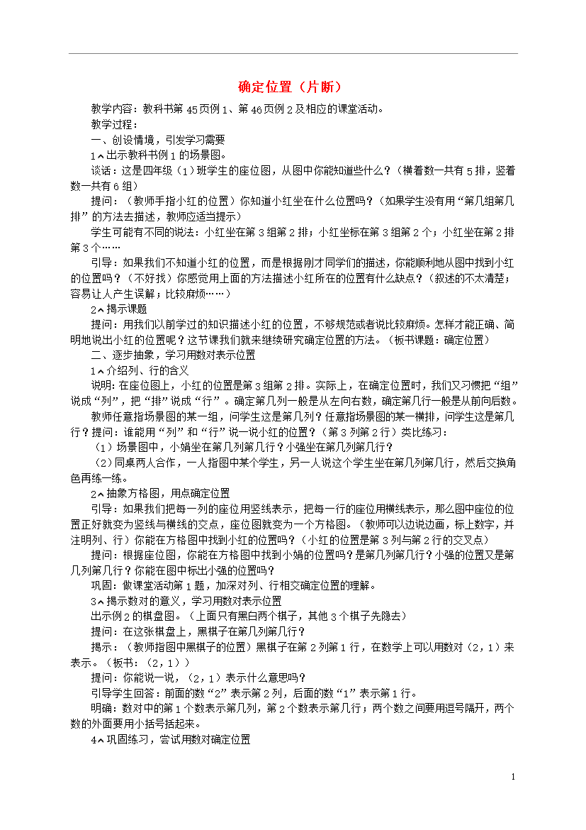 确定位置(片断)教学内容:教科书例1、例2及相应的课堂活动。教学过程:一、创设情境,引发学习需要1出示教科书例1的场景图。谈话:这是四年级(1)班学生的座位图,从图中你能知道些什么?(横着数一共有5排,竖着数一共有6组)提问:(教师手指小红的位置)你知道小红坐在什么位置吗?(如果学生没有用“第几组第几排”的方法去描述,教师应适当提示)学生可能有不同的说法:小红坐在第3组第2排;小红坐标在第3组第2个;小红坐在第2排第3个……引导:如果我们不知道小红的位置,而是根据刚才同学们的描述,你能顺利地从图中找到小