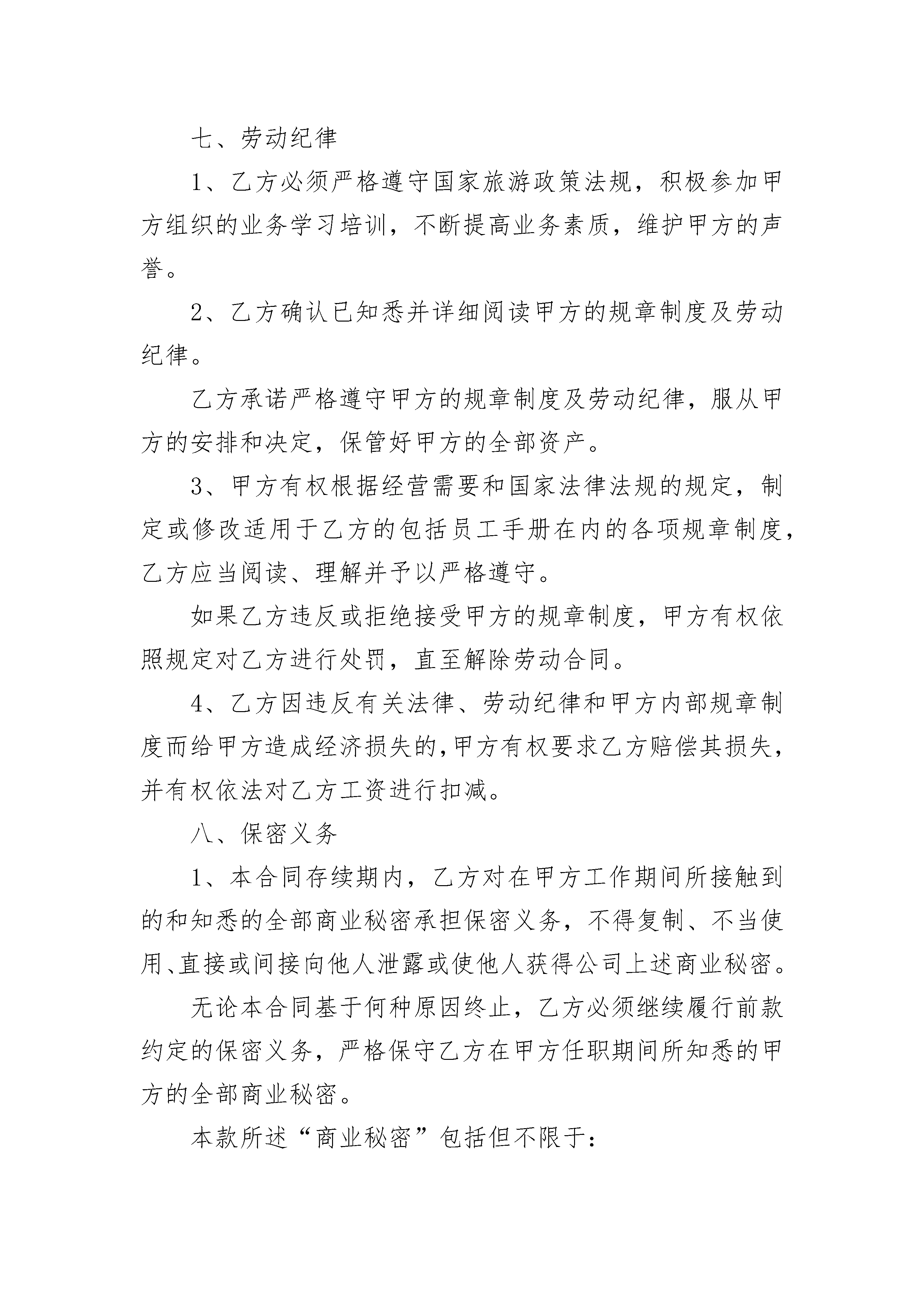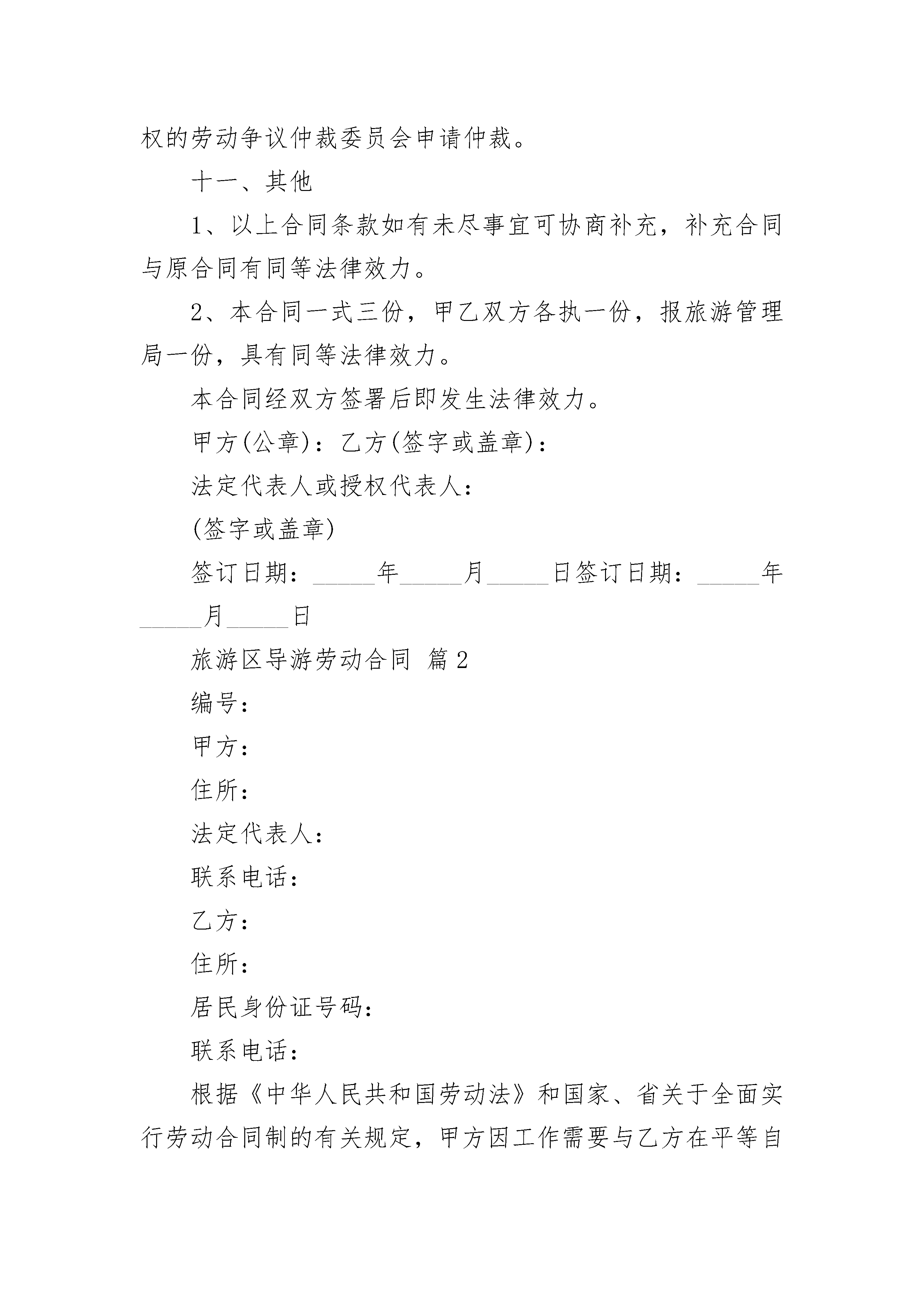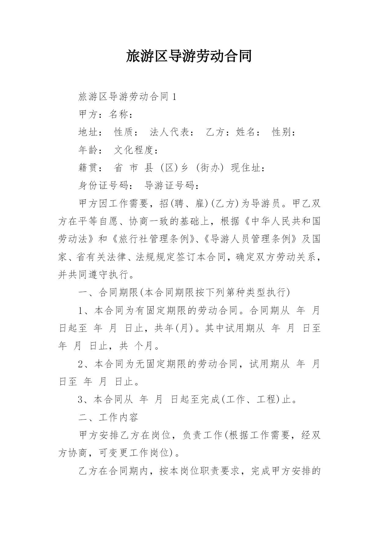 旅游区导游劳动合同旅游区导游劳动合同在人民愈发重视法律的社会中,合同对我们的帮助越来越大,合同是对双方的保障又是一种约束。你所见过的合同是什么样的呢?以下是小编帮大家整理的旅游区导游劳动合同,欢迎阅读与收藏。旅游区导游劳动合同1甲方:名称:地址:性质:法人代表:乙方:姓名:性别:年龄:文化程度:籍贯:省市县(区)乡(街办)现住址:身份证号码:导游证号码:甲方因工作需要,招(聘、雇)(乙方)为导游员。甲乙双方在平等自愿、协商一致的基础上,根据《中华人民共和国劳动法》和《旅行社管理条例》、《导游人员管理条例》