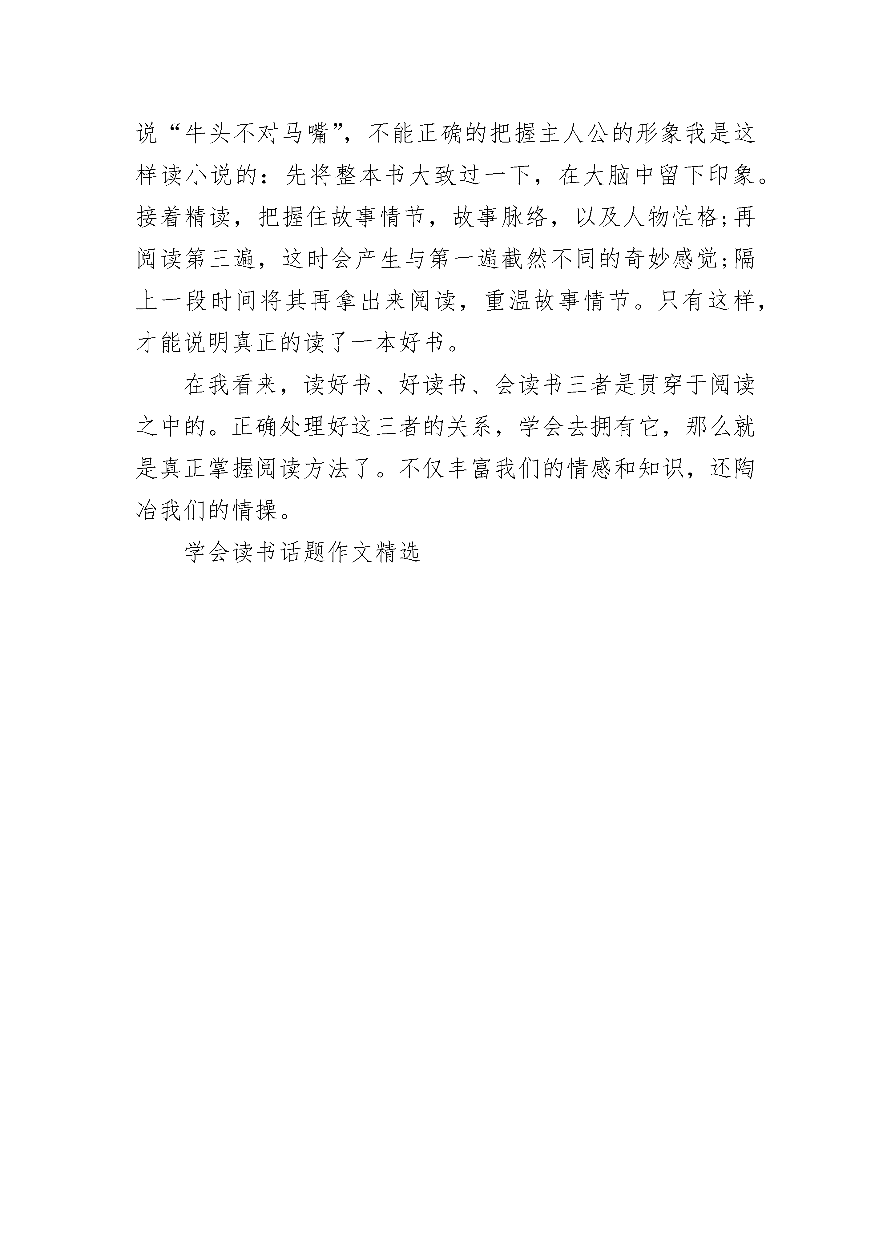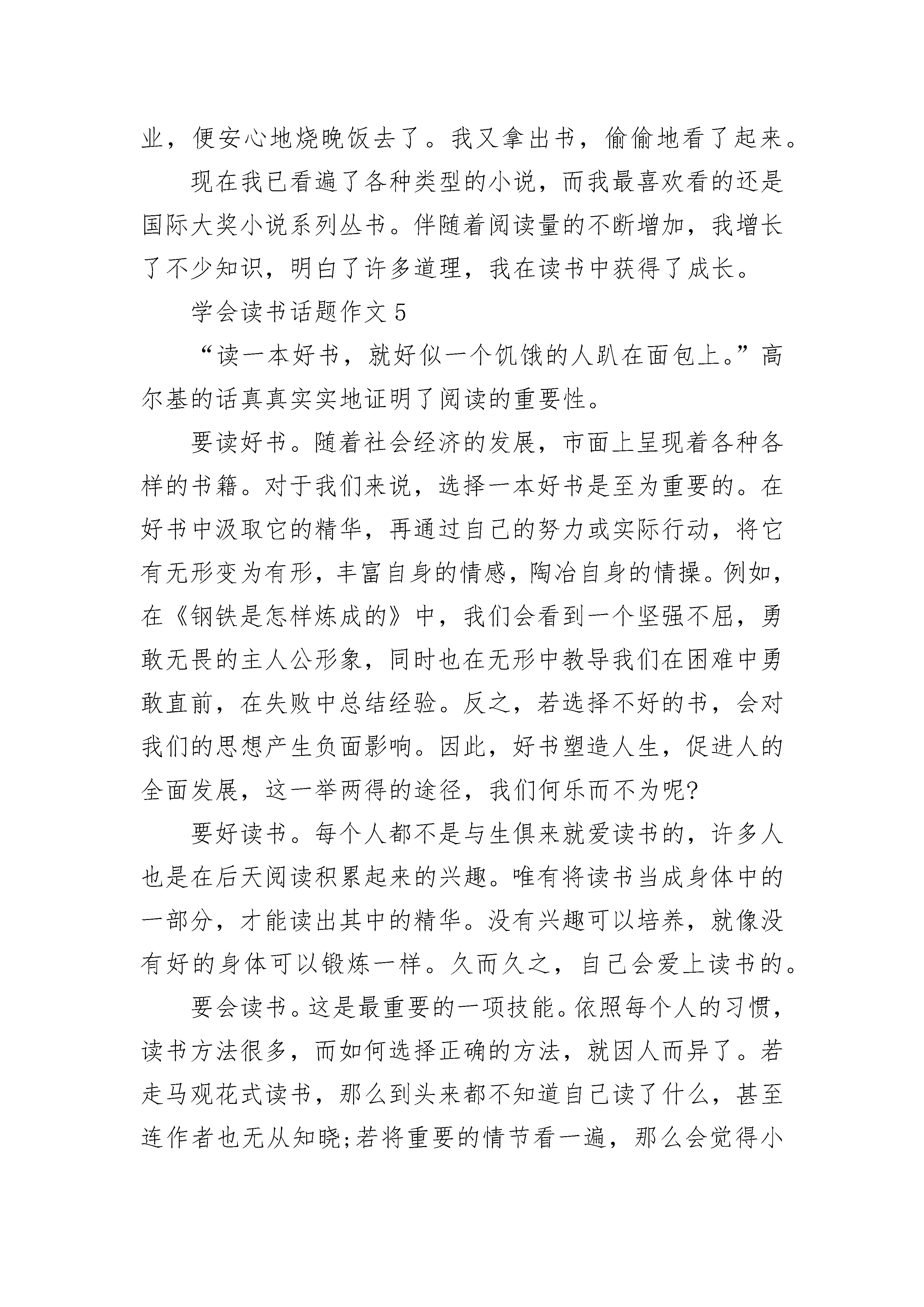 学会读书话题作文精选读书是一种享受,我们可以在享受中得到体会;读书是一种体会,我们可以在体会中得到乐趣;读书是一种乐趣,我们可以在乐趣中得到知识。对于农民来说,粮食是他的财富;对于商人来说,金钱是他的财富;而对于我来说,书,是我的财富。书籍是人类进步的阶梯,这是名人高尔基先生说的。人类因此而进步,是因为有书籍的帮助。书籍,它可以引导我们奋力前进,更进一步。多读书,会使我们脱离庸俗,脱离无知,走到那里仿佛都有一种属于书的清香伴随着我们,书香弥漫。书籍,它教导我们要脚踏实地,问心无愧地迈向成功。书籍,它能