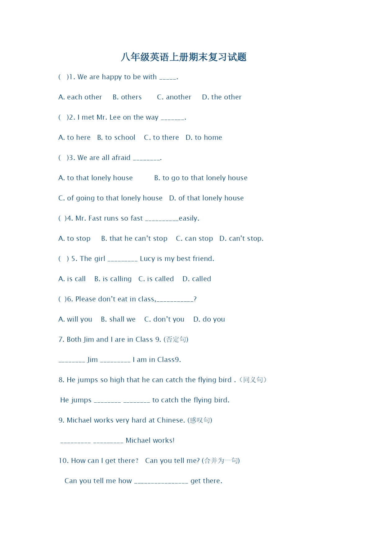 八年级英语上册期末复习试题()1.Wearehappytobewith_____.A.eachotherB.othersC.anotherD.theother()2.ImetMr.Leeontheway_______.A.tohereB.toschoolC.tothereD.tohome()3.Weareallafraid________.A.tothatlonelyhouseB.togotothatlonelyhouseC.ofgoingtothatlonelyhouseD.ofthatlonelyho