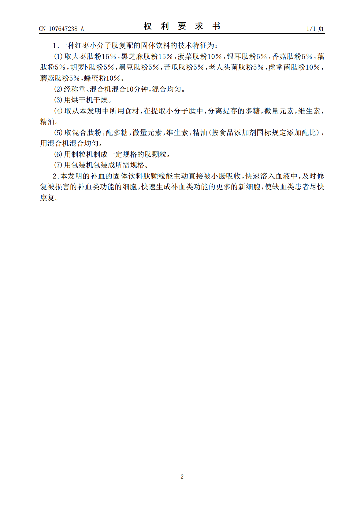 一种红枣小分子肽复配的固体饮料及其制备方法,属于固体饮料加工技术领域,提供了一种市场缺少的高营养功能食品。以大枣肽粉,银耳肽粉,虎掌菌肽粉,蘑菇肽粉,黑芝麻肽粉,香菇肽粉,菠菜肽粉,藕肽粉,胡萝卜肽粉,黑豆肽粉,苦瓜肽粉,老人头菌肽粉这些小分子肽粉具有补血的作用。蜂蜜是长寿食物。以这些为主料再取多糖、维生素。微量元素。精油等做辅料。这些主料和辅料经过称量、按不同占比混合,制颗粒、干燥、包装制成肽颗粒。具有补血的功效。