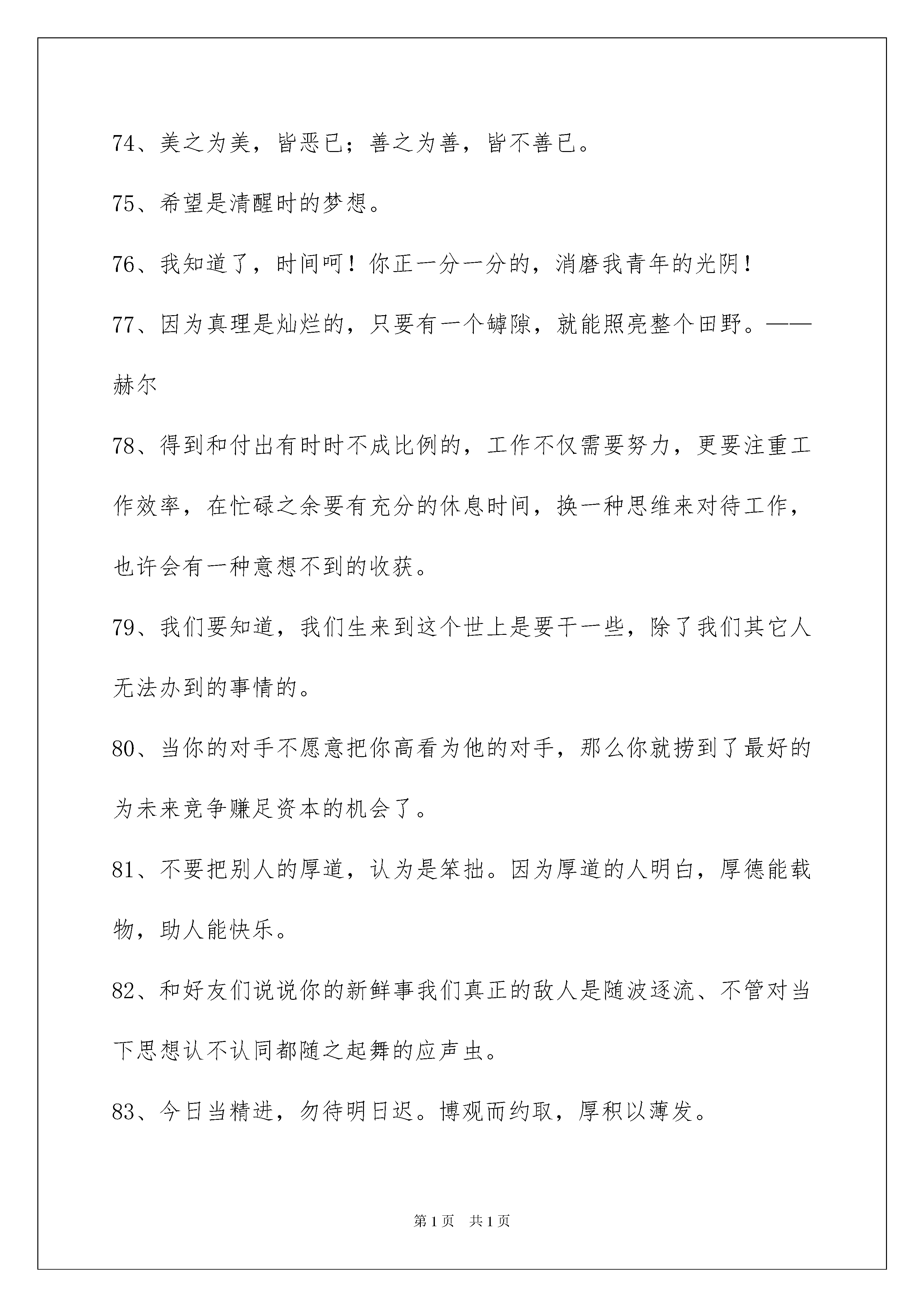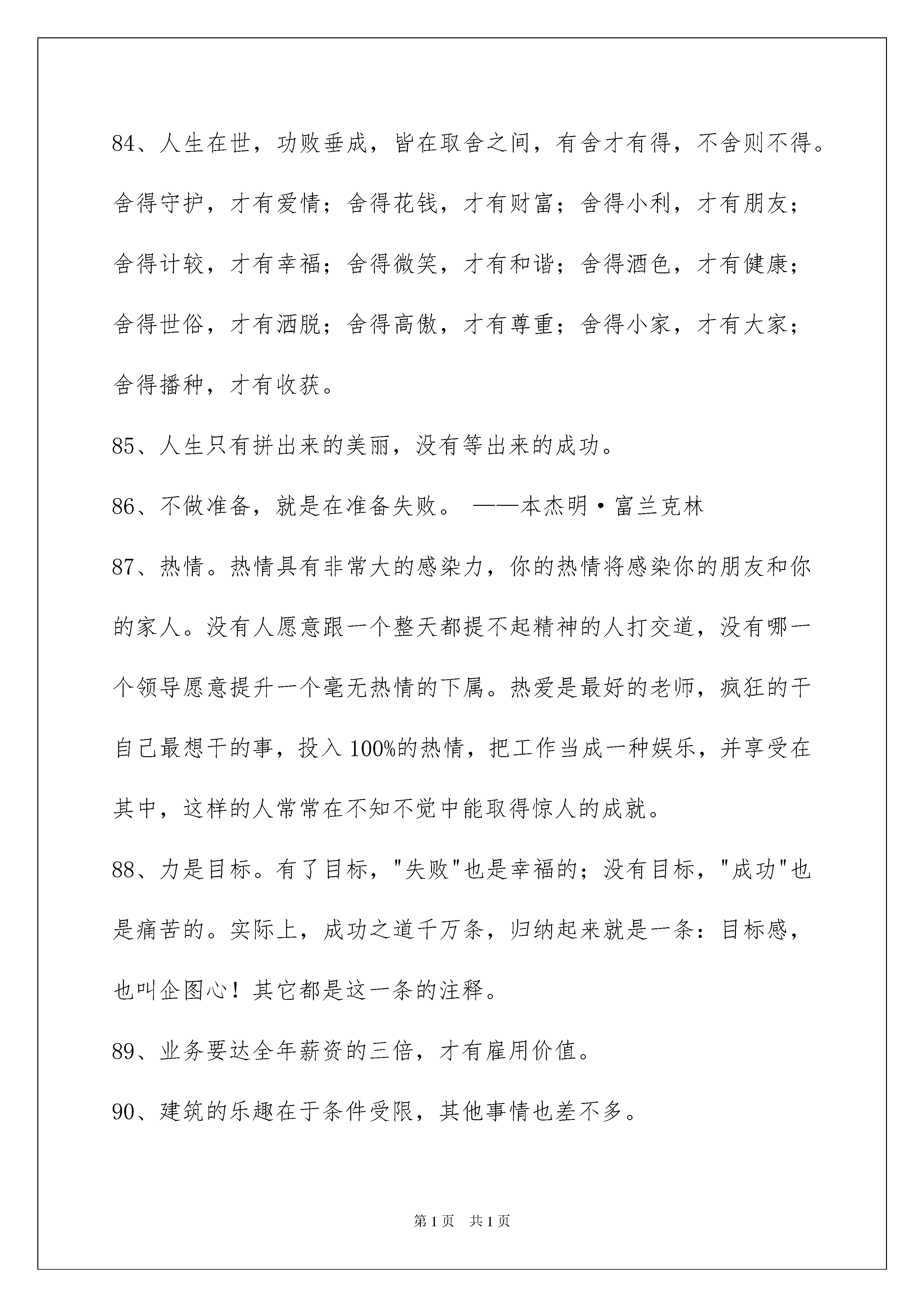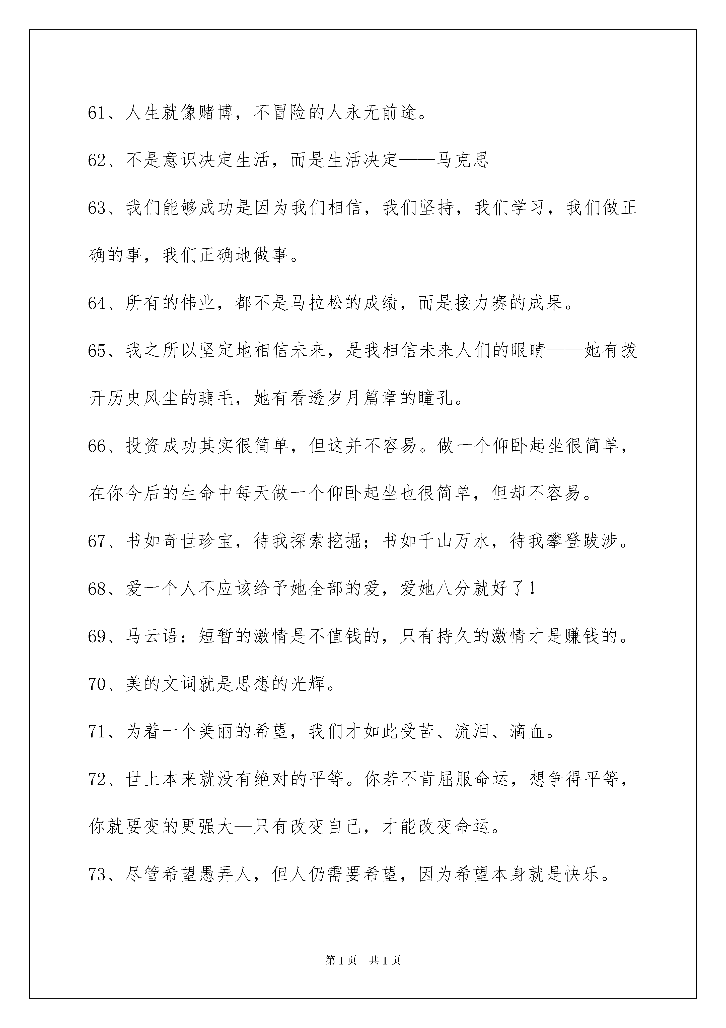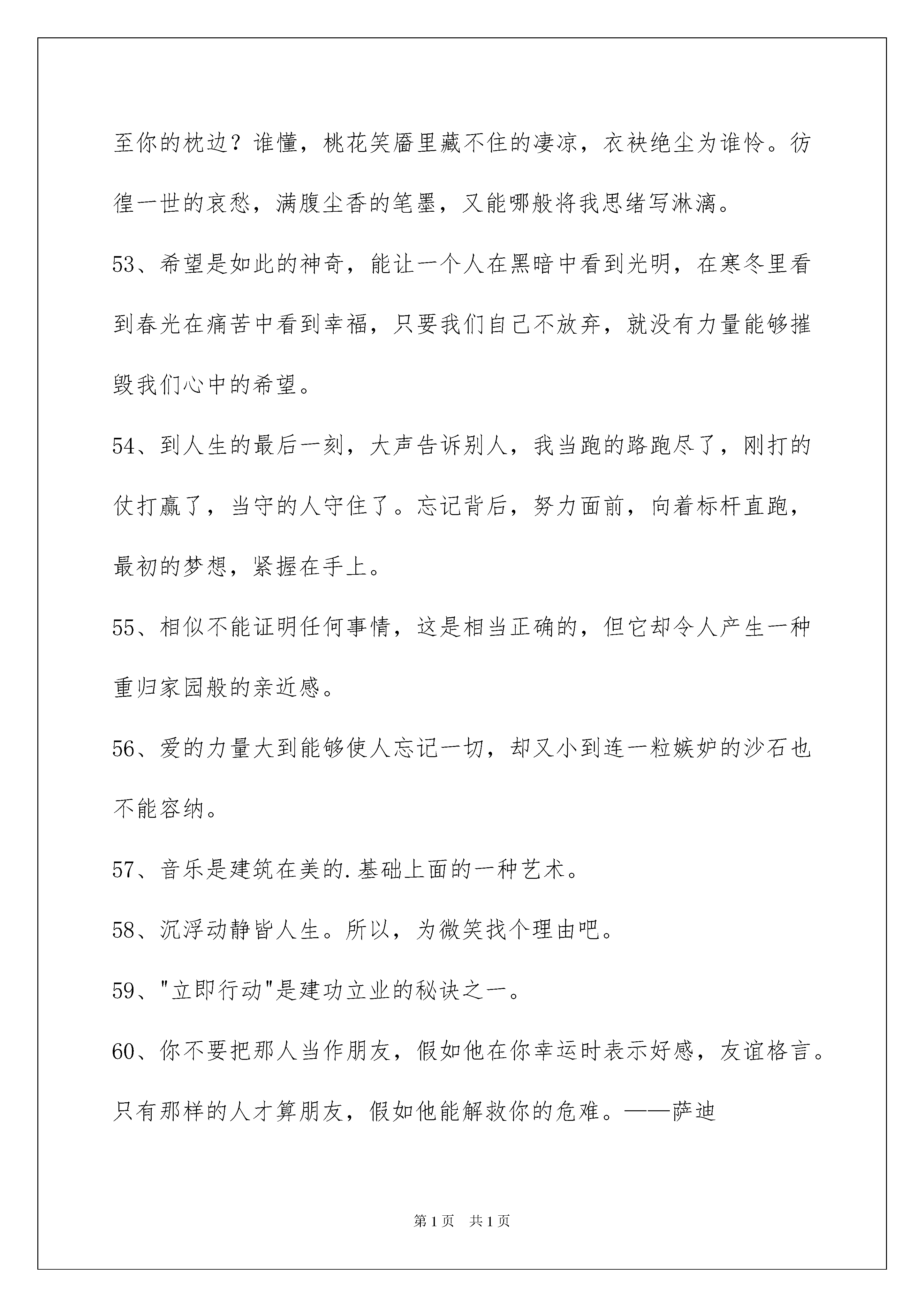 2022年感悟人生的格言汇编40条1、不论是多情的诗句,漂亮的文章,还是闲暇的欢乐,什么都不能代替无比亲密的友谊。[俄国·诗人]普希金2、逆境,是天才的进身之阶;信徒的洗礼之水;能人的无价之宝;弱者的无底之渊。人的生命的大部分都是致力于从心灵深处来拔掉自己青年时代的幼芽、这种手术就叫做经验的获得。3、科学把人类生存的规律简化到可怕的程度;一方面让你受尽人间的痛苦,另一方面却又命令你作乐。4、荣誉这东西,不会给一个偷盗它、但配不上它的人带来愉快;它只有在一个配得上它的人的心里才会引起不断的颤动。——[俄国]