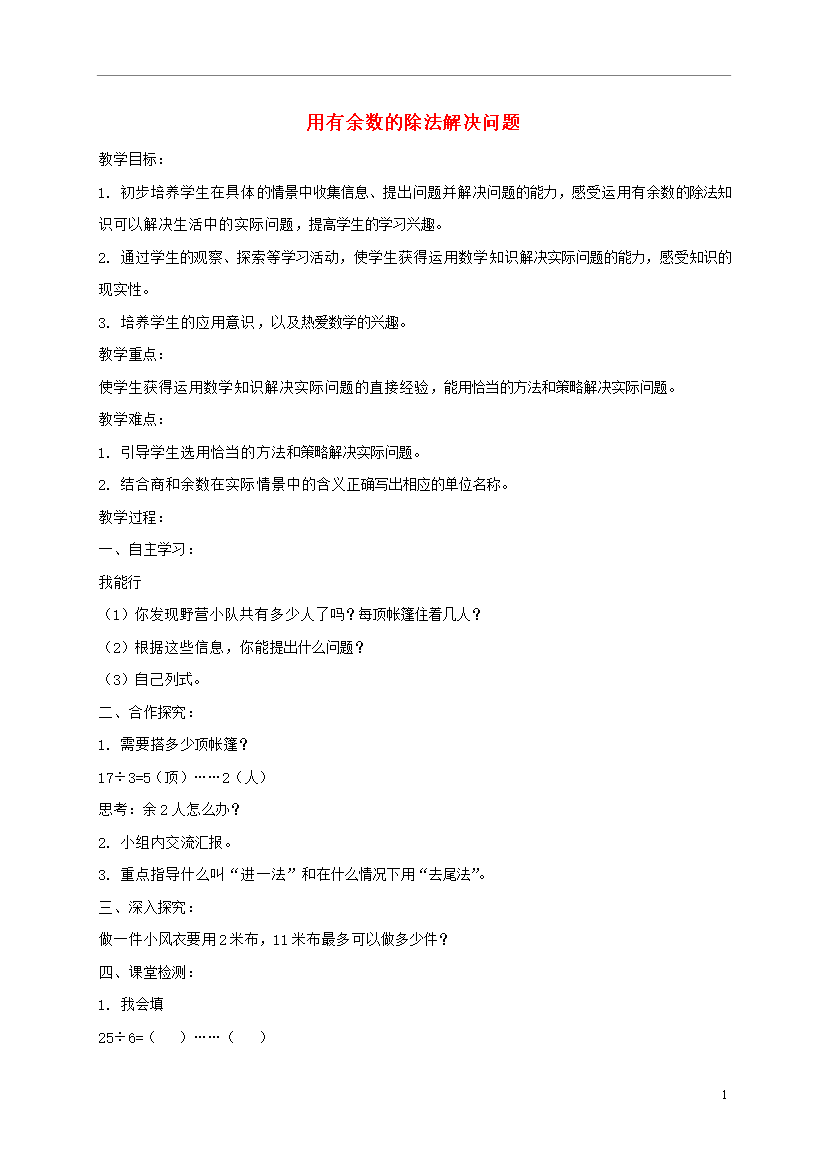 1用有余数的除法解决问题教学目标:1.初步培养学生在具体的情景中收集信息、提出问题并解决问题的能力,感受运用有余数的除法知识可以解决生活中的实际问题,提高学生的学习兴趣。2.通过学生的观察、探索等学习活动,使学生获得运用数学知识解决实际问题的能力,感受知识的现实性。3.培养学生的应用意识,以及热爱数学的兴趣。教学重点:使学生获得运用数学知识解决实际问题的直接经验,能用恰当的方法和策略解决实际问题。教学难点:1.引导学生选用恰当的方法和策略解决实际问题。2.结合商和余数在实