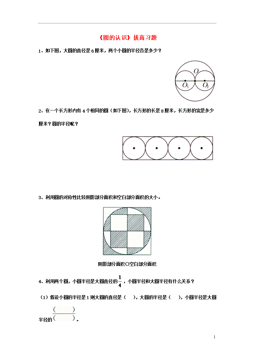 《圆的认识》拔高习题1、如下图大圆的直径是6厘米两个小圆的半径各是多少?2、在一个长方形内有4个相同的圆(如下图)长方形的长是8厘米长方形的宽是多少厘米?圆的半径呢?3、利用圆的对称性比较阴影部分面积和空白部分面积的大小。阴影部分面积○空白部分面积4、利用两个圆小圆半径是大圆直径的小圆半径和大圆半径有什么关系?(1)假设小圆的半径是1则大圆的直径是()大圆的半径是()小圆半径是大圆半径的。(2)如果小圆半径是大圆直径的则小圆半径是大圆半径的。