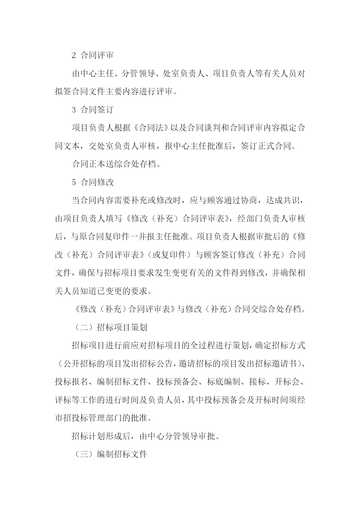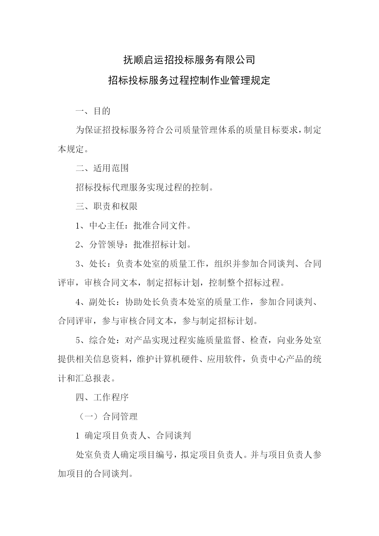抚顺启运招投标服务有限公司招标投标服务过程控制作业管理规定一、目的为保证招投标服务符合公司质量管理体系的质量目标要求,制定本规定。二、适用范围招标投标代理服务实现过程的控制。三、职责和权限1、中心主任:批准合同文件。2、分管领导:批准招标计划。3、处长:负责本处室的质量工作,组织并参加合同谈判、合同评审,审核合同文本,制定招标计划,控制整个招标过程。4、副处长:协助处长负责本处室的质量工作,参加合同谈判、合同评审,参与审核合同文本,参与制定招标计划。5、综合处:对产品实现过程实施质量监督、检查,向业务处室