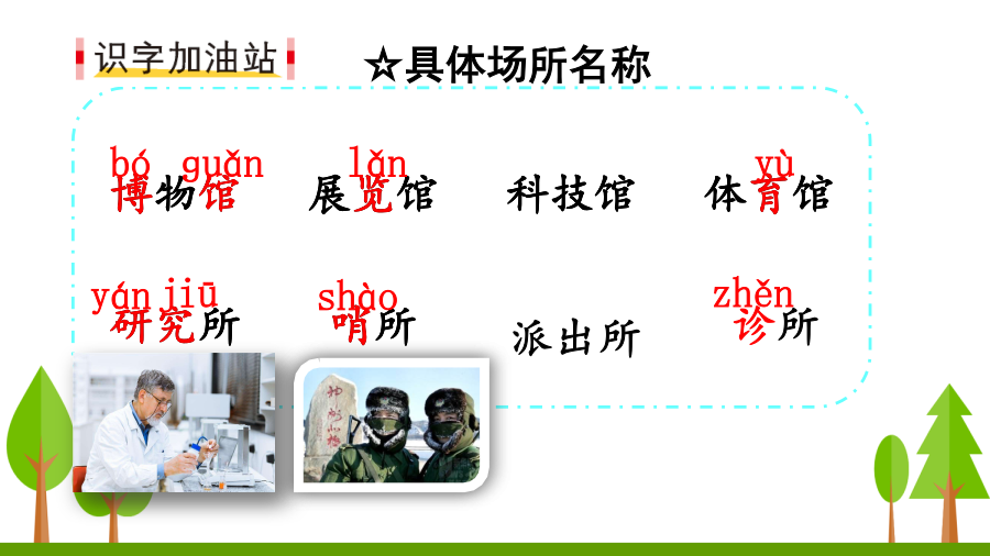 语文园地六海洋馆博物馆展览馆科技馆体育馆研究所哨所状元成才路写字小目标写字时间做到“一尺一寸一拳”下方的两个字,要注意些什么?下方的字,要注意些什么?下面这个字,要注意些什么?下方的字,要注意些什么?状元成才路课堂总结1、把书上的字好好练练。2、课后比一比谁更会猜词语意思。3、预习“语文园地六”后面的内容。