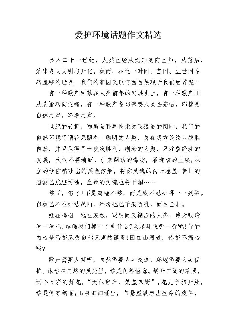 爱护环境话题作文精选步入二十一世纪,人类已经从无知走向已知,从落后、蒙昧走向文明与开化。然而,在这一时间、空间、尘世间斗转星移的世界,我们的家园又以何面目展现于我们面前呢?有一种歌声回荡在人类前年的发展史上,有一种歌声正从欢愉转向低鸣,有一种歌声急切需要人类去感悟,那就是自然之声,环境之声。世纪的转折,物质与科学技术突飞猛进的同时,我们的自然环境可谓花果飘香。聪明的人类,总在想方设法地战胜自然,并且取得了一次次胜利,糊涂的人类,只注重经济的发展,大气不再清新,引来飘荡的毒物,涌进核的尘埃;林立的烟囱喷