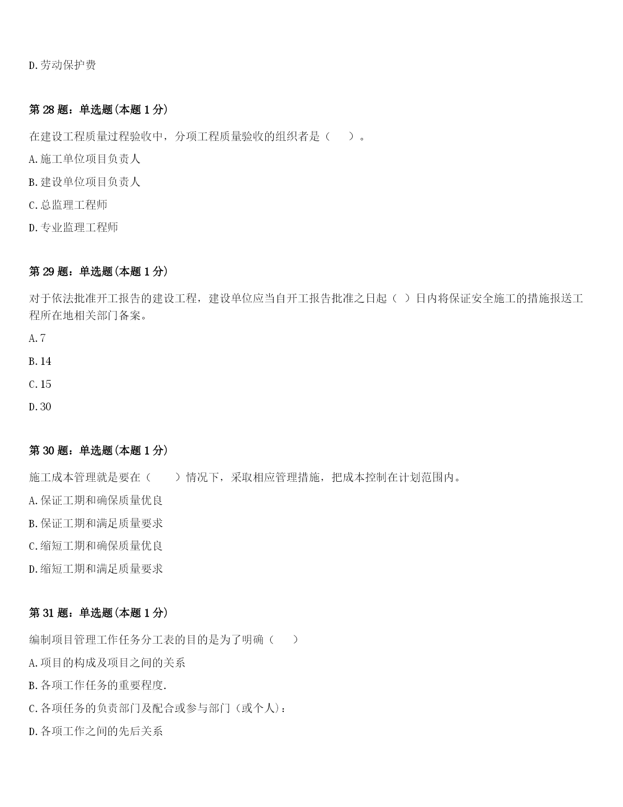 2024年阜阳市颍泉区一级建造师《项目管理》考前冲刺试卷(附答案及解析)第1题:单选题(本题1分)建设工程施工劳务分包合同中,劳务分包人的义务包括()。A.负责与发包人、监理、设计及有关部门联系,协调现场工作关系B.对工程的工期和质量向发包人负责C.严格按照设计图纸、施工验收规范、有关技术要求及施工组织设计精心组织施工,确保工程质量达到约定的标准D.完成水、电、热、电信等施工管线和施工道路,并满足完成本合同劳务作业所需的能源供应和质量要求第2题:单选题(本题1分)在某工程网络计划中,已知工作M的总时差和自