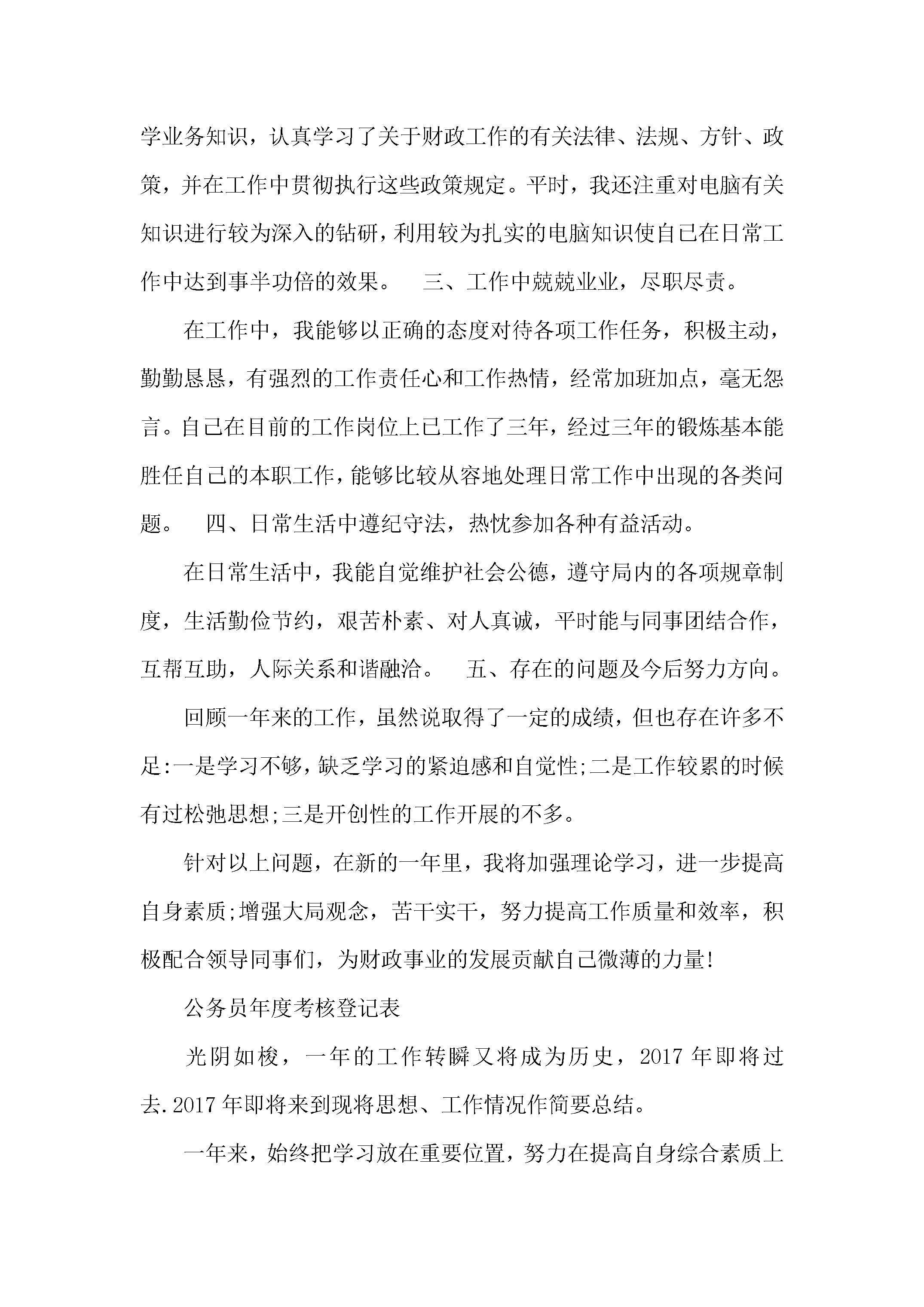 《【公务员年度考核登记表个人总结】公务员年度考核登记表模板》回顾2019年来的工作我在思想上、学习上、工作上都取得了很大的进步成长了不少但也清醒地认识到自己的不足之处在以后的工作中我一定会扬长避短克服不足、认真学习、发奋工作、积极进取、尽快成长把工作做的更好以下是小编分享的公务员年度考核登记表模板希望能帮助到大家!公务员年度考核登记表一年以来在局的领导的正确领导下我很好地履行了工作职责完成了本职工作任务。现将一年来的工作情况作以简要汇报:一、积极向党组织靠拢培养党性政治思想觉悟进一步提高。一年来