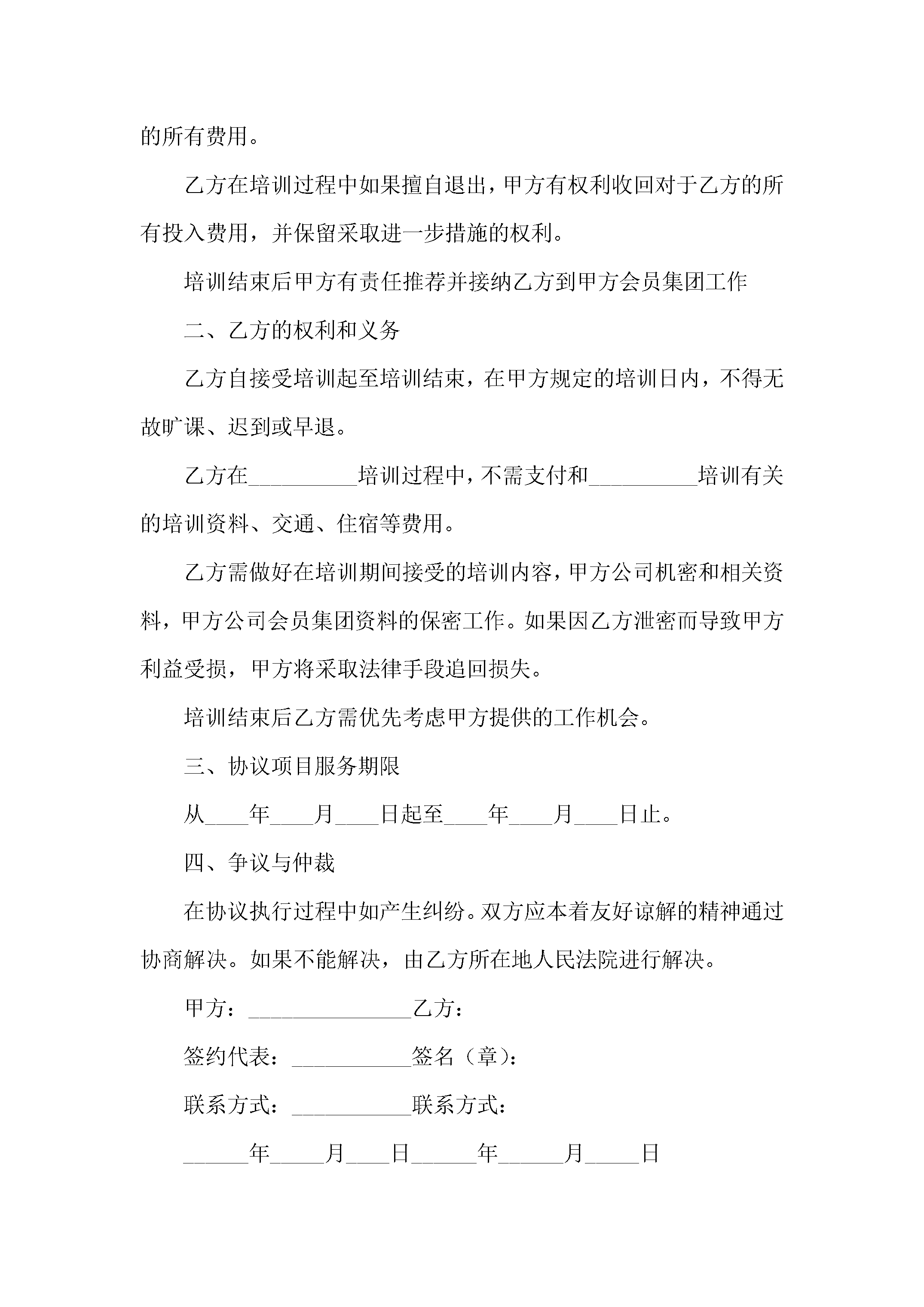 《【培训协议合同范本】有关项目培训合同范本》甲方:乙方:姓名:________________年龄:________________性别:________________出生年月日:__________学校:________________专业:________________学历:________________学号:________________身份证号码:__________乙方已经通过甲方_______________项目的初步面试和考核。甲方可以为乙方提供_______