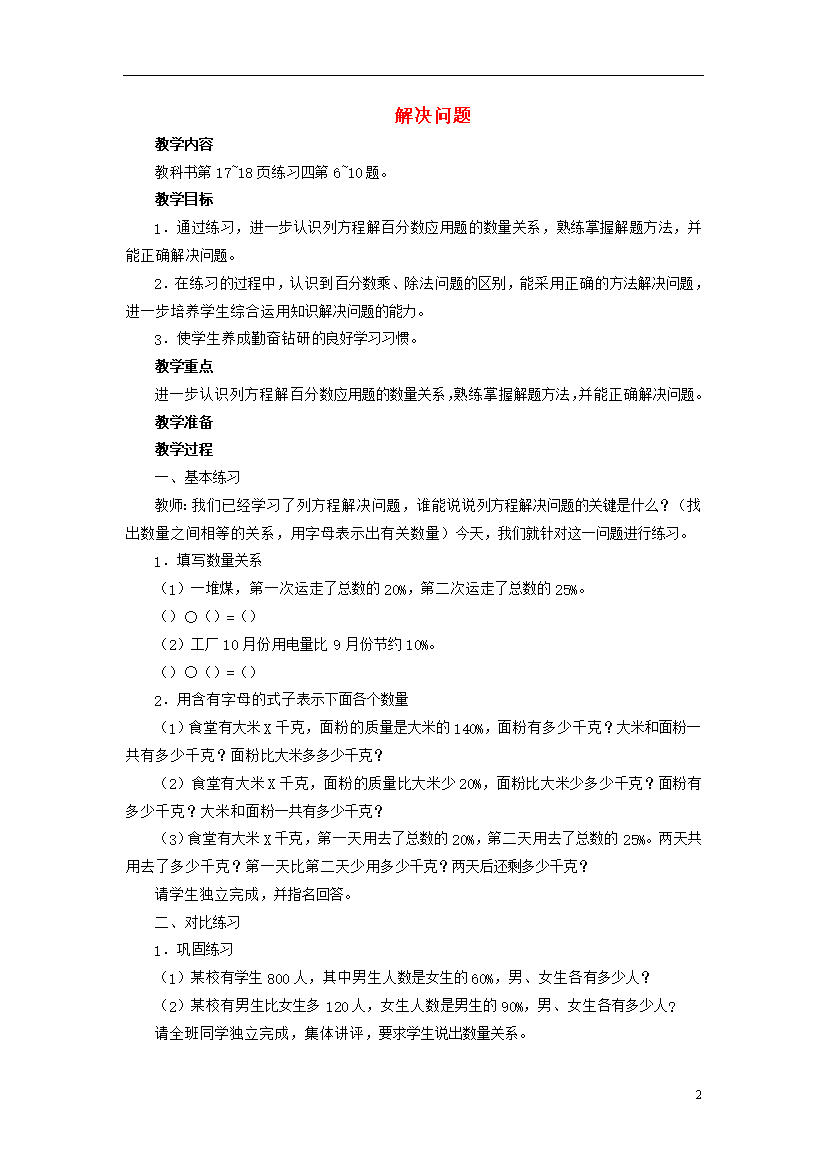 2解决问题教学内容教科书第17~18页练习四第6~10题。教学目标1.通过练习,进一步认识列方程解百分数应用题的数量关系,熟练掌握解题方法,并能正确解决问题。2.在练习的过程中,认识到百分数乘、除法问题的区别,能采用正确的方法解决问题,进一步培养学生综合运用知识解决问题的能力。3.使学生养成勤奋钻研的良好学习习惯。教学重点进一步认识列方程解百分数应用题的数量关系,熟练掌握解题方法,并能正确解决问题。教学准备教学过程一、基本练习教师:我们已经学习了列方程解决问题,谁能