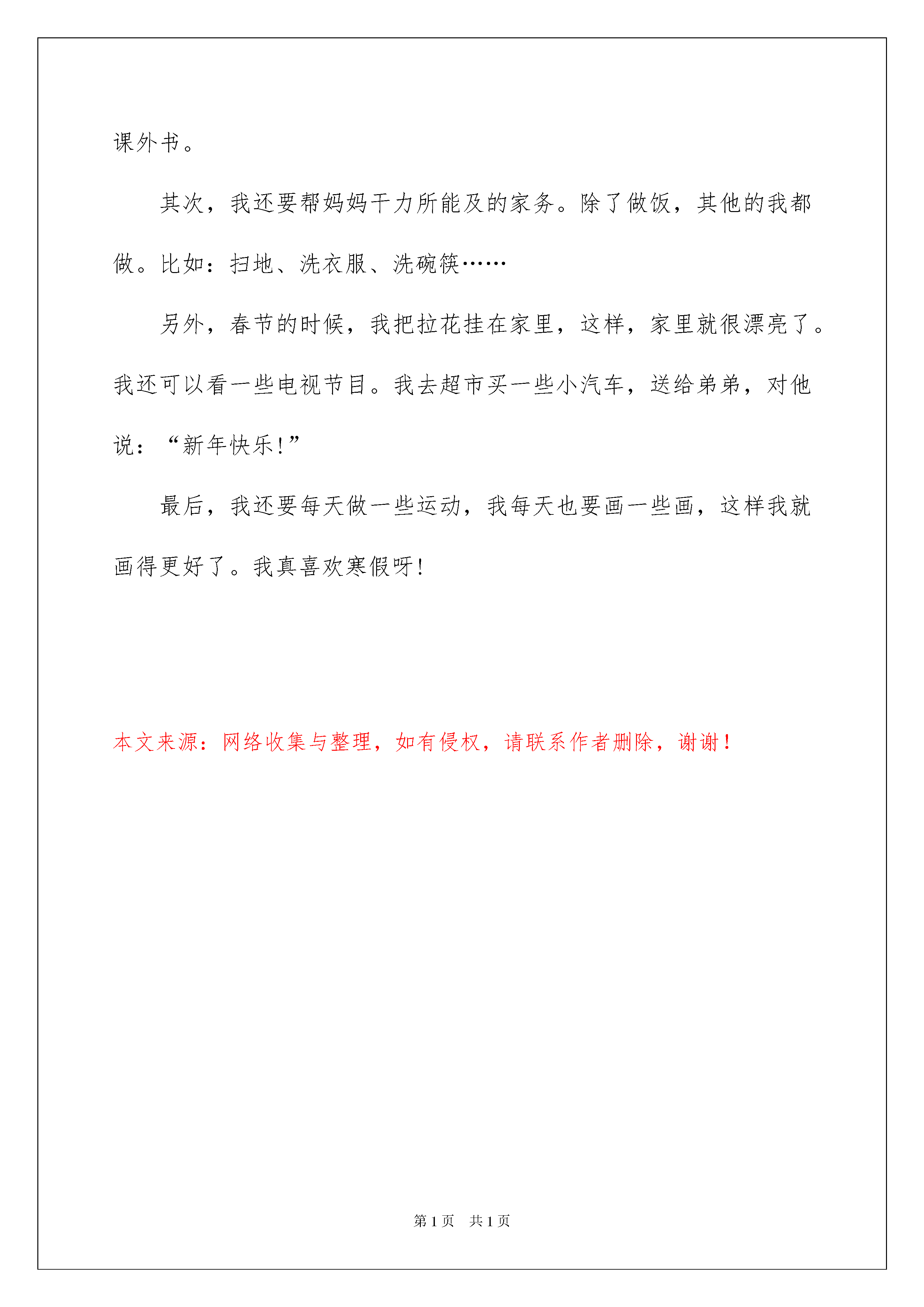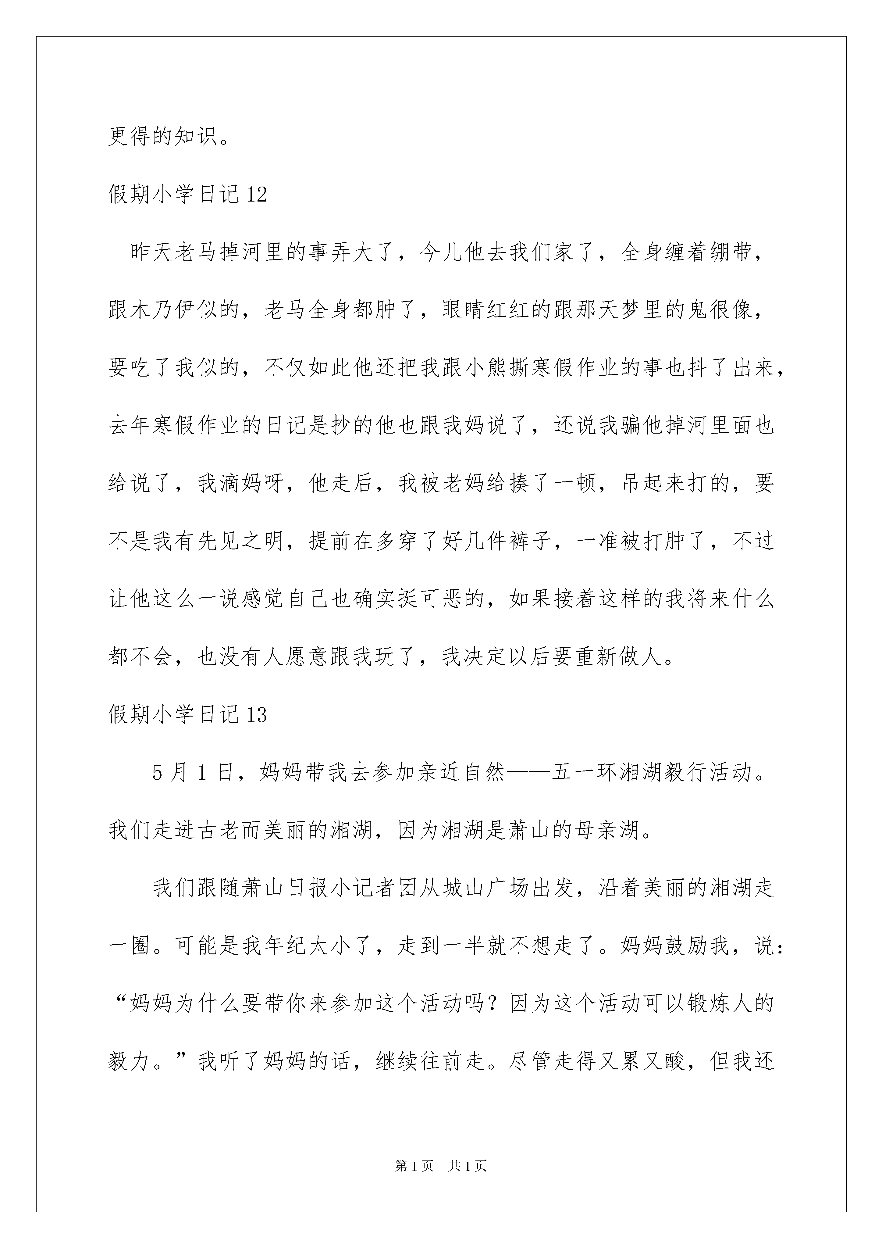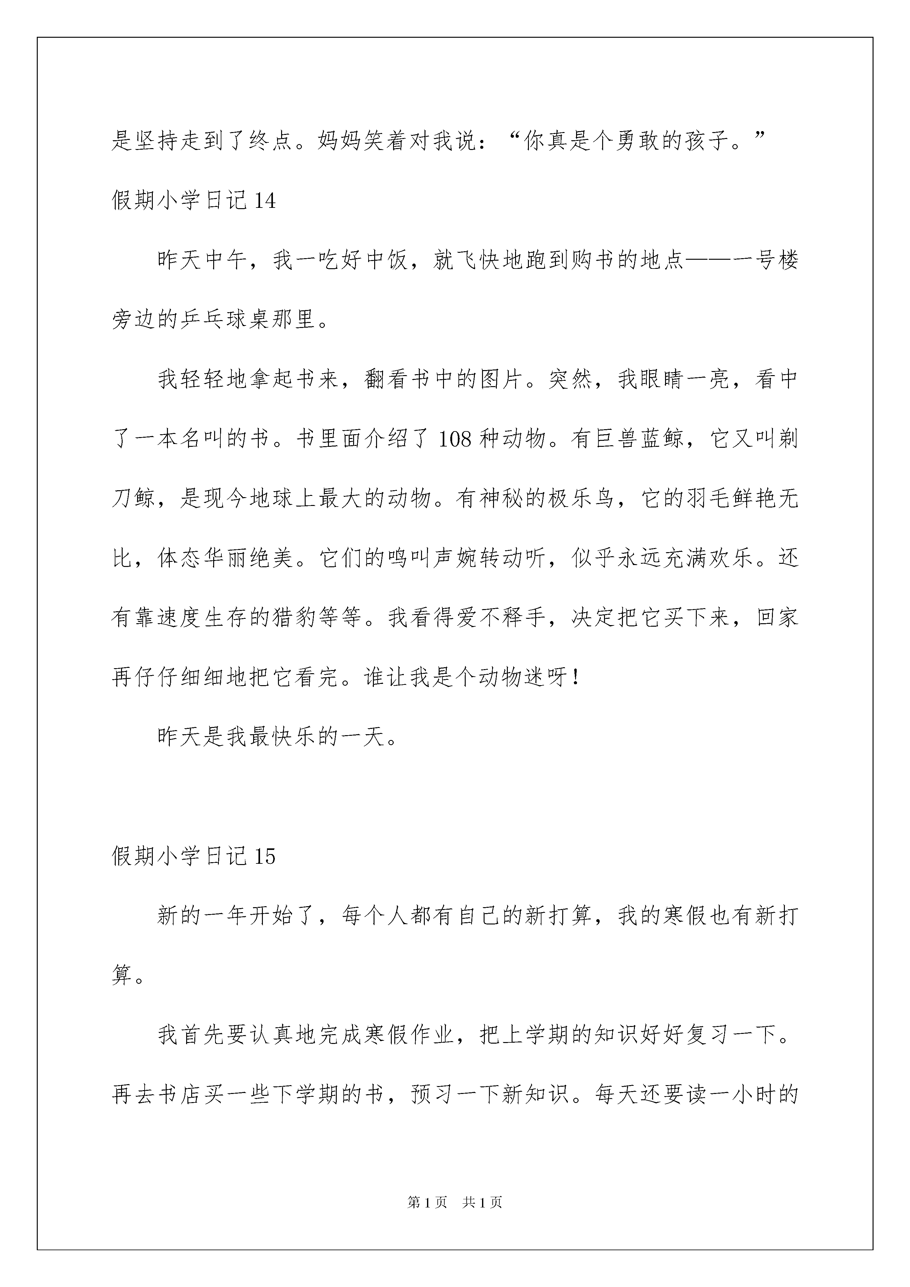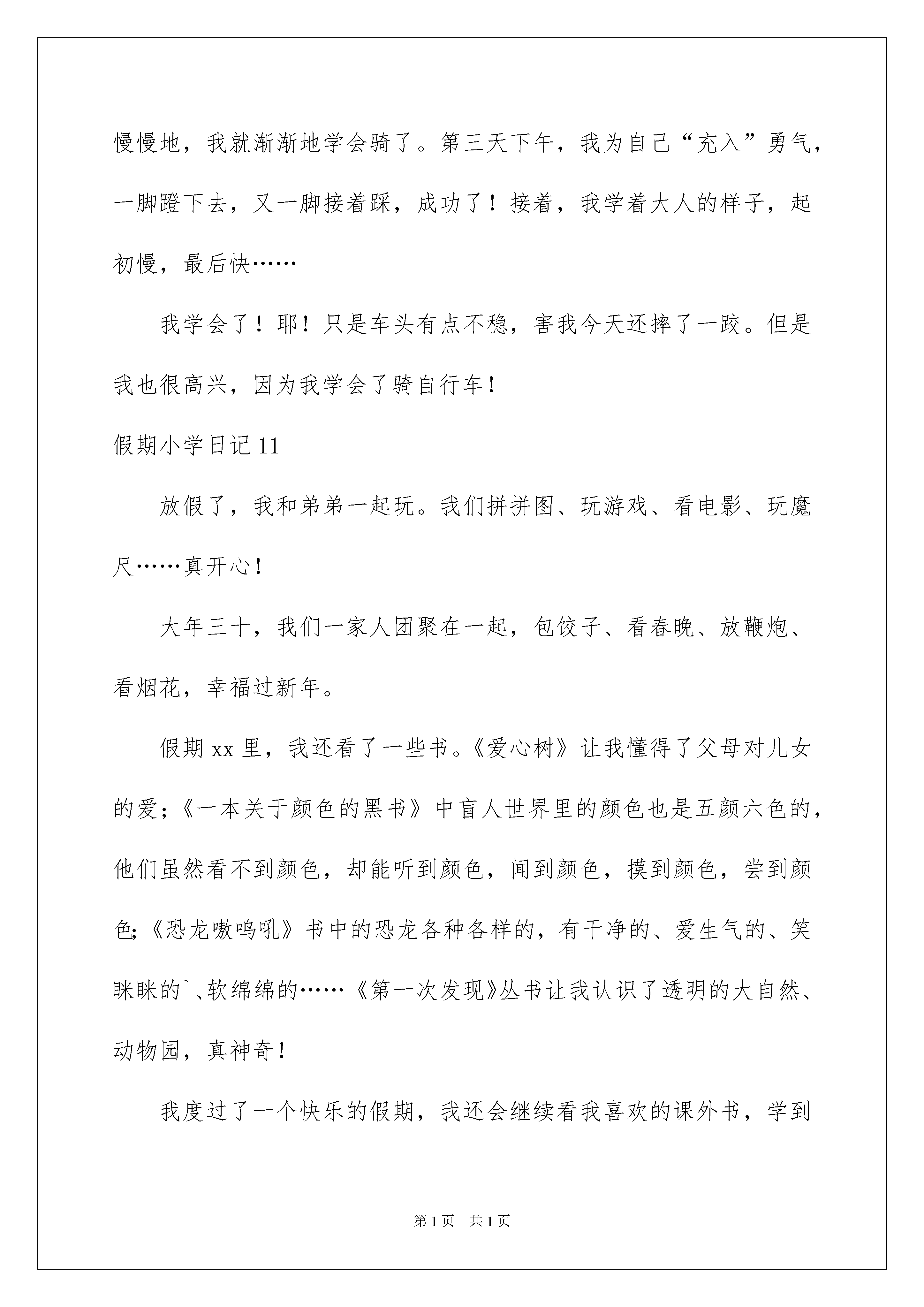 2022假期小学日记假期小学日记忙碌而充实的一天结束了这一天里有没有哪件事或某个人触动到我们呢?是时候抽出时间写写日记了。日记怎么写才合适呢?以下是我整理的假期小学日记希望能够帮助到大家。假期小学日记1今天是放寒假的第十一天为了赶紧做好寒假作业痛痛快快地玩我就去邻居小