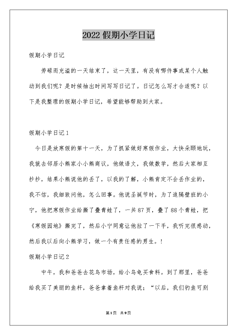 2022假期小学日记假期小学日记劳碌而充溢的一天结束了,这一天里,有没有哪件事或某个人触动到我们呢?是时候抽出时间写写日记了。日记怎么写才合适呢?以下是我整理的假期小学日记,希望能够帮助到大家。假期小学日记1今日是放寒假的第十一天,为了抓紧做好寒假作业,大快朵颐地玩,我就去邻居小熊家小小熊商议,他做语文,我做数学,然后大家相互抄抄,结果小熊说他的丢了,以我的了解,小熊肯定不会丢作业的,我