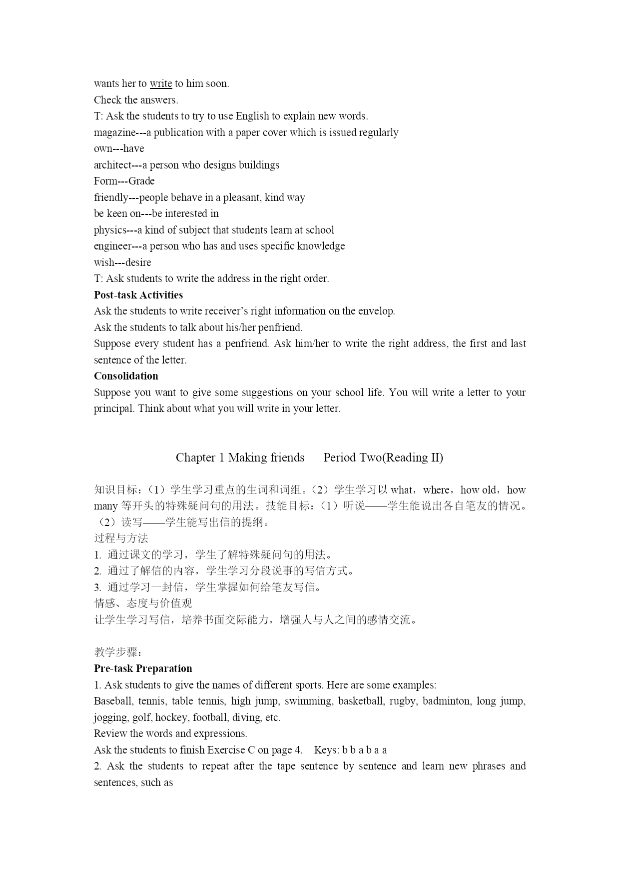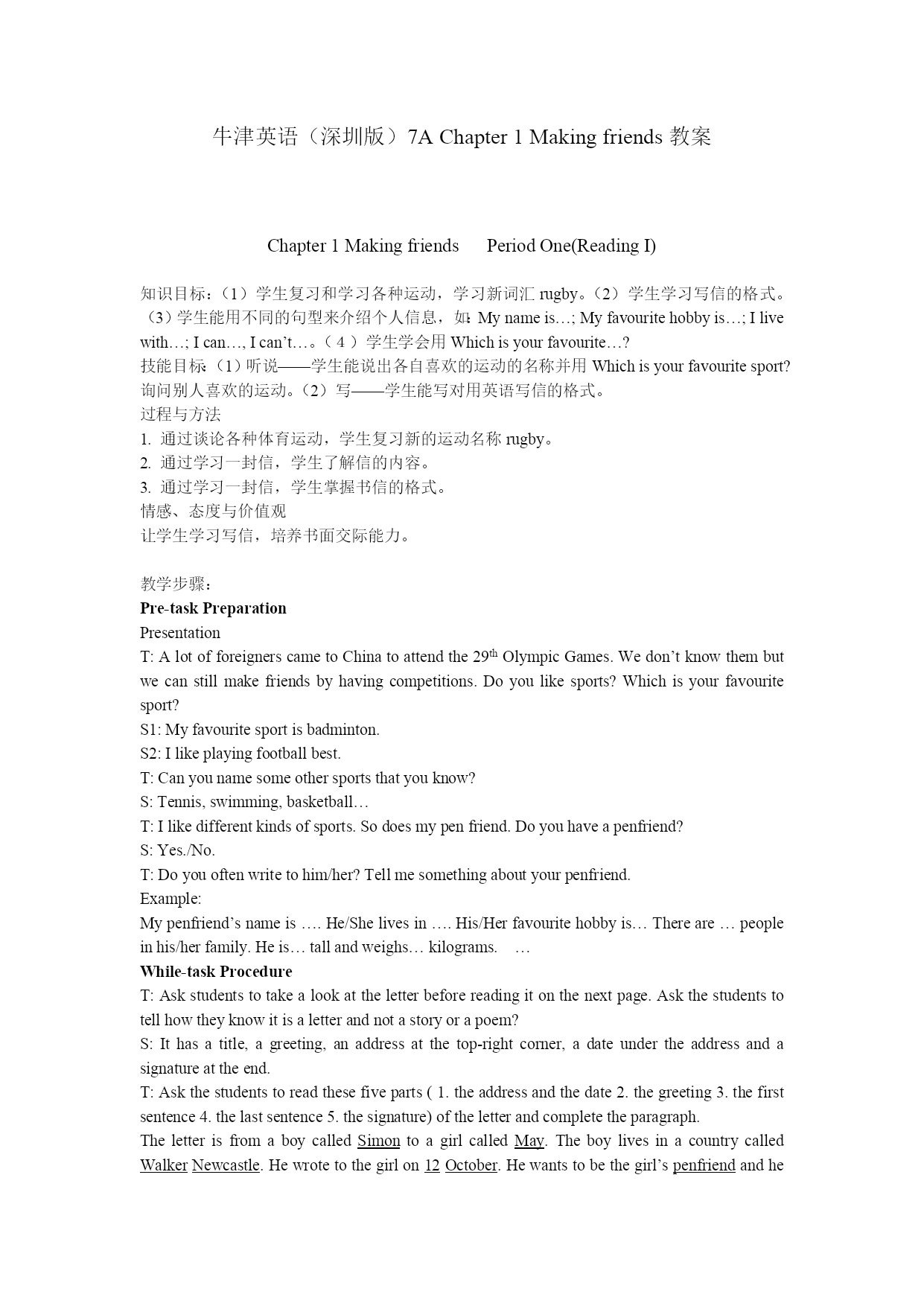 牛津英语(深圳版)7AChapter1Makingfriends教案Chapter1MakingfriendsPeriodOne(ReadingI)知识目标:(1)学生复习和学习各种运动,学习新词汇rugby。(2)学生学习写信的格式。(3)学生能用不同的句型来介绍个人信息,如:Mynameis…;Myfavouritehobbyis…;Ilivewith…;Ican…,Ican’t…。(4)学生学会用Whichisyourfavourite…?技能目标:(1)听说——学生能说出各自喜欢的运动的名称并用W