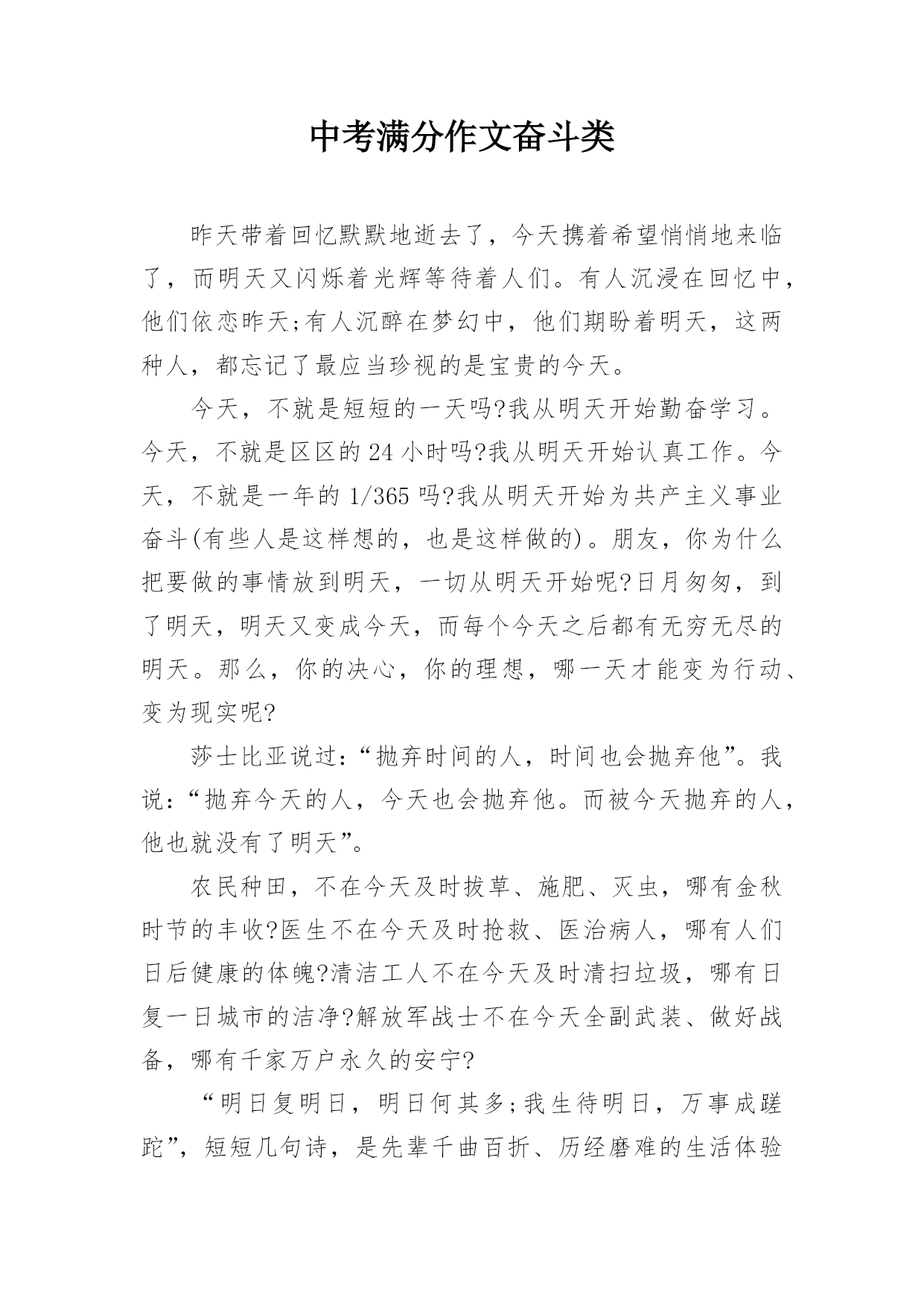 中考满分作文奋斗类昨天带着回忆默默地逝去了,今天携着希望悄悄地来临了,而明天又闪烁着光辉等待着人们。有人沉浸在回忆中,他们依恋昨天;有人沉醉在梦幻中,他们期盼着明天,这两种人,都忘记了最应当珍视的是宝贵的今天。今天,不就是短短的一天吗?我从明天开始勤奋学习。今天,不就是区区的24小时吗?我从明天开始认真工作。今天,不就是一年的1/365吗?我从明天开始为共产主义事业奋斗(有些人是这样想的,也是这样做的)。朋友,你为什么把要做的事情放到明天,一切从明天开始呢?日月匆匆,到了明天,明天又变成今天,而每个今天之