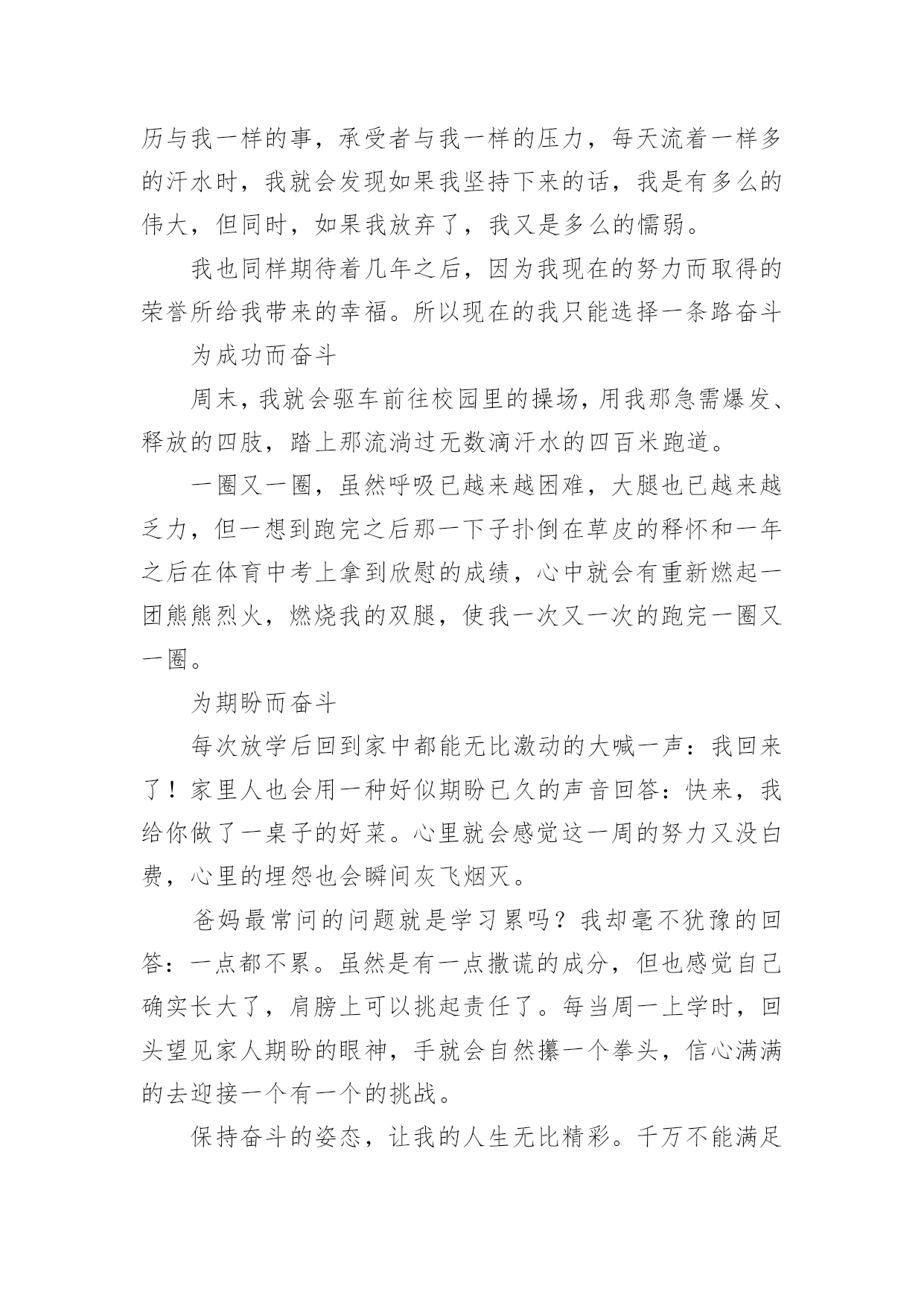 成长奋斗类中考满分作文成长奋斗类中考满分作文范文(精选9篇)在平时的学习、工作或生活中,许多人都有过写作文的经历,对作文都不陌生吧,作文可分为小学作文、中学作文、大学作文(论文)。你所见过的作文是什么样的呢?下面是小编为大家整理的成长奋斗类中考满分作文范文(精选9篇),欢迎阅读,希望大家能够喜欢。成长奋斗类中考满分作文1人的一生离不开奋斗,就像生命离不开水一样。人如果没有了奋斗,就会变得懒惰,不思进取,终一事无成。奋斗是生命?奋斗是历练获得新生,奋斗是在风雨之中怀揣绚丽的彩虹,奋斗是用汗水去浇灌开希望的花