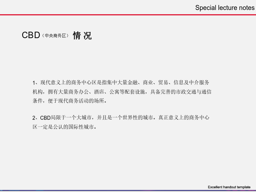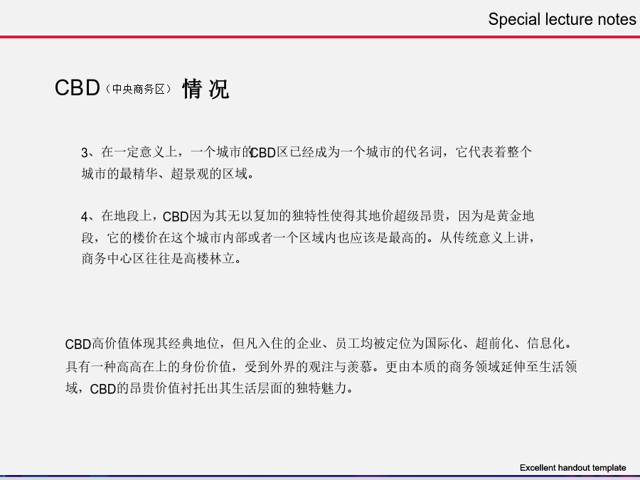 PPT模板下载:www.1ppt.com/moban/市场情况二、深圳CBD座落于中心区内,其发展不但为深圳的商业提供平台更有助于提升深圳在国内外的形象。CBD的规划,为在这里建筑赋予了与生俱来的尊贵血统,注入了国际化和现代化的全新元素其地段与环境都是城市的精华。所它的地段价位的格外的高昂,目前住宅项目出现的数量不多。但随着CBD的发展,必将出现大量与整个CBD相匹配的高品质商业住宅项目。市场情况1、现代意义上的商务中心区是指集中大量金融、商业、贸易、信息及中介服务机构,拥有大量商务办公、酒店、公寓等配套